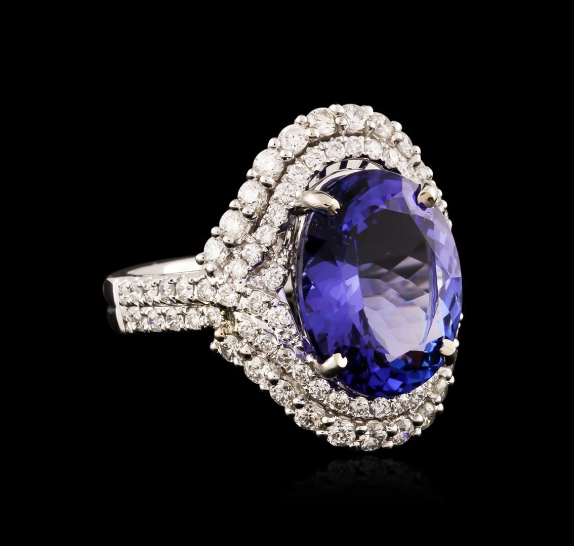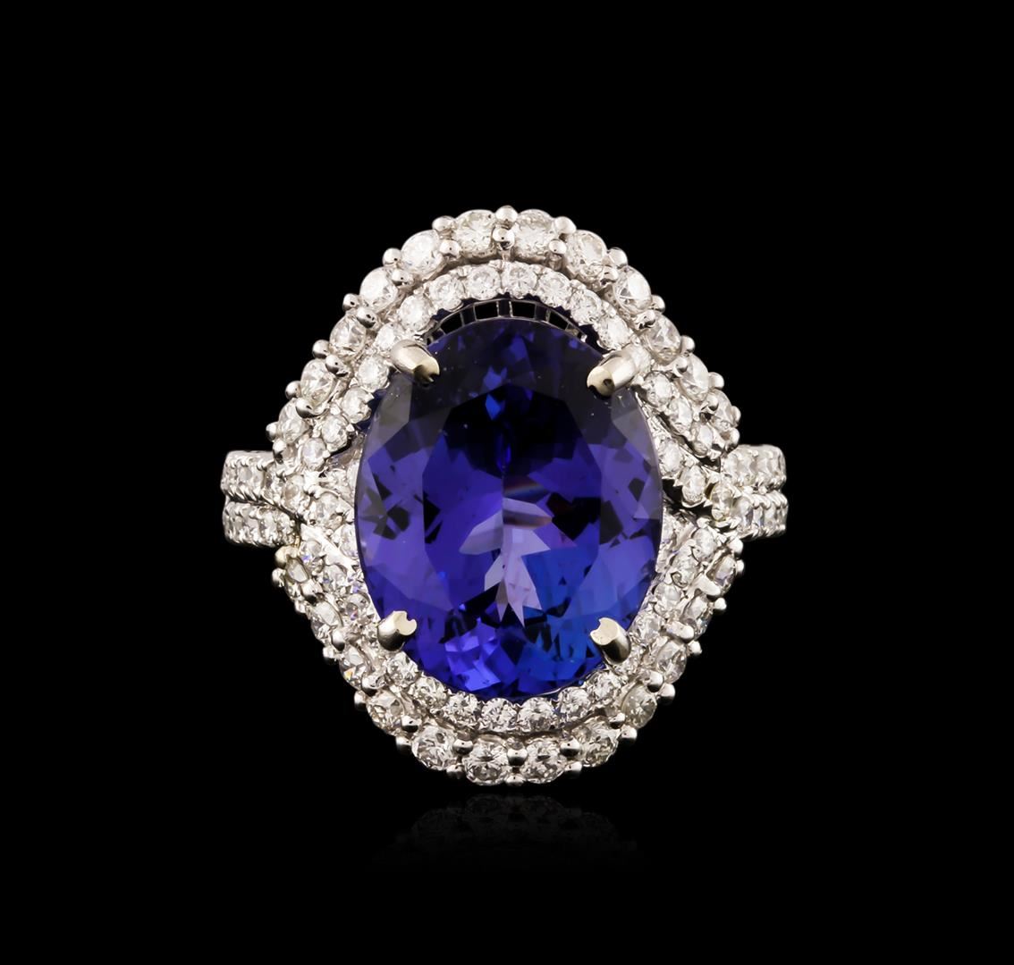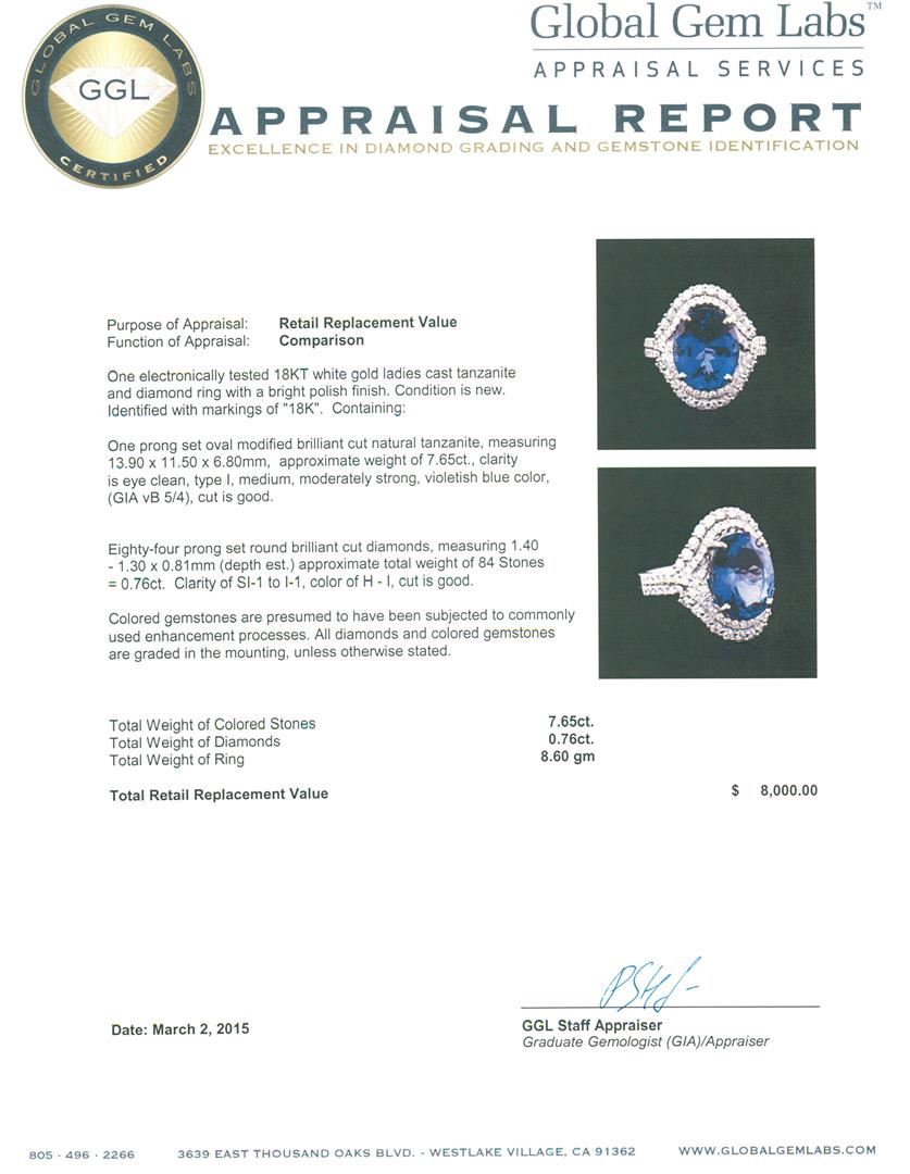 One electronically tested 18KT white gold ladies cast tanzanite and diamond ring with a bright polish finish. Identified with markings of "18K". Condition is new. Containing: One prong set oval modified brilliant cut natural tanzanite, measuring 13.90 x 11.50 x 6.80mm, approximate weight of 7.65ct., clarity is eye clean, type I, medium, moderately strong, violetish blue color, (GIA vB 5/4), cut is good. Eighty-Four prong set round brilliant cut diamonds, measuring 1.40 - 1.30 x 0.81mm (depth est.) approximate total weight of 84 Stones = 0.76ct. Clarity: SI-1 to I-1. Color: H - I, Cut is Good. Colored gemstones are presumed to have been subjected to commonly used enhancement processes. All diamonds and colored gemstones are graded in the mounting, unless otherwise stated. Total Weight of Colored Stones 7.65ct. Total Weight of Diamonds 0.76ct. Total Weight of Ring 8.60 grams. GGL Appraised at $8,000.00.