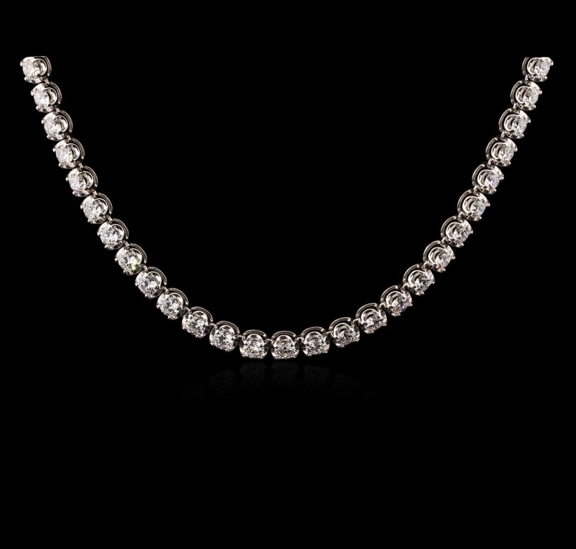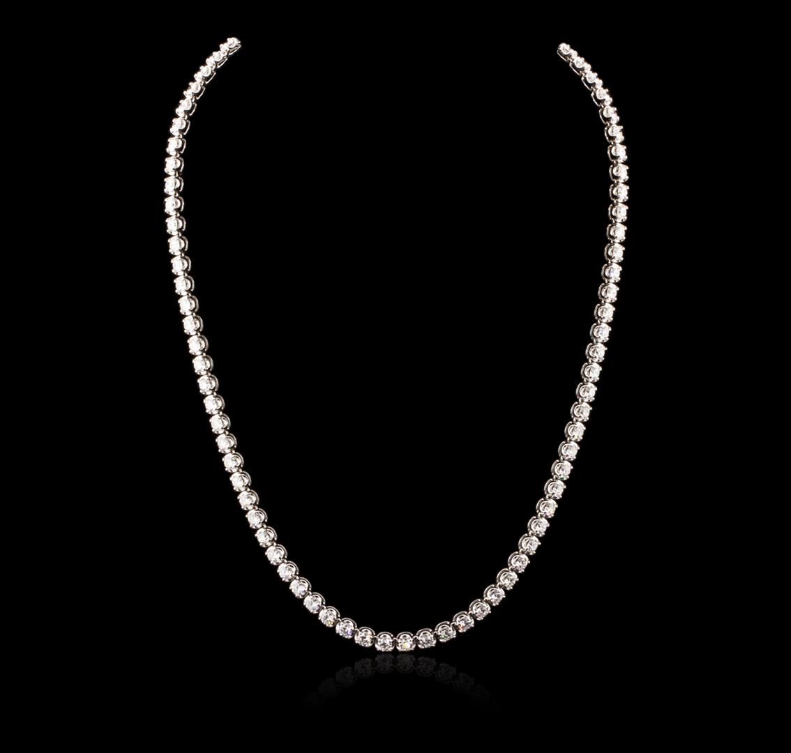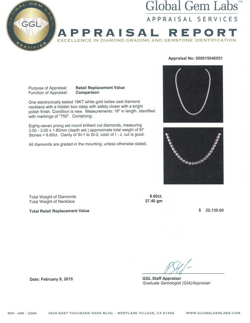 One electronically tested 18KT white gold ladies cast diamond necklace with a hidden box clasp with safety closer with a bright polish finish. Measurements: 16" in length. Identified with markings of "750". Condition is new. Containing: Eighty-Seven prong set round brilliant cut diamonds, measuring 3.00 - 3.00 x 1.80mm (depth est.) approximate total weight of 87 Stones = 8.60ct. Clarity: SI-1 to SI-2. Color: I - J, Cut is Good. All diamonds are graded in the mounting, unless otherwise stated. Total Weight of Diamonds 8.60ct. Total Weight of Necklace 27.40 grams. GGL Appraised at $22,135.00.