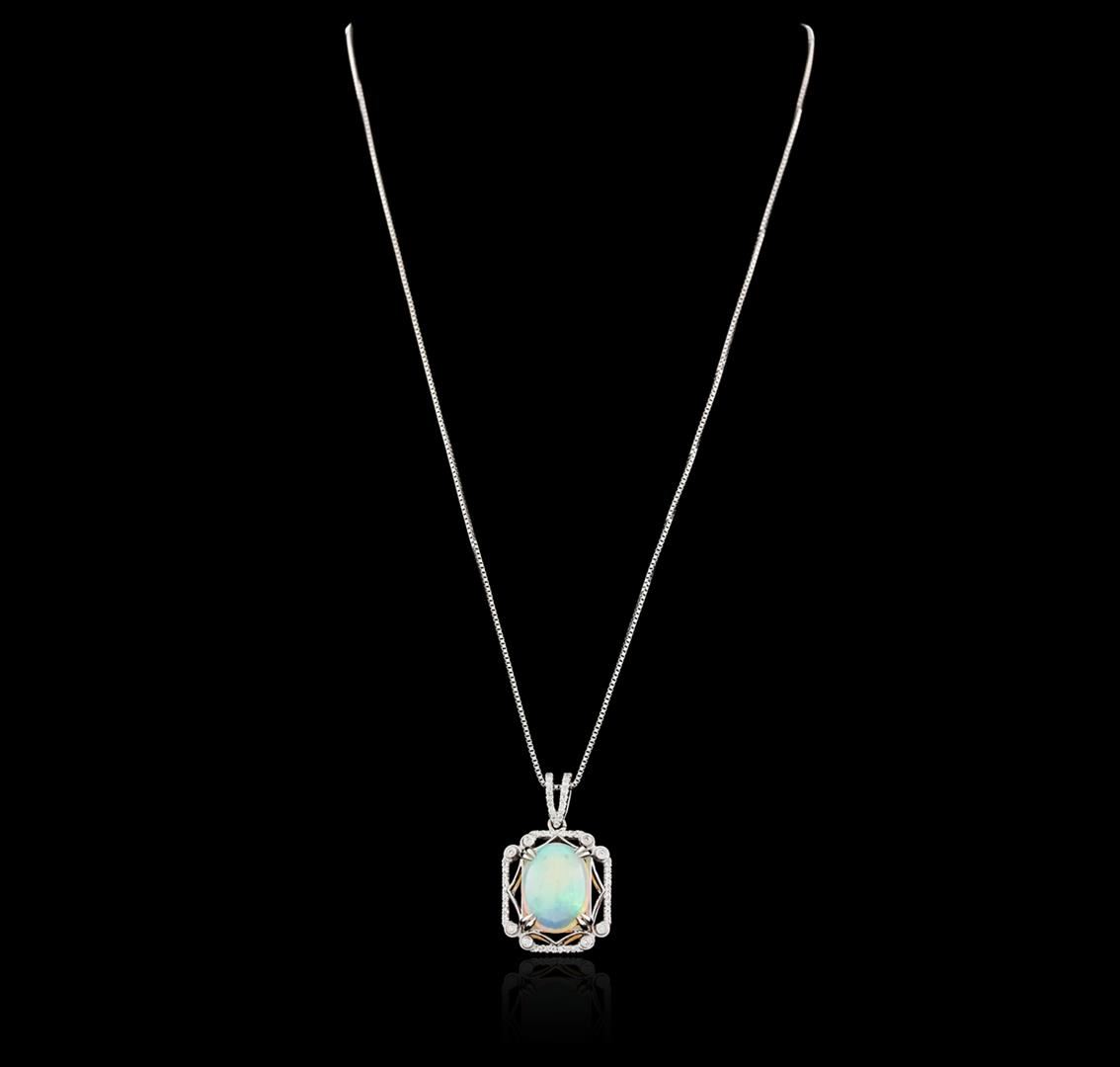 One electronically tested 18KT white gold ladies combination cast & assembled opal and diamond pendant & chain 16.0" long, thin square box link with a lobster claw clasp with a bright polish finish. Identified with markings of "18K 750". Condition is new. Containing: One crystal opal that is cut in a cabochon shaped cabochon and is prong set, measuring 15.04 mm long x 11.41 mm wide, and 8.23 mm thick and the approximate weight is 8.80 carats. The opal has a bright, green-orange play of color (fire) in a flashfire pattern; a high dome; a cut; no inclusions; consistent in its brightness and pattern; and is somewhat directional. Fifty-Five prong set round brilliant cut diamonds, measuring 1.00 - 1.00 x 0.60mm (depth est.) approximate total weight of 55 Stones = 0.20ct. Clarity: SI-2. Color: H - I, Cut is Good. All diamonds and colored gemstones are graded in the mounting, unless otherwise stated. Colored gemstones are presumed to have been subjected to commonly used enhancement processes. Total Weight of Diamonds 0.20ct. Total Weight of Opals 8.80ct. Total Weight of Pendant & Chain 10.50 grams. GGL Appraised at $5,060.00.