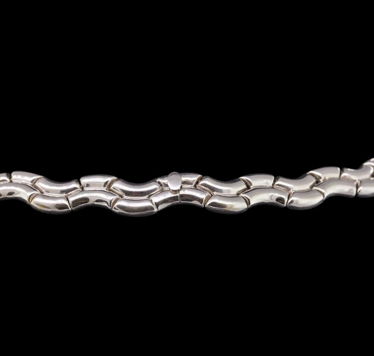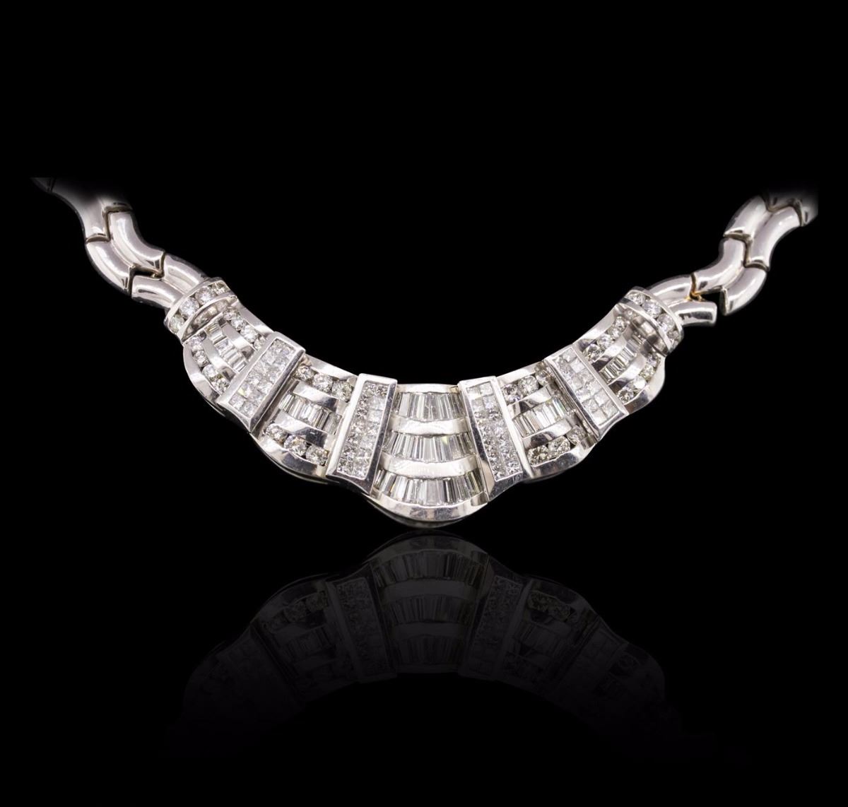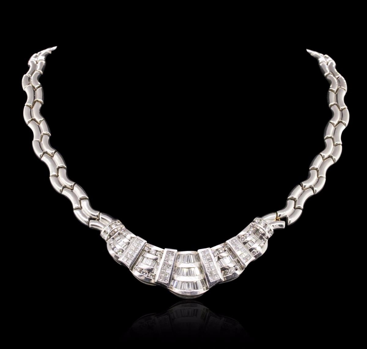One electronically tested 18KT white gold Ladies combination cast & assembled necklace with a hidden box clasp with a bright polish finish. Condition is new. Measurements: 14" in length. Identified with markings of "750". Containing: Forty channel set baguette cut (tapered) diamonds, measuring from 2.00 x 1.50 x 1.28mm (depth est.) to 3.70 x 2.20 x 1.87mm (depth est.) approximate. Total Weight of 40 Stones = 3.04ct. Clarity: VS-2. Color: J, Cut is Good. Thirty-Six channel set round brilliant cut diamonds, measuring 3.30 - 2.50 x 1.74mm (depth est.) approximate. Total Weight of 36 Stones = 3.21ct. Clarity: VS-2 to SI-2. Color: I - J, Cut is Good. Fifty-Two invisible set princess cut diamonds, measuring 2.00 x 2.00 x 1.50mm (depth est.) approximate. Total Weight of 52 Stones = 2.56ct. Clarity: SI-1 to SI-2. Color: I - J, Cut is Good. Total Weight of Diamonds 8.81ct. Total Weight of Necklace 96.50 grams. GGL Appraised at $58,115.00.
