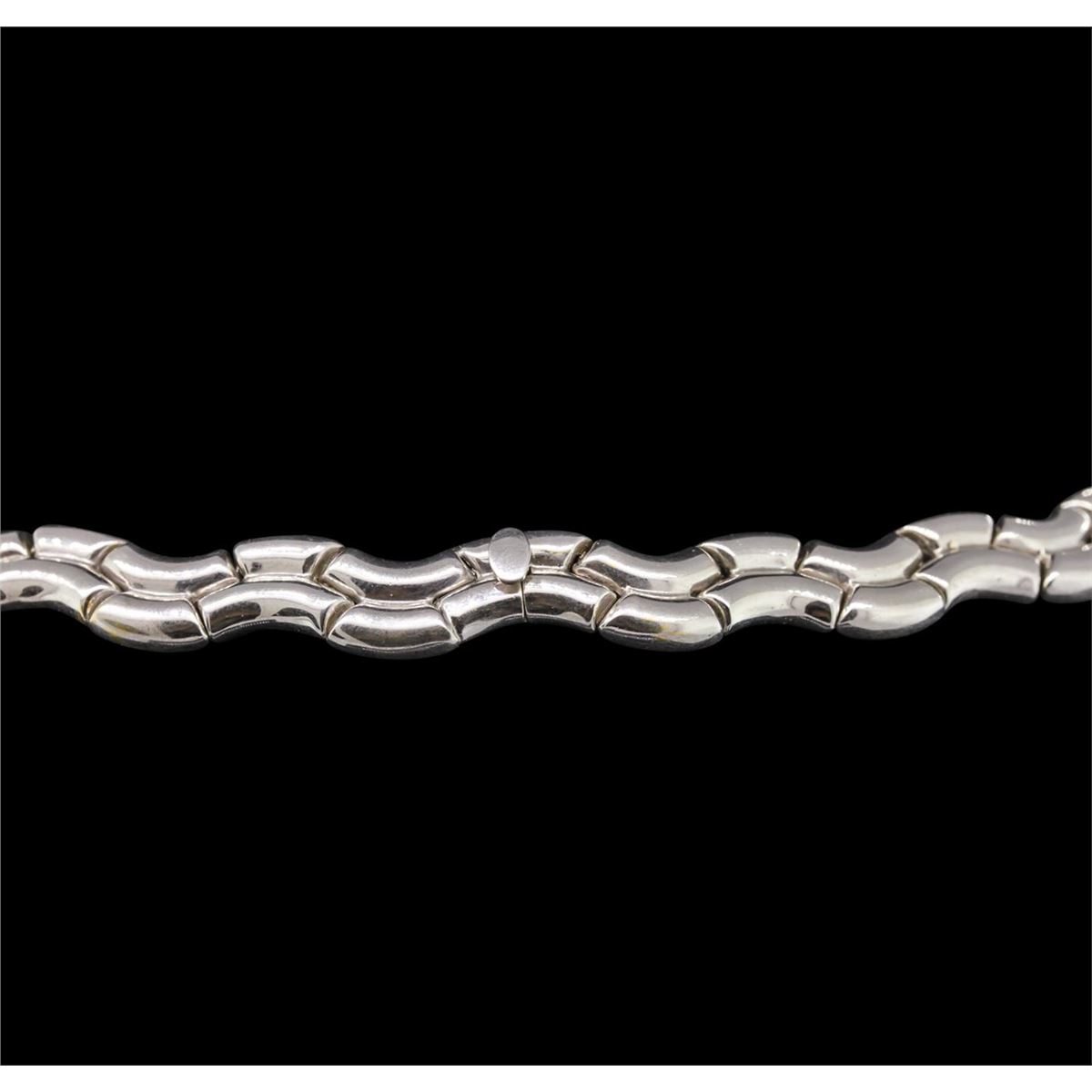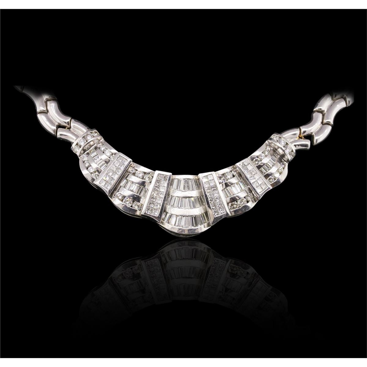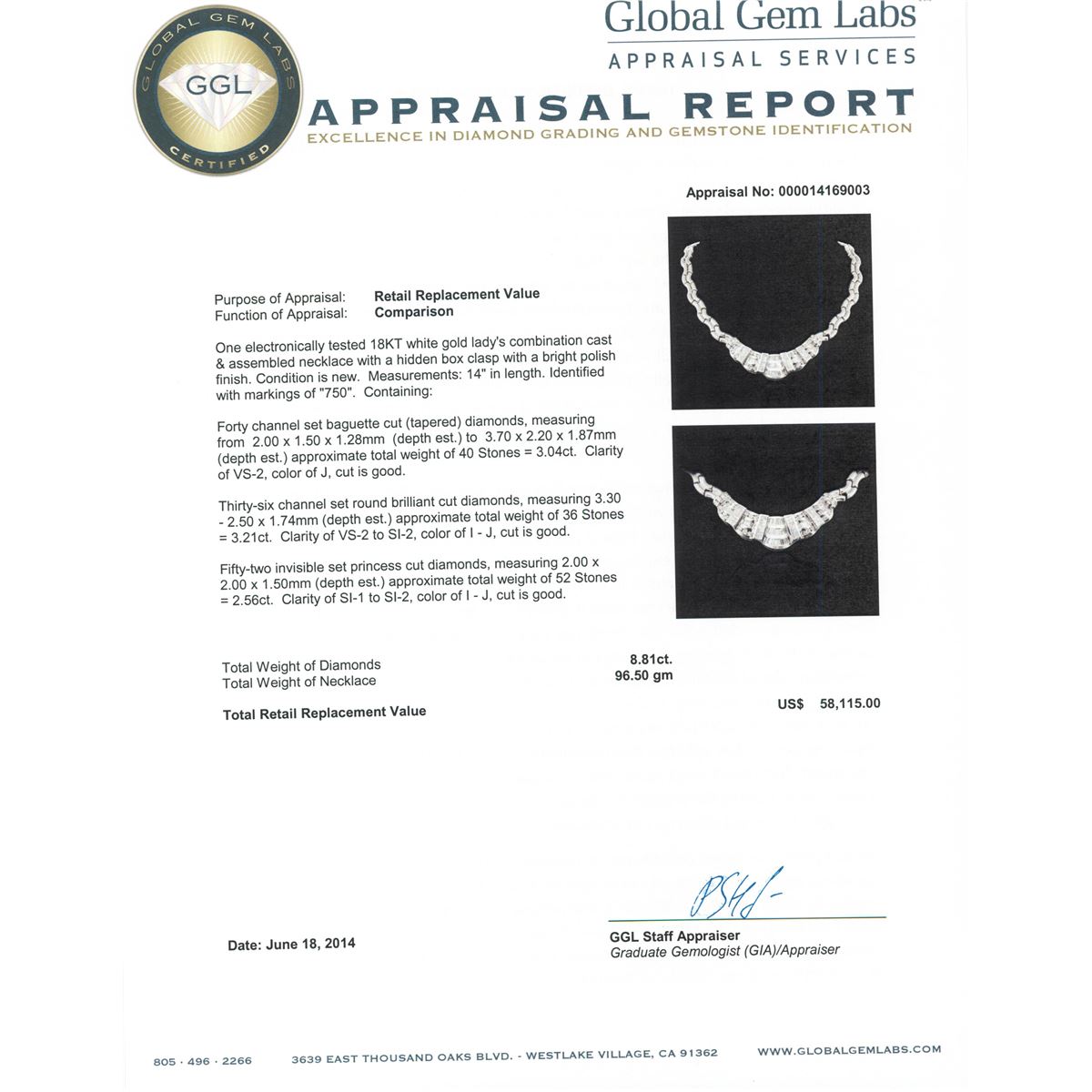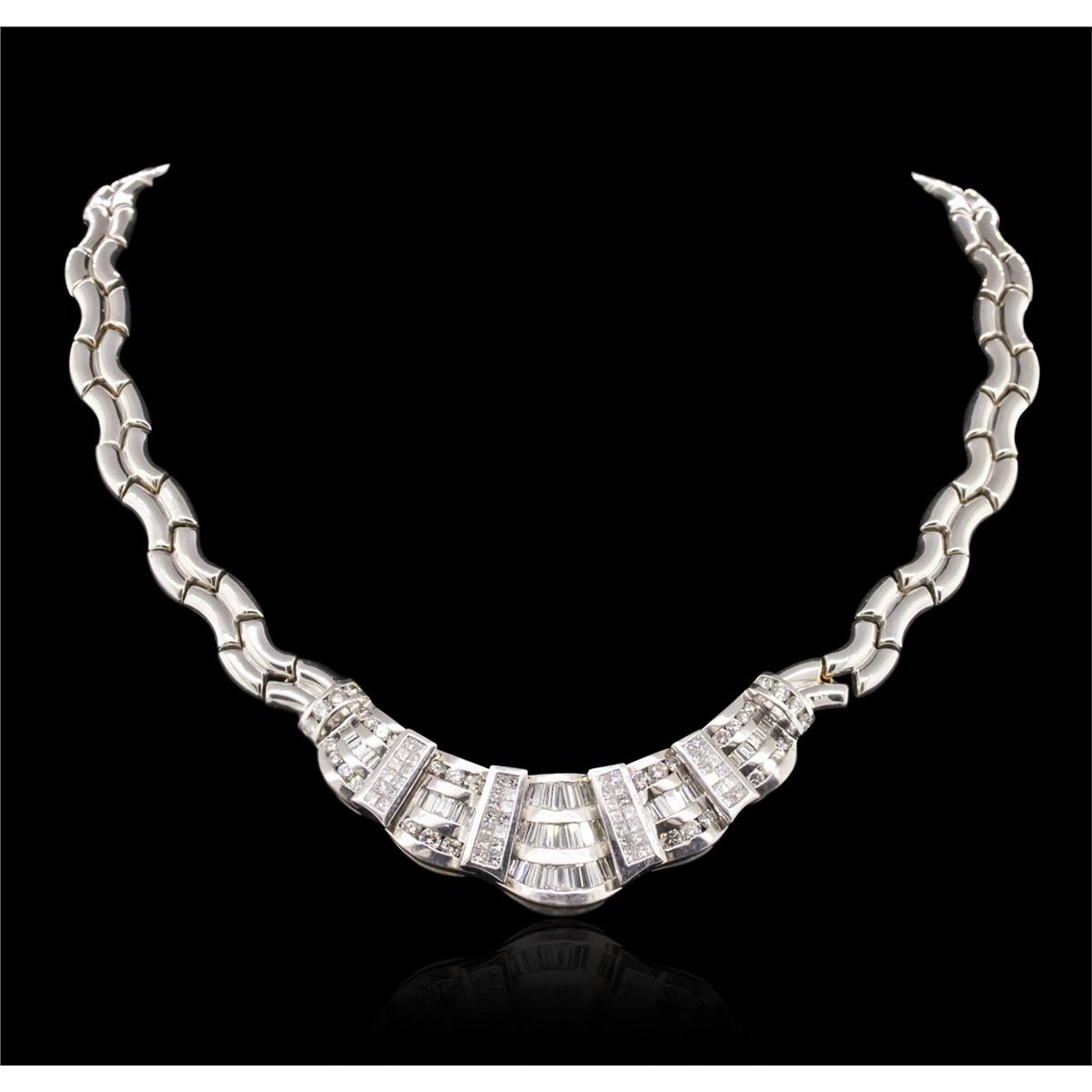 One electronically tested 18KT white gold Ladies combination cast & assembled necklace with a hidden box clasp with a bright polish finish. Condition is new. Measurements: 14" in length. Identified with markings of "750". Containing: Forty channel set baguette cut (tapered) diamonds, measuring from 2.00 x 1.50 x 1.28mm (depth est.) to 3.70 x 2.20 x 1.87mm (depth est.) approximate. Total Weight of 40 Stones = 3.04ct. Clarity: VS-2. Color: J, Cut is Good. Thirty-Six channel set round brilliant cut diamonds, measuring 3.30 - 2.50 x 1.74mm (depth est.) approximate. Total Weight of 36 Stones = 3.21ct. Clarity: VS-2 to SI-2. Color: I - J, Cut is Good. Fifty-Two invisible set princess cut diamonds, measuring 2.00 x 2.00 x 1.50mm (depth est.) approximate. Total Weight of 52 Stones = 2.56ct. Clarity: SI-1 to SI-2. Color: I - J, Cut is Good. Total Weight of Diamonds 8.81ct. Total Weight of Necklace 96.50 grams. GGL Appraised at $58,115.00.