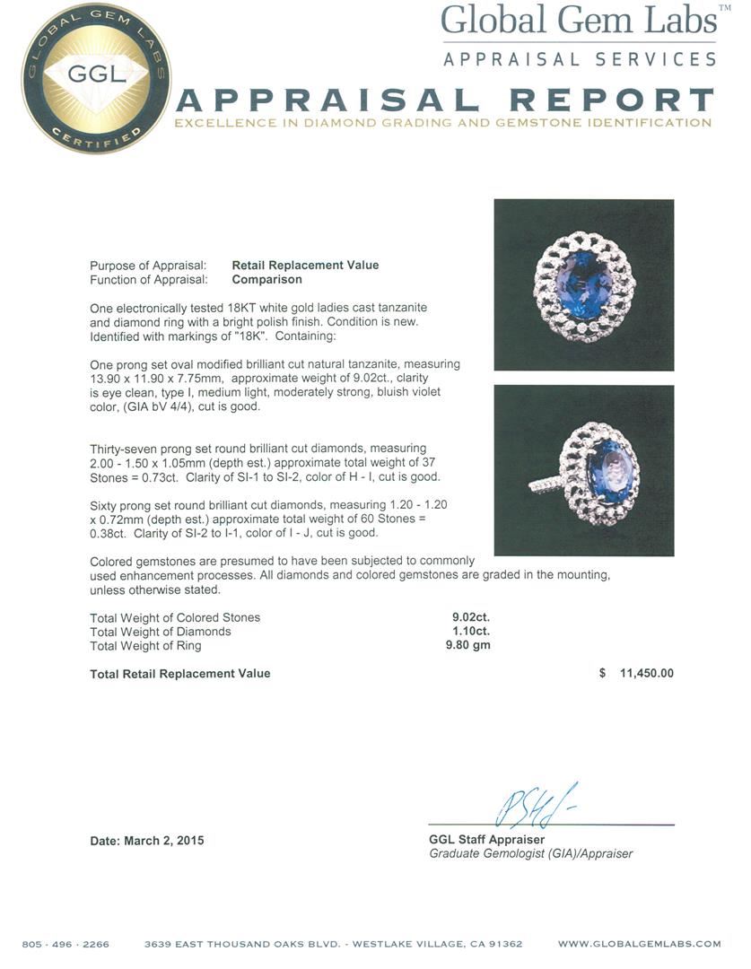 One electronically tested 18KT white gold ladies cast tanzanite and diamond ring with a bright polish finish. Identified with markings of "18K". Condition is new. Containing: One prong set oval modified brilliant cut natural tanzanite, measuring 13.90 x 11.90 x 7.75mm, approximate weight of 9.02ct., clarity is eye clean, type I, medium light, moderately strong, bluish violet color, (GIA bV 4/4), cut is good. Thirty-Seven prong set round brilliant cut diamonds, measuring 2.00 - 1.50 x 1.05mm (depth est.) approximate total weight of 37 Stones = 0.73ct. Clarity: SI-1 to SI-2. Color: H - I, Cut is Good. Sixty prong set round brilliant cut diamonds, measuring 1.20 - 1.20 x 0.72mm (depth est.) approximate total weight of 60 Stones = 0.38ct. Clarity: SI-2 to I-1. Color: I - J, Cut is Good. Colored gemstones are presumed to have been subjected to commonly used enhancement processes. All diamonds and colored gemstones are graded in the mounting, unless otherwise stated. Total Weight of Colored Stones 9.02ct. Total Weight of Diamonds 1.10ct. Total Weight of Ring 9.80 grams. GGL Appraised at $11,450.00.
