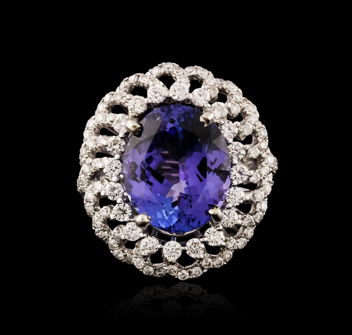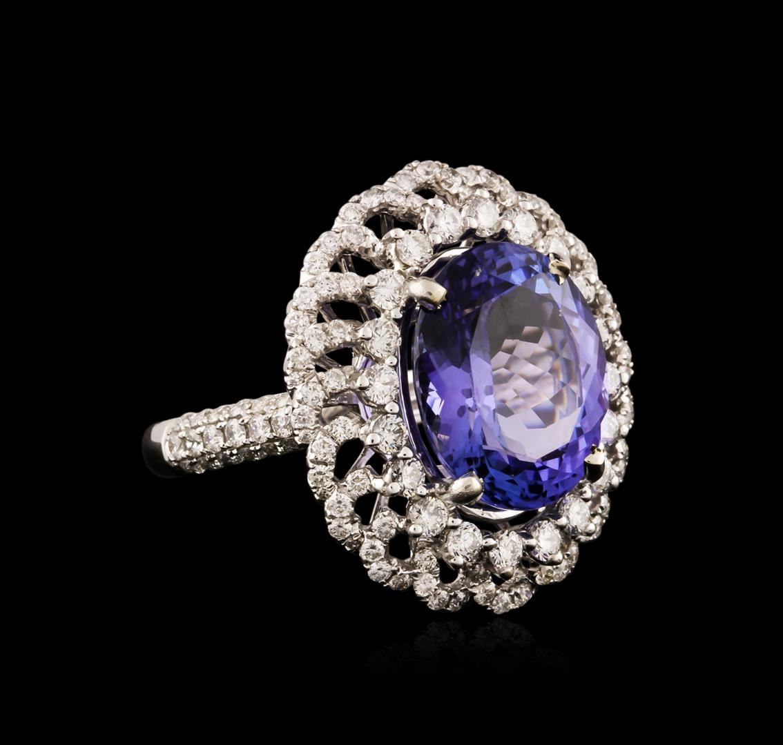 One electronically tested 18KT white gold ladies cast tanzanite and diamond ring with a bright polish finish. Identified with markings of "18K". Condition is new. Containing: One prong set oval modified brilliant cut natural tanzanite, measuring 13.90 x 11.90 x 7.75mm, approximate weight of 9.02ct., clarity is eye clean, type I, medium light, moderately strong, bluish violet color, (GIA bV 4/4), cut is good. Thirty-Seven prong set round brilliant cut diamonds, measuring 2.00 - 1.50 x 1.05mm (depth est.) approximate total weight of 37 Stones = 0.73ct. Clarity: SI-1 to SI-2. Color: H - I, Cut is Good. Sixty prong set round brilliant cut diamonds, measuring 1.20 - 1.20 x 0.72mm (depth est.) approximate total weight of 60 Stones = 0.38ct. Clarity: SI-2 to I-1. Color: I - J, Cut is Good. Colored gemstones are presumed to have been subjected to commonly used enhancement processes. All diamonds and colored gemstones are graded in the mounting, unless otherwise stated. Total Weight of Colored Stones 9.02ct. Total Weight of Diamonds 1.10ct. Total Weight of Ring 9.80 grams. GGL Appraised at $11,450.00.