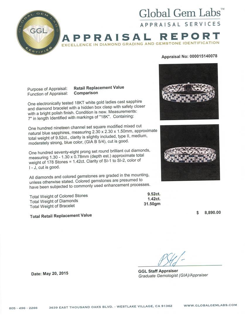 One electronically tested 18KT white gold ladies cast sapphire and diamond bracelet with a hidden box clasp with safety closer with a bright polish finish. Measurements: 7" in length Identified with markings of "18K". Condition is new. Containing: One hundred nineteen channel set square modified mixed cut natural blue sapphires, measuring 2.30 x 2.30 x 1.50mm, approximate total weight of 9.52ct., clarity is slightly included, type II, medium, moderately strong, blue color, (GIA B 5/4), cut is good. One Hundred Seventy-Eight prong set round brilliant cut diamonds, measuring 1.30 - 1.30 x 0.78mm (depth est.) approximate total weight of 178 Stones = 1.42ct. Clarity: SI-1 to SI-2. Color: I - J, Cut is Good. All diamonds and colored gemstones are graded in the mounting, unless otherwise stated. Colored gemstones are presumed to have been subjected to commonly used enhancement processes. Total Weight of Colored Stones 9.52ct. Total Weight of Diamonds 1.42ct. Total Weight of Bracelet 31.50 grams. GGL Appraised at $8,890.00.