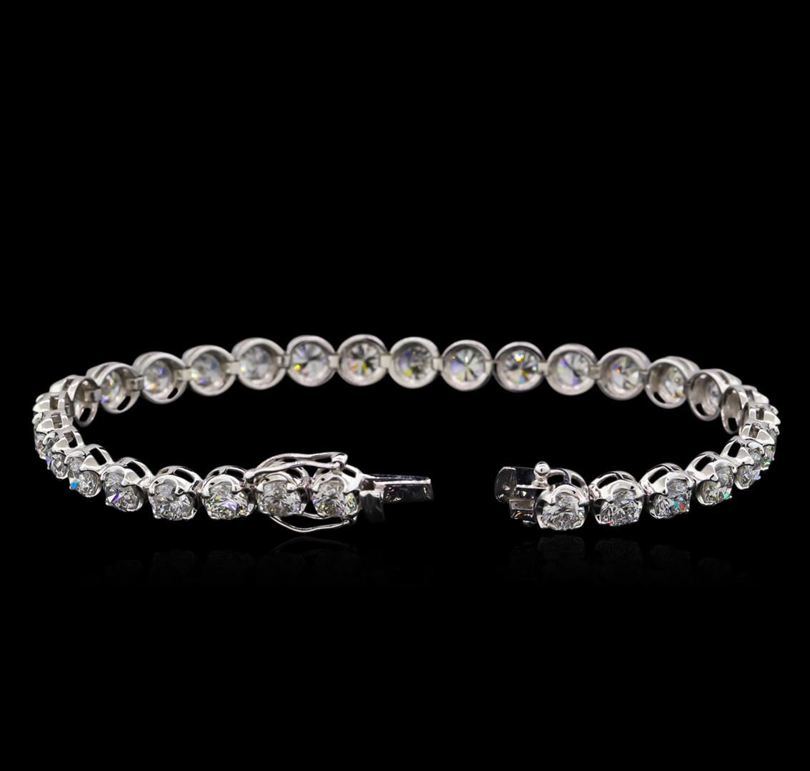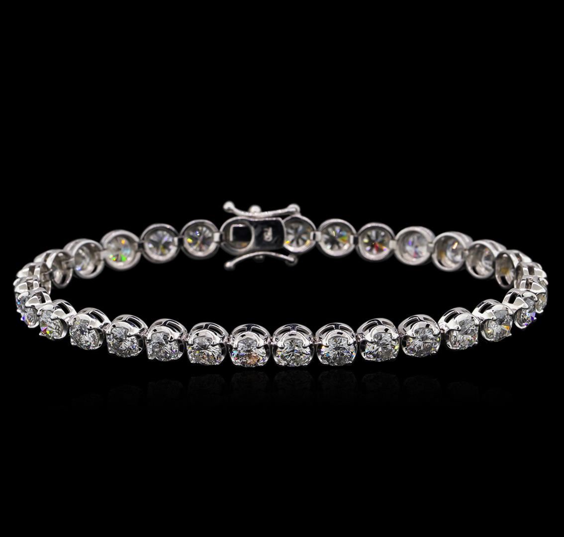 One electronically tested 18KT white gold ladies cast diamond tennis bracelet with a hidden box clasp with safety closer with a bright polish finish. Measurements: 7" in length Identified with markings of "750". Condition is new. Containing: Thirty-One prong set round brilliant cut diamonds, measuring 4.40 - 4.40 x 2.64mm (depth est.) approximate total weight of 31 Stones = 9.66ct. Clarity: SI-2 to I-2. Color: H - I, Cut is Good. All diamonds are graded in the mounting, unless otherwise stated. Total Weight of Diamonds 9.66ct. Total Weight of Tennis Bracelet 14.10 grams. GGL Appraised at $25,280.00.