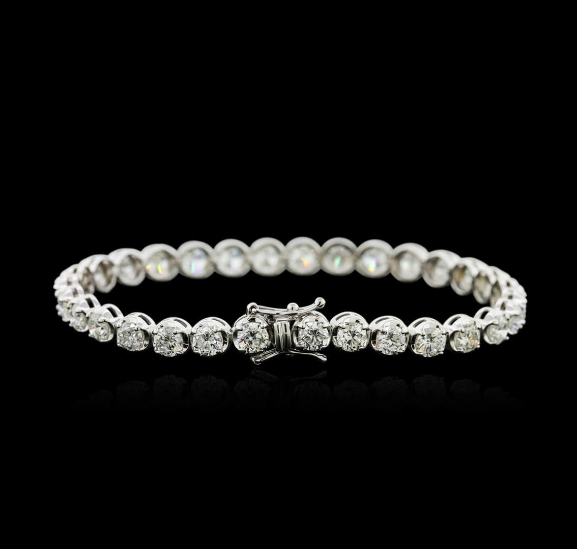 One electronically tested 18KT white gold ladies cast diamond tennis bracelet with a hidden box clasp with safety closer with a bright polish finish. Measurements: 7" in length Identified with markings of "750". Condition is new. Containing: Thirty-One prong set round brilliant cut diamonds, measuring 4.40 - 4.40 x 2.64mm (depth est.) approximate total weight of 31 Stones = 9.66ct. Clarity: SI-2 to I-1. Color: H - I, Cut is Good. All diamonds are graded in the mounting, unless otherwise stated. Total Weight of Diamonds 9.66ct. Total Weight of Tennis Bracelet 14.20 grams. GGL Appraised at $25,210.00.