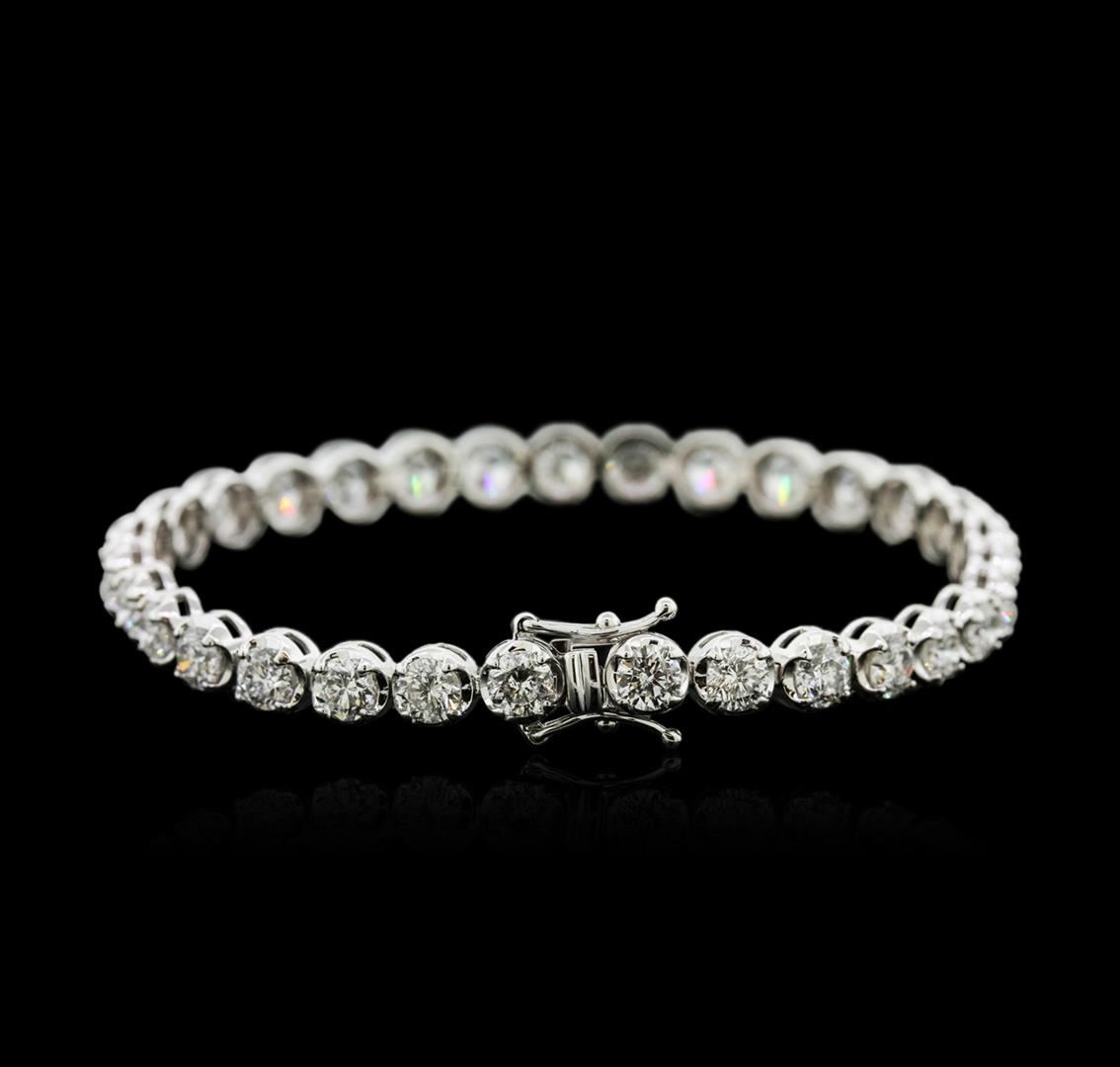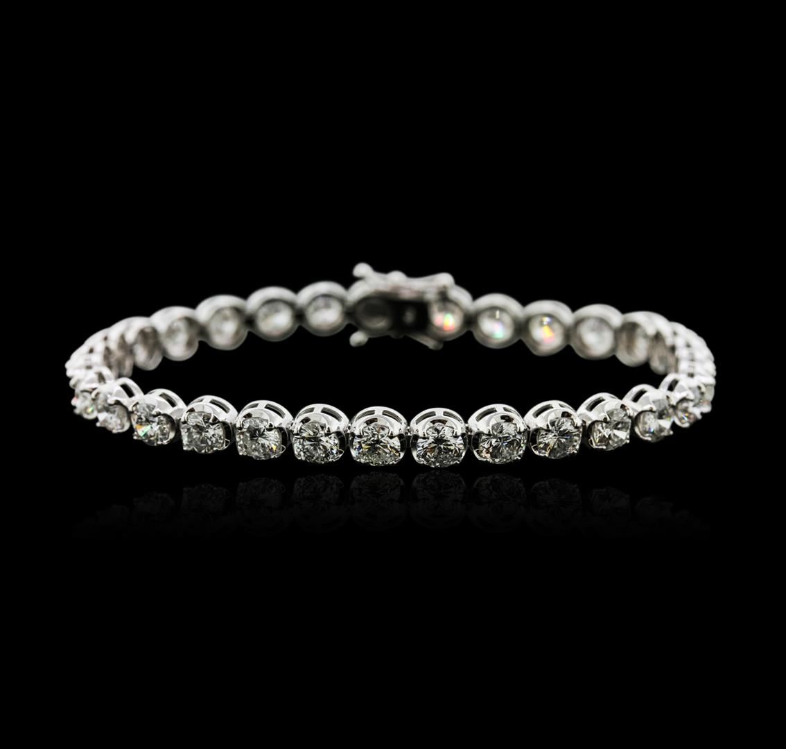 One electronically tested 18KT white gold ladies cast diamond tennis bracelet with a hidden box clasp with safety closer with a bright polish finish. Measurements: 7" in length Identified with markings of "750". Condition is new. Containing: Thirty-One prong set round brilliant cut diamonds, measuring 4.40 - 4.40 x 2.64mm (depth est.) approximate total weight of 31 Stones = 9.66ct. Clarity: SI-2 to I-2. Color: H - I, Cut is Good. All diamonds are graded in the mounting, unless otherwise stated. Total Weight of Diamonds 9.66ct. Total Weight of Tennis Bracelet 14.10 grams. GGL Appraised at $25,280.00.