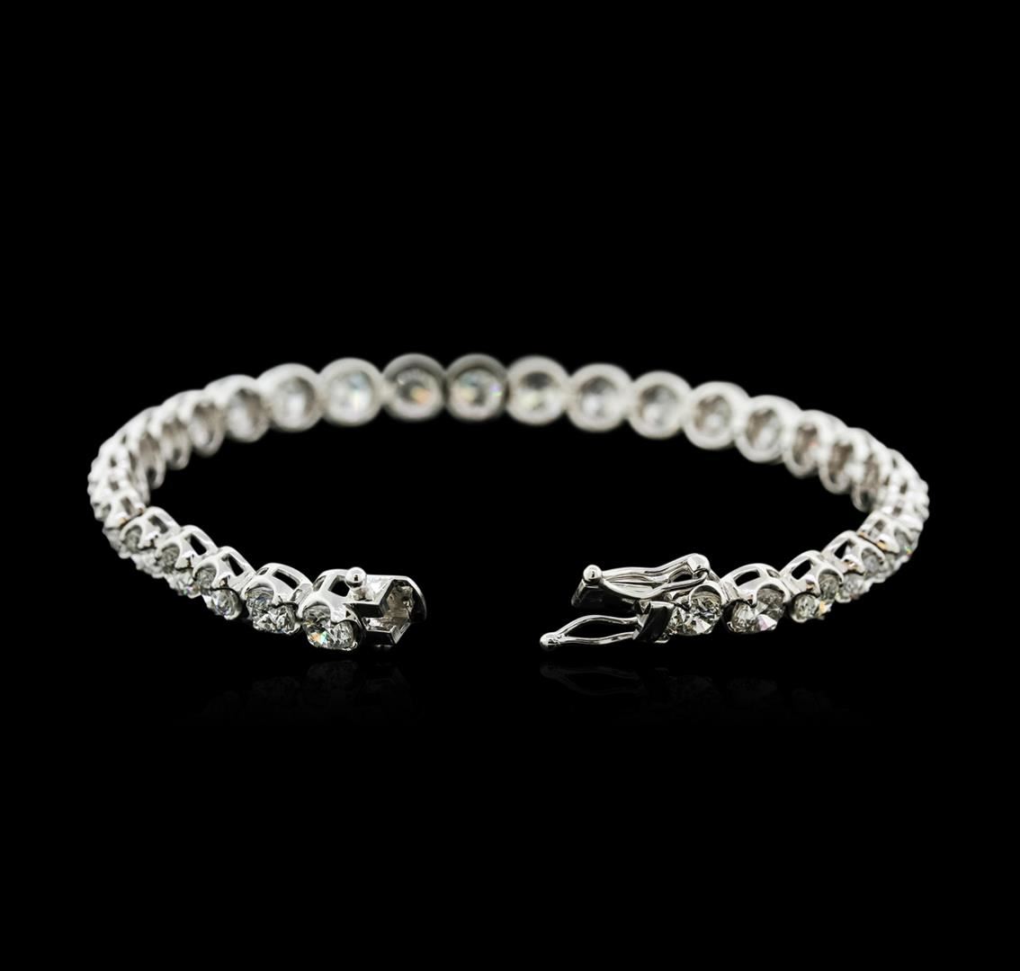 One electronically tested 18KT white gold ladies cast diamond tennis bracelet with a hidden box clasp with safety closer with a bright polish finish. Measurements: 7" in length Identified with markings of "750". Condition is new. Containing: Thirty-One prong set round brilliant cut diamonds, measuring 4.40 - 4.40 x 2.64mm (depth est.) approximate total weight of 31 Stones = 9.66ct. Clarity: SI-2 to I-2. Color: H - I, Cut is Good. All diamonds are graded in the mounting, unless otherwise stated. Total Weight of Diamonds 9.66ct. Total Weight of Tennis Bracelet 14.10 grams. GGL Appraised at $25,280.00.