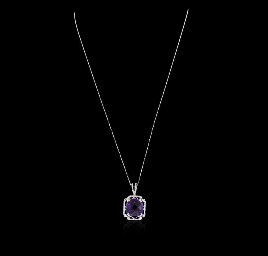 One pendant with chain featuring: 18KT white gold weighing 7.2 grams containing one cushion cut amethyst center weighing 9.79ct and round cut diamonds weighing a total of 0.28ct.