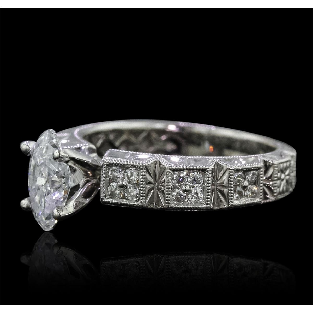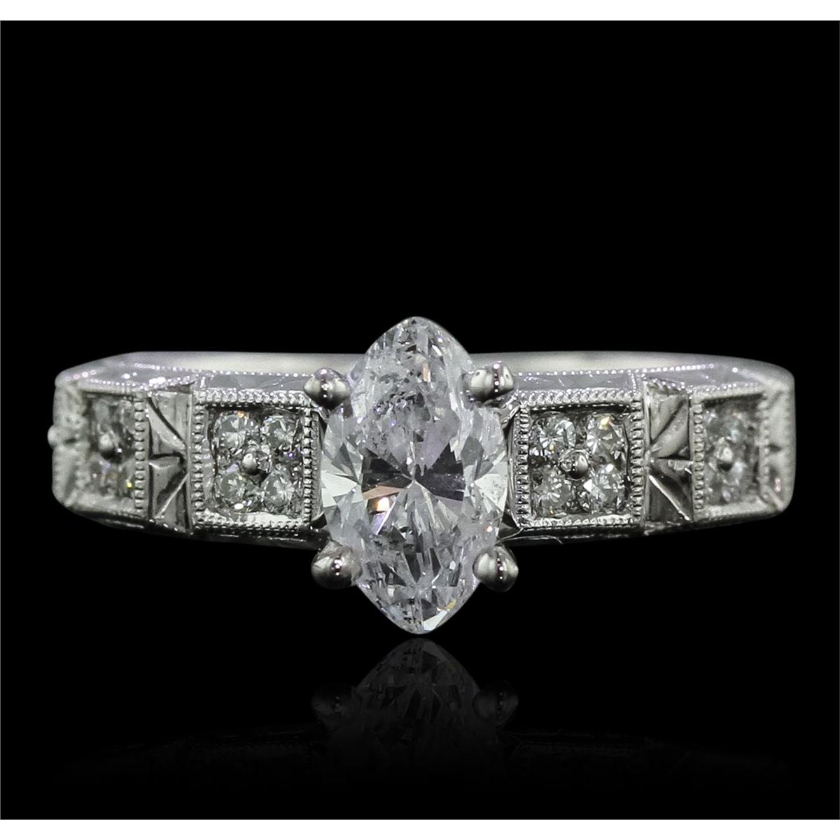 One electronically tested 18KT white gold ladies cast diamond unity ring. Condition is new, good workmanship. The featured diamond is supported by diamond set shoulders and completed by a three and one-half millimeter wide band. Bright and patterned finish with milgrain detailing throughout. Identified with markings of "18K". Containing: One prong set marquise shaped cut diamond, measuring 8.71 x 5.11 x 3.69mm exact weight 1.00ct with a faint blue fluorescence. Graded loose prior to setting in the EGL Laboratory Report # US 910987904D. Clarity: SI-2. Color: Depth 72.2%. Table 56.7%. Pavil. Depth%. 49.7%. Crown Angle 37.7 Degrees Twenty-Four channel set round brilliant cut diamonds, measuring 1.50 - 1.40 x 0.87mm (depth est.) approximate. Total Weight of 24 Stones = 0.32ct. Graded in the setting. Clarity: SI-1 to I-1. Color: F - H. Total Weight of Diamonds 1.32ct. Total Weight of Ring 5.80 grams. AIG Appraised at $24,215.00.