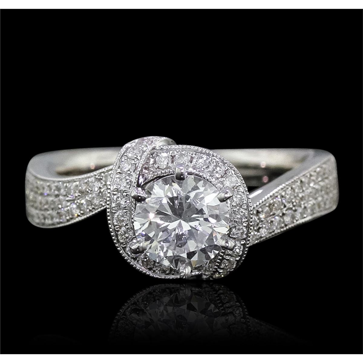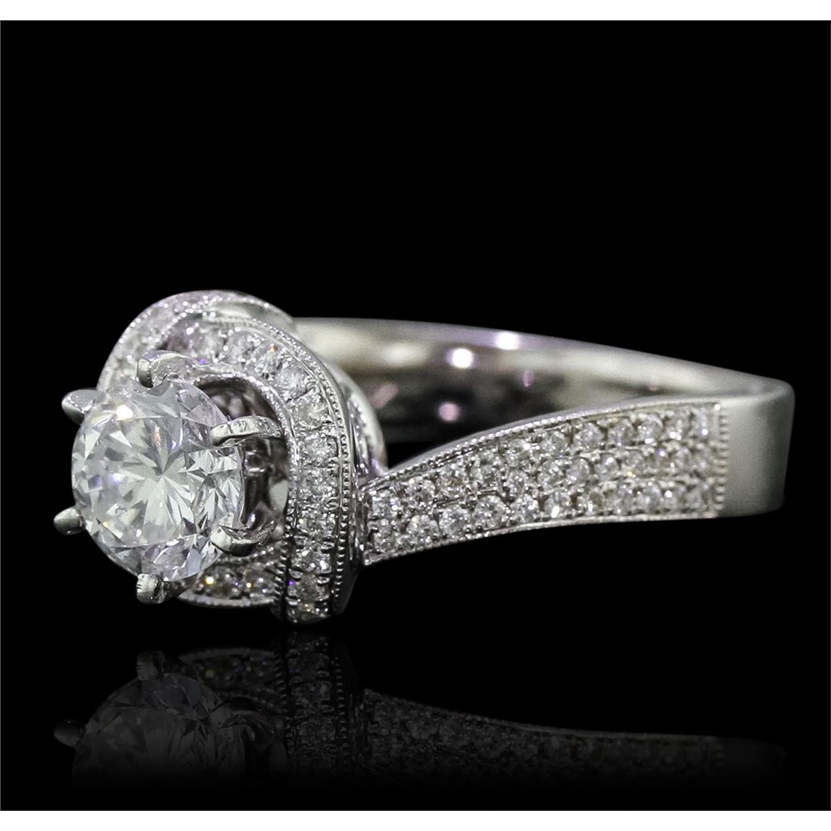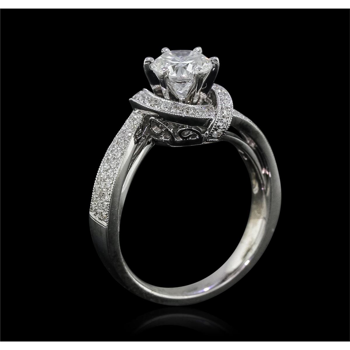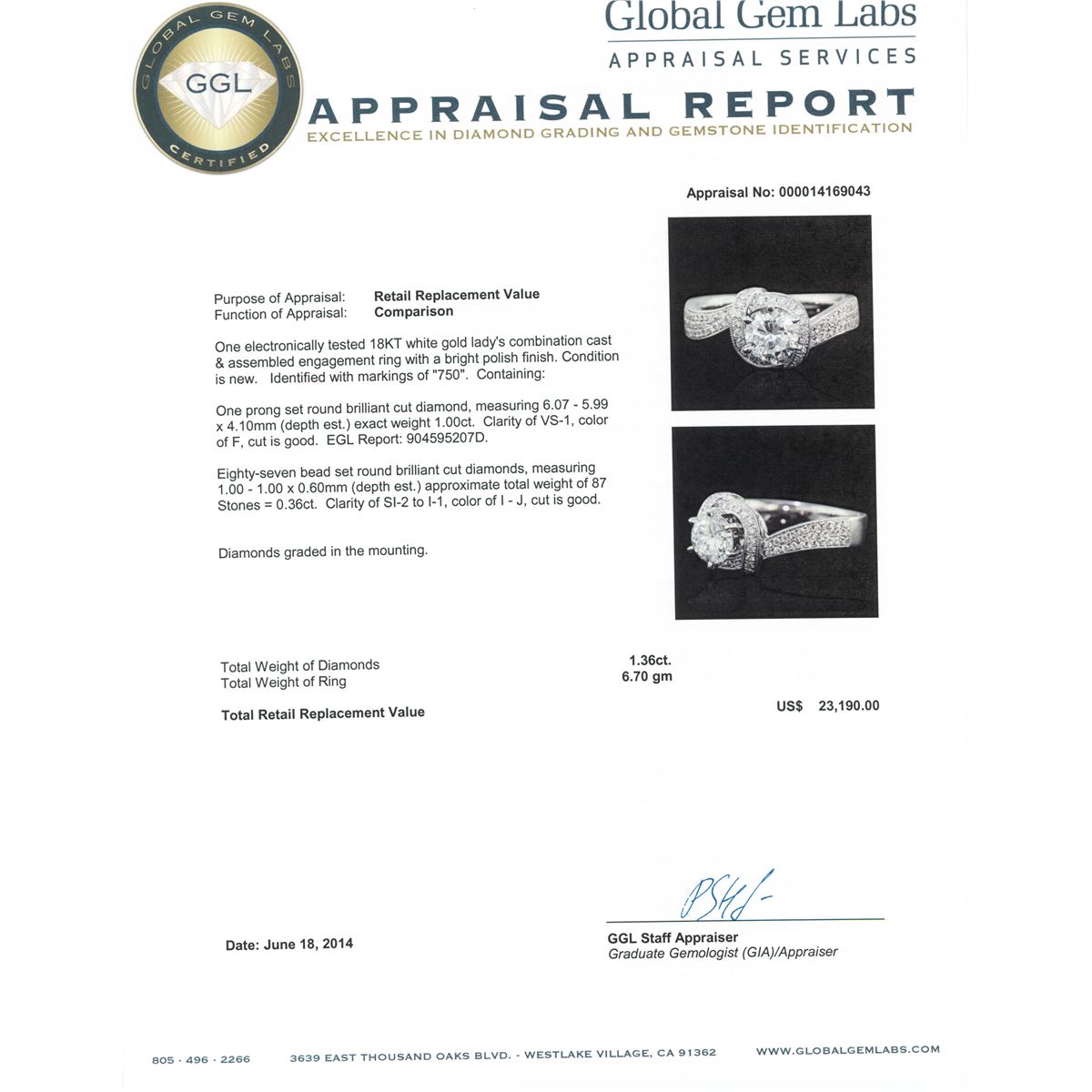 One electronically tested 18KT white gold Ladies combination cast & assembled engagement ring with a bright polish finish. Condition is new. Identified with markings of "750". Containing: One prong set round brilliant cut diamond, measuring 6.07 - 5.99 x 4.10mm (depth est.) exact weight 1.00ct. Clarity: VS-1. Color: F, Cut is Good. EGL Report: 904595207D. Eighty-Seven bead set round brilliant cut diamonds, measuring 1.00 - 1.00 x 0.60mm (depth est.) approximate. Total Weight of 87 Stones = 0.36ct. Clarity: SI-2 to I-1. Color: I - J, Cut is Good. Diamonds graded in the mounting. Total Weight of Diamonds 1.36ct. Total Weight of Ring 6.70 grams. GGL Appraised at $23,190.00.