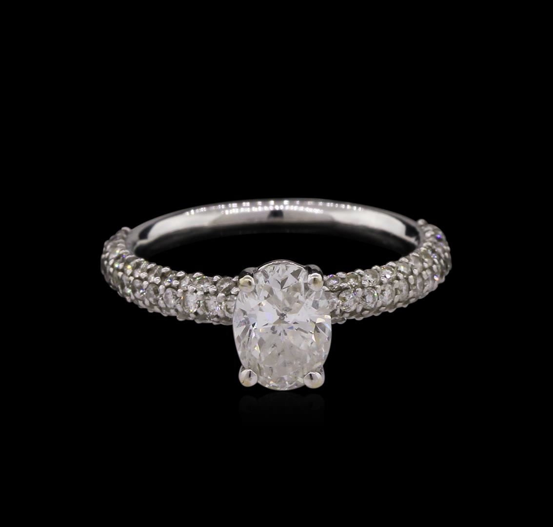 One electronically tested 18KT white gold ladies cast diamond unity ring with a bright polish finish. The featured diamond is supported by diamond set shoulders, completed by a two and one-half millimeter wide band. Condition is new, good workmanship. Containing: One prong set oval shaped cut diamond, measuring 7.71 x 5.69 x 3.90mm exact weight 1.23ct. EGL Report attached. Graded loose prior to setting in the EGL Laboratory Report #US 907408710D. Clarity: SI-2. Color: G. Depth 68.5%. Table 60.0%. Pavil. Depth%. 44.6%. Eighty-Four prong set round brilliant cut diamonds, measuring 1.30 - 1.20 x 0.75mm (depth est.) approximate total weight of 84 Stones = 0.69ct. Graded in the setting. Clarity: VS-2 to SI-2. Color: G - I. Total Weight of Diamonds 1.92ct. Total Weight of Ring 3.59 grams. AIG Appraised at $17,320.00.