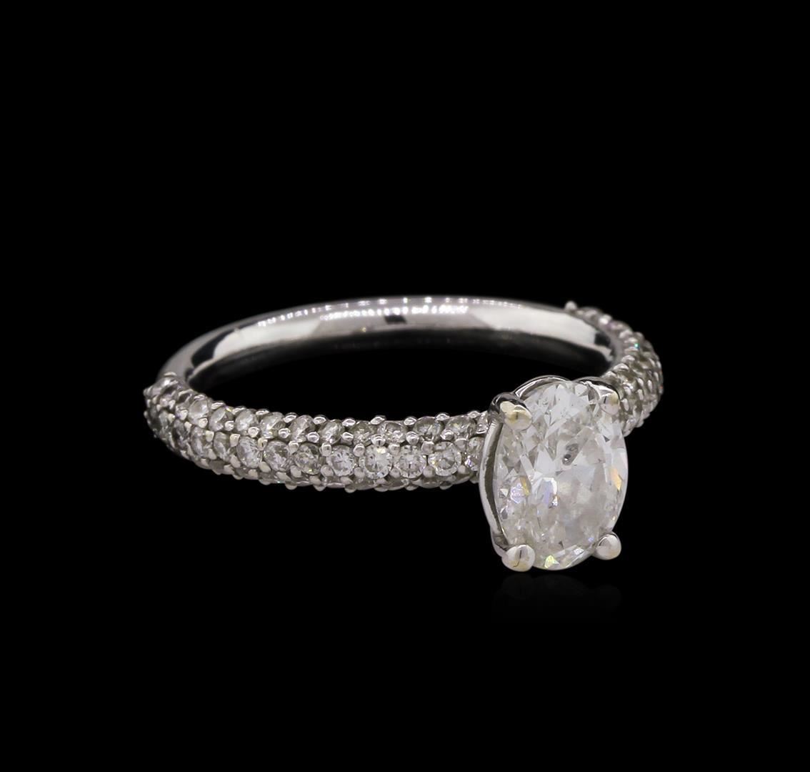 One electronically tested 18KT white gold ladies cast diamond unity ring with a bright polish finish. The featured diamond is supported by diamond set shoulders, completed by a two and one-half millimeter wide band. Condition is new, good workmanship. Containing: One prong set oval shaped cut diamond, measuring 7.71 x 5.69 x 3.90mm exact weight 1.23ct. EGL Report attached. Graded loose prior to setting in the EGL Laboratory Report #US 907408710D. Clarity: SI-2. Color: G. Depth 68.5%. Table 60.0%. Pavil. Depth%. 44.6%. Eighty-Four prong set round brilliant cut diamonds, measuring 1.30 - 1.20 x 0.75mm (depth est.) approximate total weight of 84 Stones = 0.69ct. Graded in the setting. Clarity: VS-2 to SI-2. Color: G - I. Total Weight of Diamonds 1.92ct. Total Weight of Ring 3.59 grams. AIG Appraised.