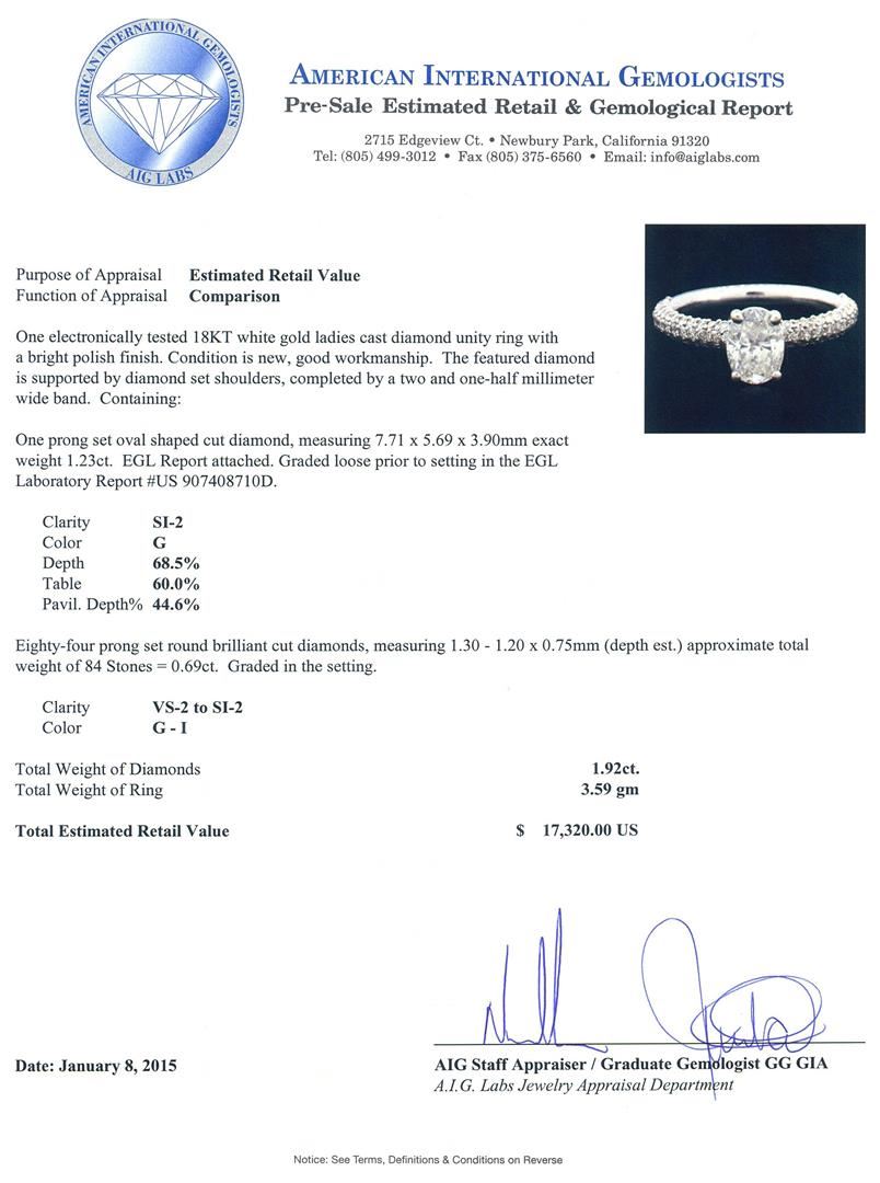 One electronically tested 18KT white gold ladies cast diamond unity ring with a bright polish finish. The featured diamond is supported by diamond set shoulders, completed by a two and one-half millimeter wide band. Condition is new, good workmanship. Containing: One prong set oval shaped cut diamond, measuring 7.71 x 5.69 x 3.90mm exact weight 1.23ct. EGL Report attached. Graded loose prior to setting in the EGL Laboratory Report #US 907408710D. Clarity: SI-2. Color: G. Depth 68.5%. Table 60.0%. Pavil. Depth%. 44.6%. Eighty-Four prong set round brilliant cut diamonds, measuring 1.30 - 1.20 x 0.75mm (depth est.) approximate total weight of 84 Stones = 0.69ct. Graded in the setting. Clarity: VS-2 to SI-2. Color: G - I. Total Weight of Diamonds 1.92ct. Total Weight of Ring 3.59 grams. AIG Appraised.