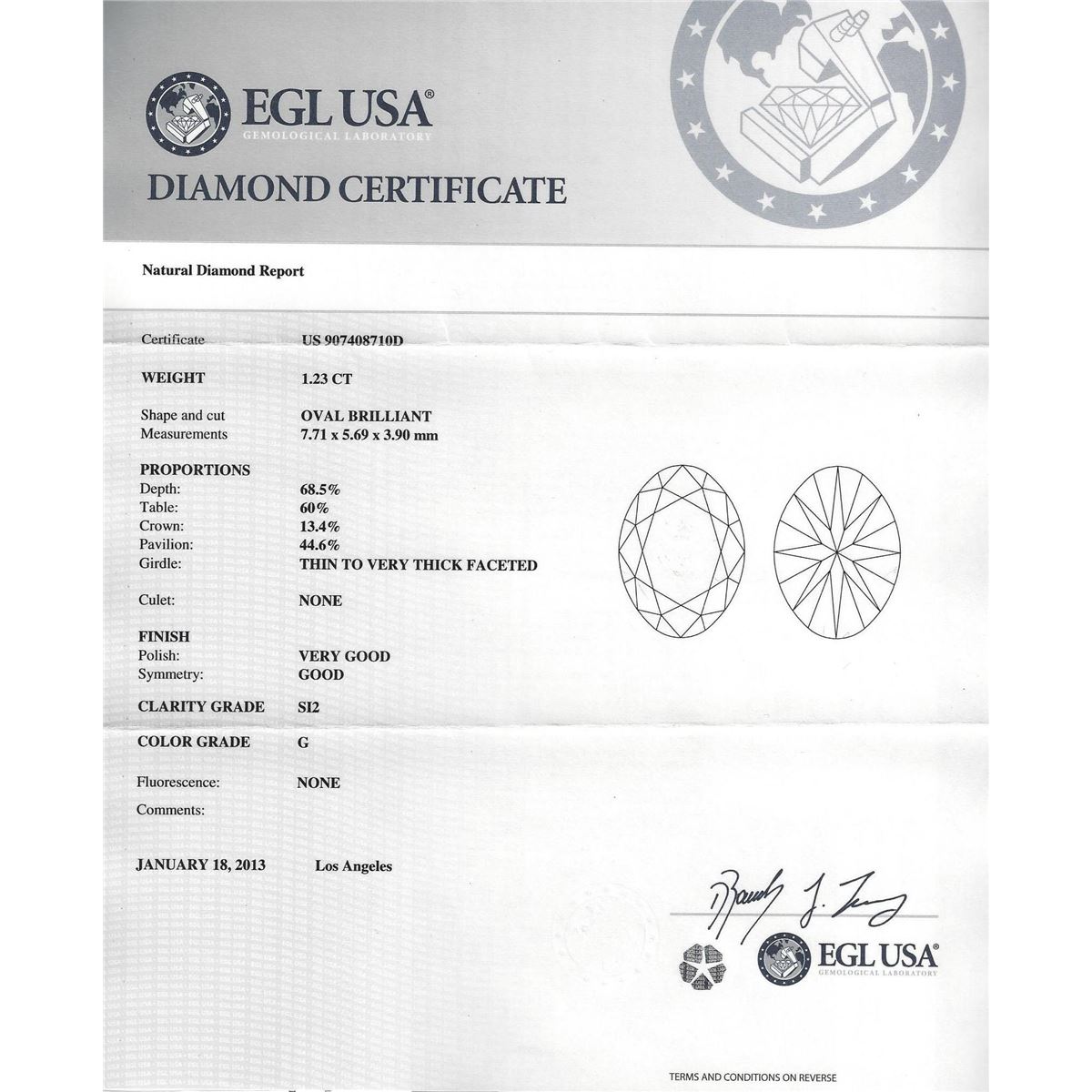 One electronically tested 18KT white gold ladies cast diamond unity ring with a bright polish finish. The featured diamond is supported by diamond set shoulders, completed by a two and one-half millimeter wide band. Condition is new, good workmanship. Containing: One prong set oval shaped cut diamond, measuring 7.71 x 5.69 x 3.90mm exact weight 1.23ct. EGL Report attached. Graded loose prior to setting in the EGL Laboratory Report #US 907408710D. Clarity: SI-2. Color: G. Depth 68.5%. Table 60.0%. Pavil. Depth%. 44.6%. Eighty-Four prong set round brilliant cut diamonds, measuring 1.30 - 1.20 x 0.75mm (depth est.) approximate total weight of 84 Stones = 0.69ct. Graded in the setting. Clarity: VS-2 to SI-2. Color: G - I. Total Weight of Diamonds 1.92ct. Total Weight of Ring 3.59 grams. AIG Appraised at $17,320.00.