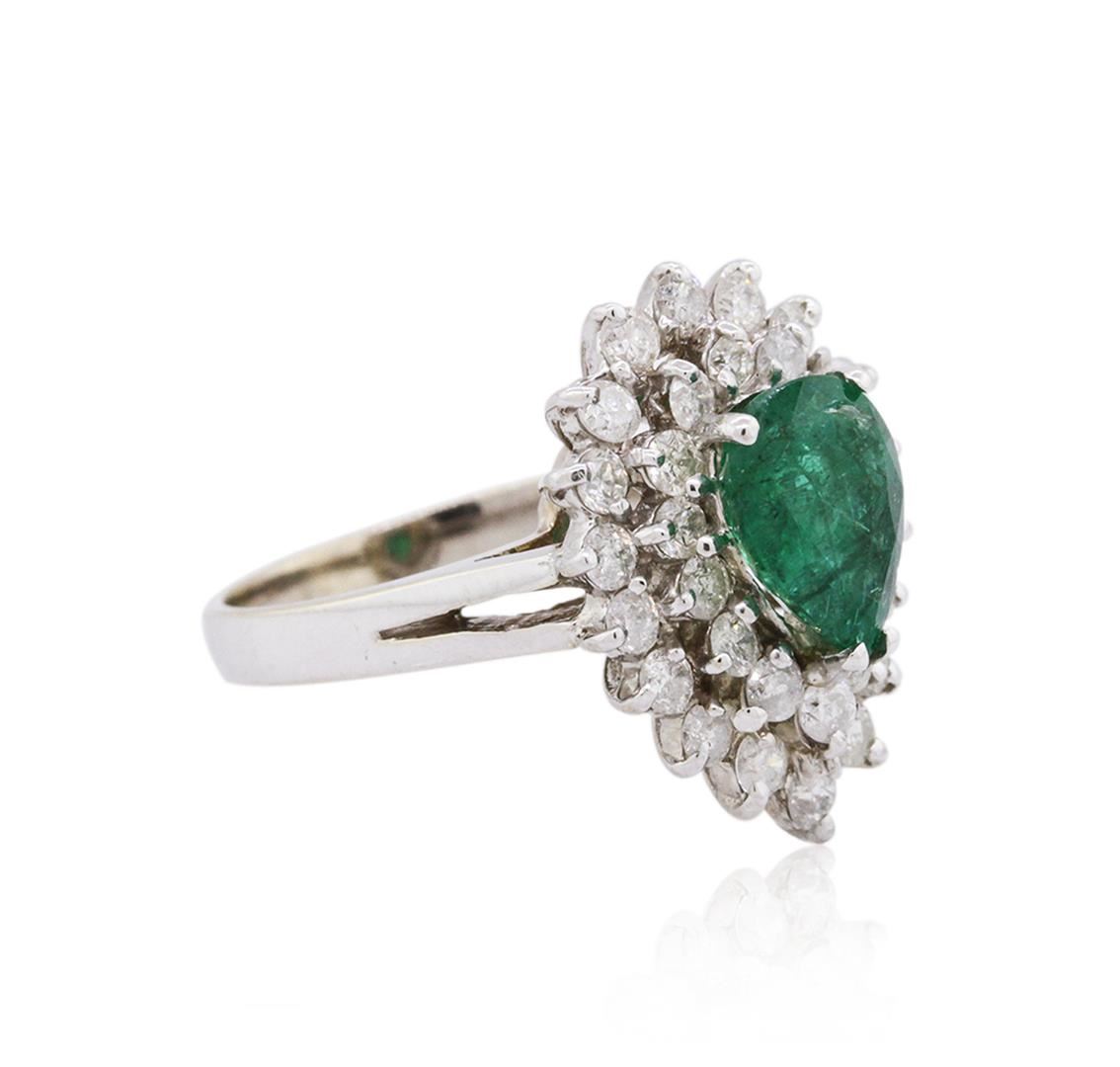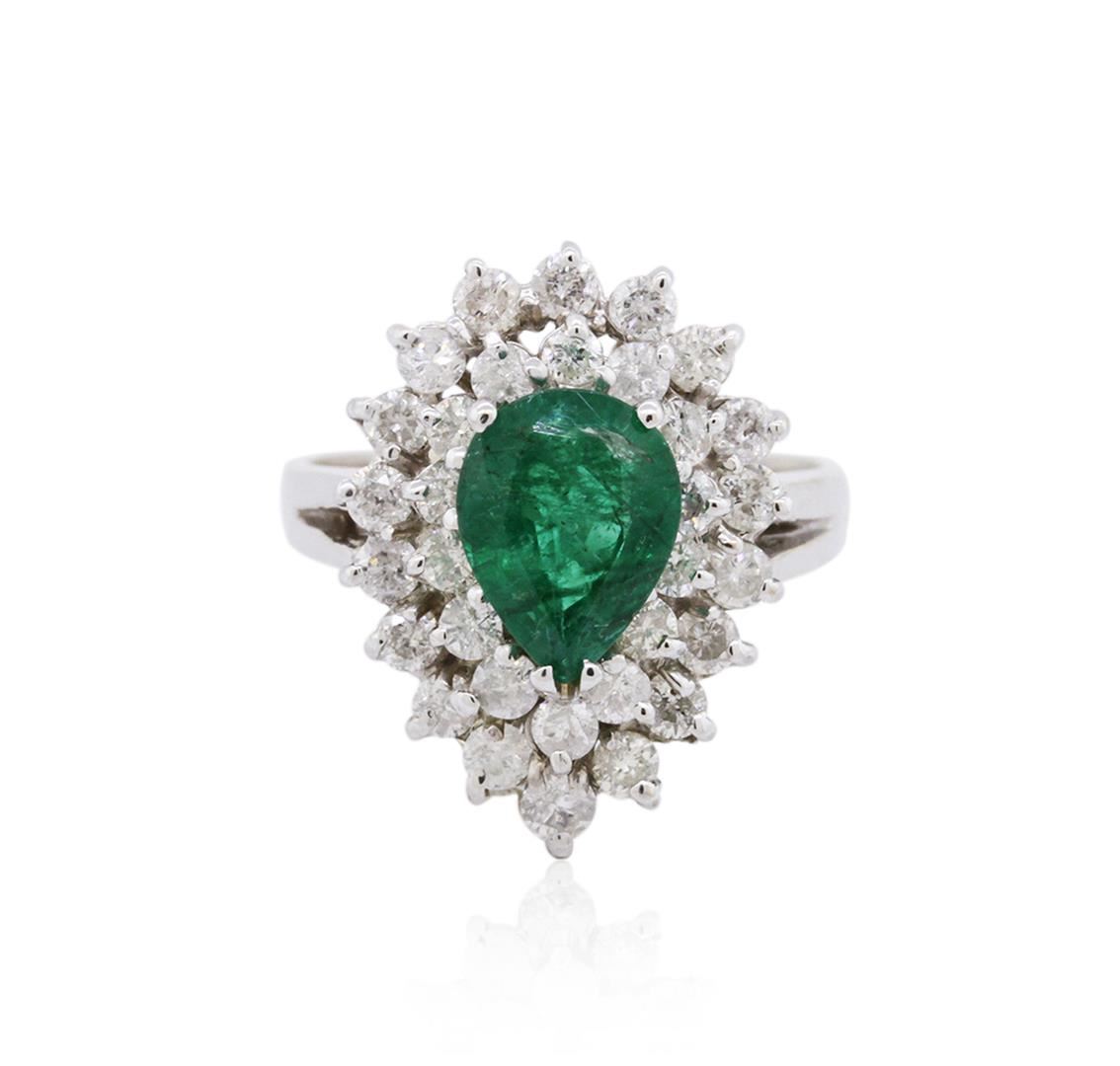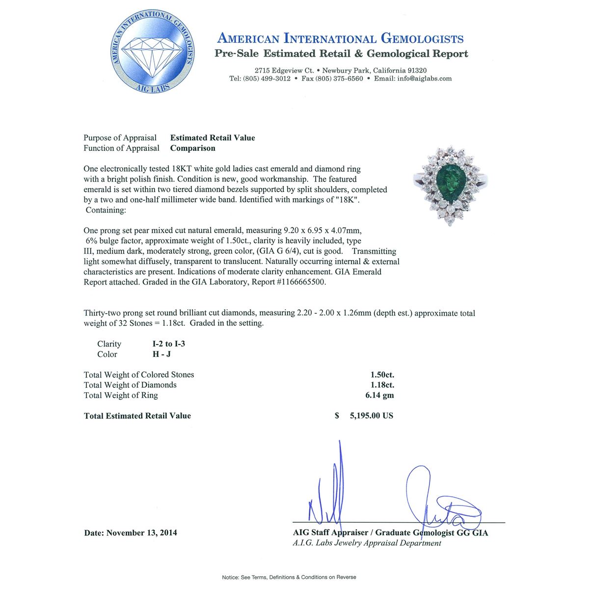 One electronically tested 18KT white gold ladies cast emerald and diamond ring with a bright polish finish. The featured emerald is set within two tiered diamond bezels supported by split shoulders, completed by a two and one-half millimeter wide band. Identified with markings of "18K". Condition is new, good workmanship. Containing: One prong set pear mixed cut natural emerald, measuring 9.20 x 6.95 x 4.07mm, 6% bulge factor, approximate weight of 1.50ct., clarity is heavily included, type III, medium dark, moderately strong, green color, (GIA G 6/4), cut is good. Transmitting light somewhat diffusely, transparent to translucent. Naturally occurring internal & external characteristics are present. Indications of moderate clarity enhancement. GIA Emerald Report attached. Graded in the GIA Laboratory, Report #1166665500.Thirty-Two prong set round brilliant cut diamonds, measuring 2.20 - 2.00 x 1.26mm (depth est.) approximate total weight of 32 Stones = 1.18ct. Graded in the setting. Clarity: I-2 to I-3. Color: H - J. Total Weight of Colored Stones 1.50ct. Total Weight of Diamonds 1.18ct. Total Weight of Ring 6.14 grams. AIG Appraised at $5,195.00.