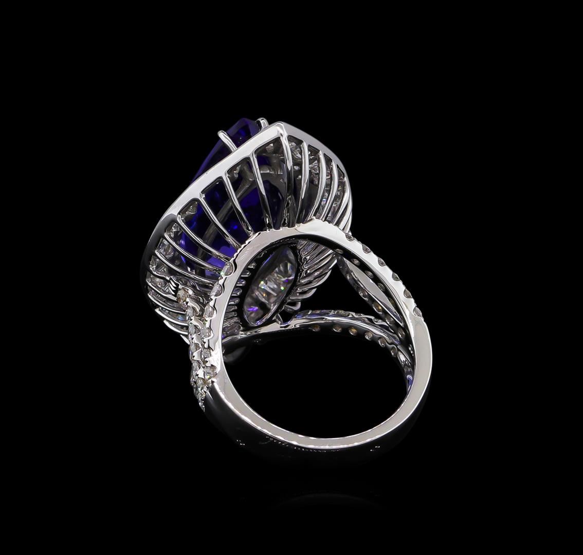 One electronically tested 18KT white gold ladies combination cast & assembled prong set ring with a split shank with a bright polish finish. Identified with markings of "750 18K". Condition is new. Containing: One prong set marquise modified brilliant cut natural tanzanite, measuring 22.29 x 10.31 x 7.12mm, exact weight 10.54ct., clarity is eye clean, type I, medium dark, moderately strong, bluish violet color, (GIA bV 6/4), cut is good. Graded loose prior to setting by GIA Gemological Laboratory, GIA Laboratory Report # 2161452330.Sixteen prong set round brilliant cut diamonds, measuring 2.80 - 2.80 x 1.68mm (depth est.) approximate total weight of 16 Stones = 1.29ct. Clarity: SI-1 to SI-2. Color: H - I, Cut is Very Good. Sixteen prong set baguette cut diamonds, measuring from 2.00 x 1.30 x 1.11mm (depth est.) to 2.50 x 1.50 x 1.28mm (depth est.) approximate total weight of 16 Stones = 0.76ct. Clarity: VS-1. Color: I - J, Cut is Good. Seventy prong set round brilliant cut diamonds, measuring 1.80 - 1.50 x 0.99mm (depth est.) approximate total weight of 70 Stones = 1.45ct. Clarity: SI-1 to SI-2. Color: H - I, Cut is Good. All diamonds and colored gemstones are graded in the mounting, unless otherwise stated, Colored gemstones are presumed to have been subjected to commonly used enhancement processes. Total Weight of Colored Stones 10.54ct. Total Weight of Diamonds 3.49ct. Total Weight of Ring 12.30 grams. GGL Appraised at $38,025.00.