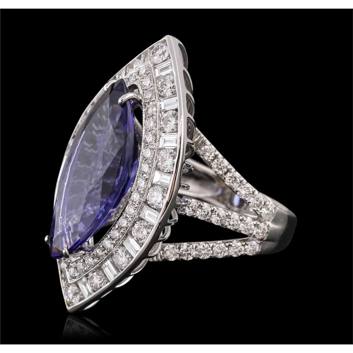 One electronically tested 18KT white gold ladies combination cast & assembled prong set ring with a split shank with a bright polish finish. Identified with markings of "750 18K". Condition is new. Containing: One prong set marquise modified brilliant cut natural tanzanite, measuring 22.29 x 10.31 x 7.12mm, exact weight 10.54ct., clarity is eye clean, type I, medium dark, moderately strong, bluish violet color, (GIA bV 6/4), cut is good. Graded loose prior to setting by GIA Gemological Laboratory, GIA Laboratory Report # 2161452330.Sixteen prong set round brilliant cut diamonds, measuring 2.80 - 2.80 x 1.68mm (depth est.) approximate total weight of 16 Stones = 1.29ct. Clarity: SI-1 to SI-2. Color: H - I, Cut is Very Good. Sixteen prong set baguette cut diamonds, measuring from 2.00 x 1.30 x 1.11mm (depth est.) to 2.50 x 1.50 x 1.28mm (depth est.) approximate total weight of 16 Stones = 0.76ct. Clarity: VS-1. Color: I - J, Cut is Good. Seventy prong set round brilliant cut diamonds, measuring 1.80 - 1.50 x 0.99mm (depth est.) approximate total weight of 70 Stones = 1.45ct. Clarity: SI-1 to SI-2. Color: H - I, Cut is Good. All diamonds and colored gemstones are graded in the mounting, unless otherwise stated, Colored gemstones are presumed to have been subjected to commonly used enhancement processes. Total Weight of Colored Stones 10.54ct. Total Weight of Diamonds 3.49ct. Total Weight of Ring 12.30 grams. GGL Appraised at $38,025.00.