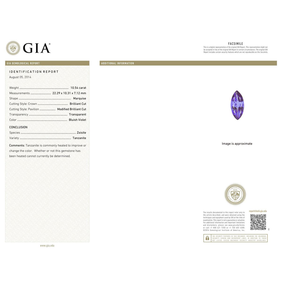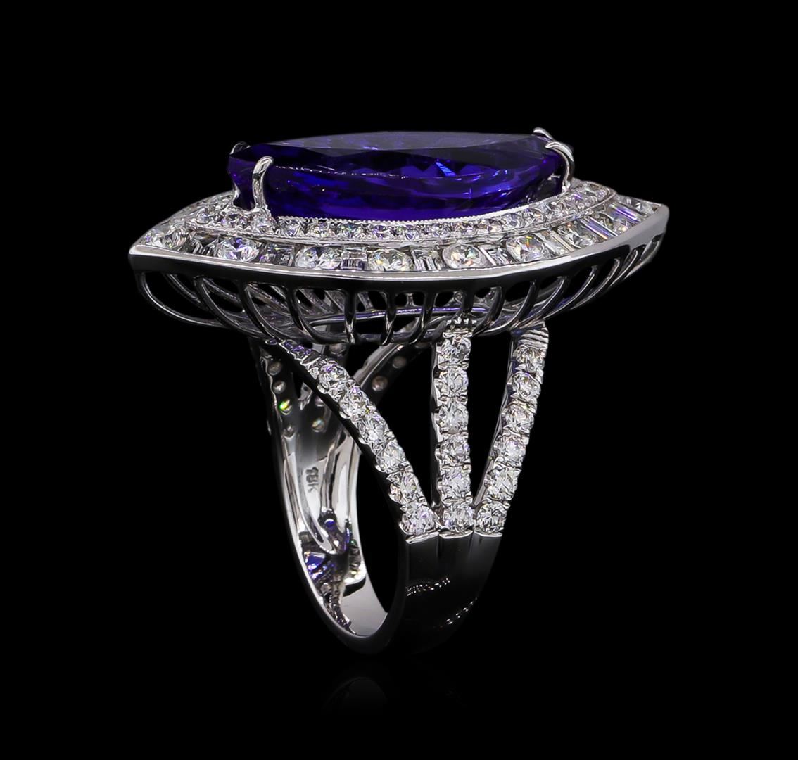 One electronically tested 18KT white gold ladies combination cast & assembled prong set ring with a split shank with a bright polish finish. Identified with markings of "750 18K". Condition is new. Containing: One prong set marquise modified brilliant cut natural tanzanite, measuring 22.29 x 10.31 x 7.12mm, exact weight 10.54ct., clarity is eye clean, type I, medium dark, moderately strong, bluish violet color, (GIA bV 6/4), cut is good. Graded loose prior to setting by GIA Gemological Laboratory, GIA Laboratory Report # 2161452330.Sixteen prong set round brilliant cut diamonds, measuring 2.80 - 2.80 x 1.68mm (depth est.) approximate total weight of 16 Stones = 1.29ct. Clarity: SI-1 to SI-2. Color: H - I, Cut is Very Good. Sixteen prong set baguette cut diamonds, measuring from 2.00 x 1.30 x 1.11mm (depth est.) to 2.50 x 1.50 x 1.28mm (depth est.) approximate total weight of 16 Stones = 0.76ct. Clarity: VS-1. Color: I - J, Cut is Good. Seventy prong set round brilliant cut diamonds, measuring 1.80 - 1.50 x 0.99mm (depth est.) approximate total weight of 70 Stones = 1.45ct. Clarity: SI-1 to SI-2. Color: H - I, Cut is Good. All diamonds and colored gemstones are graded in the mounting, unless otherwise stated, Colored gemstones are presumed to have been subjected to commonly used enhancement processes. Total Weight of Colored Stones 10.54ct. Total Weight of Diamonds 3.49ct. Total Weight of Ring 12.30 grams. GGL Appraised at $38,025.00.