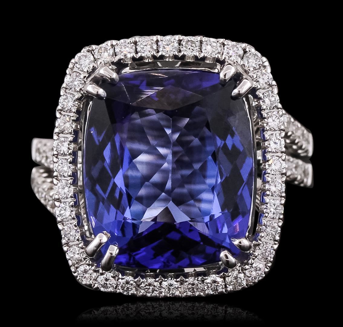 One electronically tested 18KT white gold ladies combination cast & assembled prong set ring with a split shank with a bright polish finish. Identified with markings of "750 UCG". Condition is new. Containing: One prong set rectangular cushion modified brilliant cut natural tanzanite, measuring 14.76 x 12.50 x 6.69mm, exact weight 10.65ct., clarity is eye clean, type I, medium, moderately strong, violetish blue color, (GIA vB 5/4), cut is excellent. Graded loose prior to setting by GIA Gemological Laboratory, GIA Laboratory Report # 2161453342.Sixty-Four prong set round brilliant cut diamonds, measuring 1.50 - 1.50 x 0.90mm (depth est.) approximate total weight of 64 Stones = 0.86ct. Clarity: SI-1 to SI-2. Color: H - I, Cut is Good. Colored gemstones are presumed to have been subjected to commonly used enhancement processes. All diamonds and colored gemstones are graded in the mounting, unless otherwise stated. Total Weight of Colored Stones 10.65ct. Total Weight of Diamonds 0.86ct. Total Weight of Ring 10.50 grams. GGL Appraised at $31,145.00.
