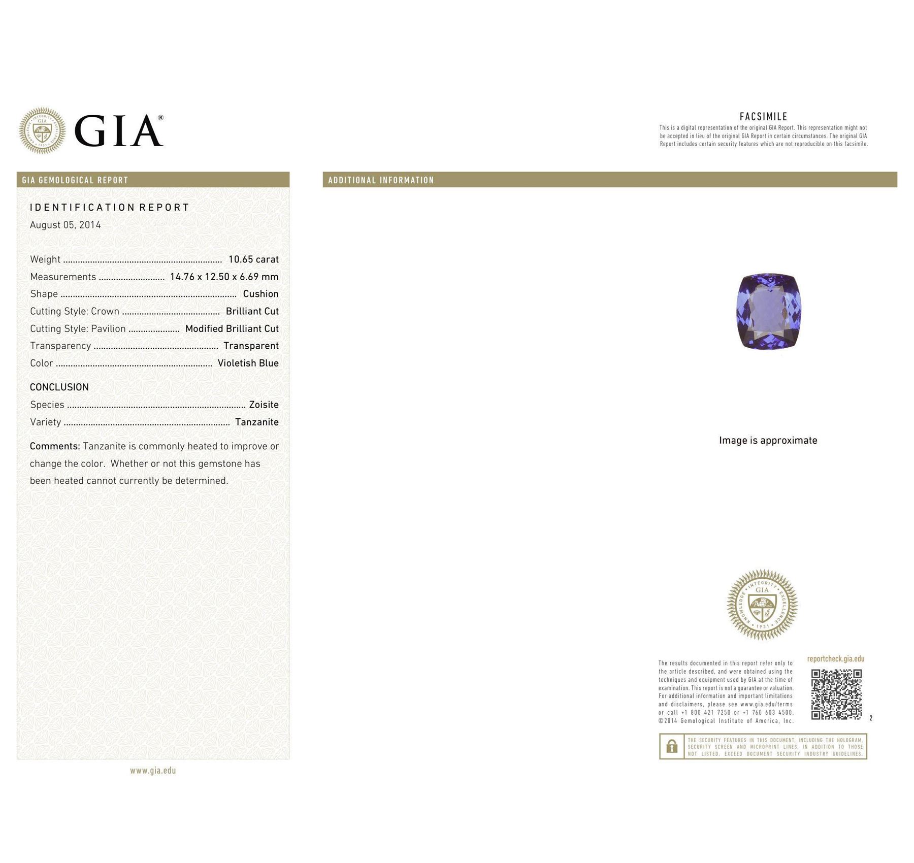 One electronically tested 18KT white gold ladies combination cast & assembled prong set ring with a split shank with a bright polish finish. Identified with markings of "750 UCG". Condition is new. Containing: One prong set rectangular cushion modified brilliant cut natural tanzanite, measuring 14.76 x 12.50 x 6.69mm, exact weight 10.65ct., clarity is eye clean, type I, medium, moderately strong, violetish blue color, (GIA vB 5/4), cut is excellent. Graded loose prior to setting by GIA Gemological Laboratory, GIA Laboratory Report # 2161453342.Sixty-Four prong set round brilliant cut diamonds, measuring 1.50 - 1.50 x 0.90mm (depth est.) approximate total weight of 64 Stones = 0.86ct. Clarity: SI-1 to SI-2. Color: H - I, Cut is Good. Colored gemstones are presumed to have been subjected to commonly used enhancement processes. All diamonds and colored gemstones are graded in the mounting, unless otherwise stated. Total Weight of Colored Stones 10.65ct. Total Weight of Diamonds 0.86ct. Total Weight of Ring 10.50 grams. GGL Appraised at $31,145.00.