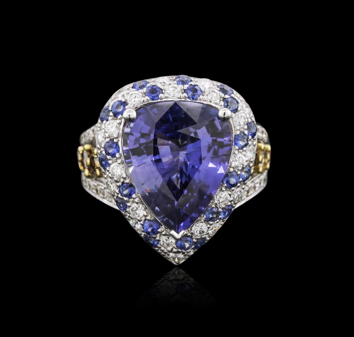 One electronically tested 18KT white gold ladies cast & assembled color change sapphire and diamond ring. The featured color change sapphire is set within a stylized tiered sapphire and diamond bezel supported by elaborate diamond set three-way split shoulders, completed by a four millimeter wide band. Bright polish finish with yellow gold accents. Condition is new, good workmanship. Containing: One prong set pear mixed cut natural color change sapphire, measuring 14.80 x 11.90 x 6.64mm, approximate weight of 9.92ct., clarity is moderately included, type II, medium dark, moderately strong, bluish violet color, (GIA bV 6/4) to medium dark, moderately strong, purple, (GIA P 6/4), cut is good. Transmitting light somewhat diffusely, transparent. Naturally occurring internal & external characteristics are present. No indications of heating. Graded in the setting at the GIA Laboratory, Report # 2161042349. The report is attached. Twenty-two prong set round brilliant cut natural blue sapphires, measuring 1.90 - 1.80 x 1.20 mm, approximate total weight of 0.76ct., clarity is eye clean, type II, medium dark, moderately strong, violetish blue color, (GIA vB 6/4), cut is good. Transmitting light with no distortion, transparent. Color grade is an average for the group. Graded in the setting. Six prong set pear shaped cut diamonds, measuring 2.80 x 2.70 x 1.70mm (depth est.) approximate total weight of 6 Stones = 0.57ct. The group contains a mix of natural fancy light yellow, fancy yellowish brown, fancy brown and fancy pinkish brown color diamonds. Graded in the setting. Clarity: SI-1 to SI-2 Twenty-Two prong set round brilliant cut diamonds, measuring 1.90 - 1.80 x 1.11mm (depth est.) approximate total weight of 22 Stones = 0.60ct. Graded in the setting. Clarity: VS-2 to SI-1. Color: F - H Forty-Six prong set round brilliant cut diamonds, measuring 1.40 - 1.30 x 0.81mm (depth est.) approximate total weight of 46 Stones = 0.51ct. Graded in the setting. Clarity: VS-1 to SI-1. Color: G - I. Total Weight of Colored Stones 10.68ct. Total Weight of Diamonds 1.68ct. Total Weight of Ring 9.91 grams. AIG Appraised at $152,000.00.