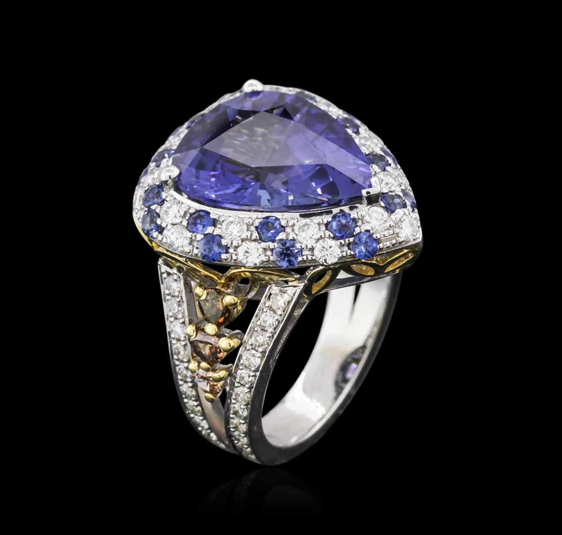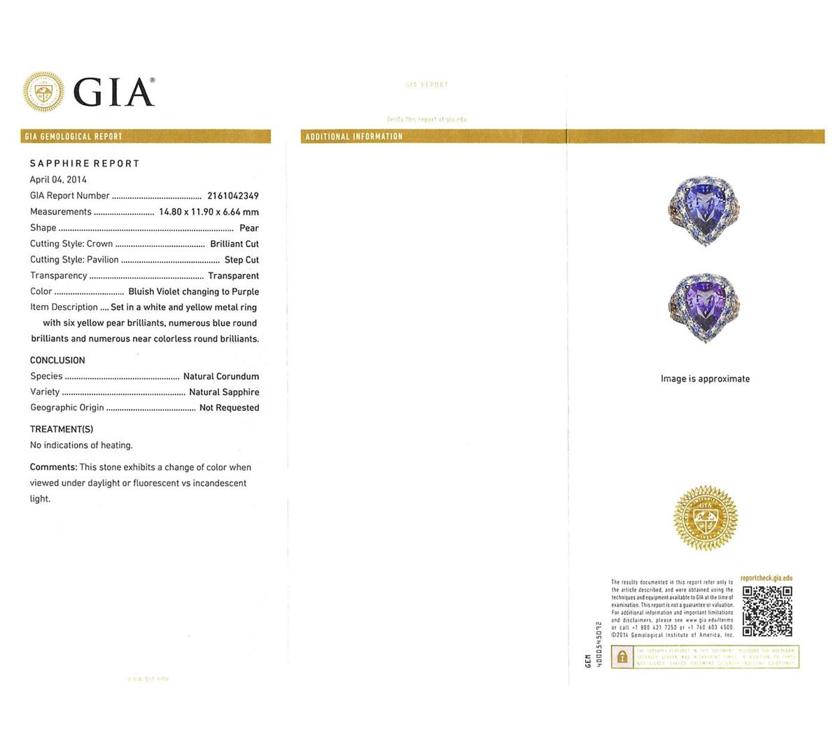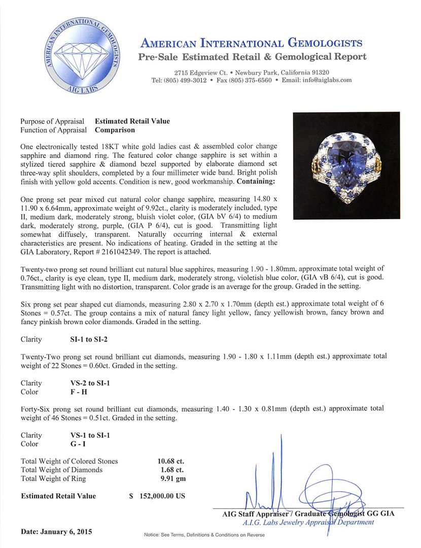 One electronically tested 18KT white gold ladies cast & assembled color change sapphire and diamond ring. The featured color change sapphire is set within a stylized tiered sapphire and diamond bezel supported by elaborate diamond set three-way split shoulders, completed by a four millimeter wide band. Bright polish finish with yellow gold accents. Condition is new, good workmanship. Containing: One prong set pear mixed cut natural color change sapphire, measuring 14.80 x 11.90 x 6.64mm, approximate weight of 9.92ct., clarity is moderately included, type II, medium dark, moderately strong, bluish violet color, (GIA bV 6/4) to medium dark, moderately strong, purple, (GIA P 6/4), cut is good. Transmitting light somewhat diffusely, transparent. Naturally occurring internal & external characteristics are present. No indications of heating. Graded in the setting at the GIA Laboratory, Report # 2161042349. The report is attached. Twenty-two prong set round brilliant cut natural blue sapphires, measuring 1.90 - 1.80 x 1.20 mm, approximate total weight of 0.76ct., clarity is eye clean, type II, medium dark, moderately strong, violetish blue color, (GIA vB 6/4), cut is good. Transmitting light with no distortion, transparent. Color grade is an average for the group. Graded in the setting. Six prong set pear shaped cut diamonds, measuring 2.80 x 2.70 x 1.70mm (depth est.) approximate total weight of 6 Stones = 0.57ct. The group contains a mix of natural fancy light yellow, fancy yellowish brown, fancy brown and fancy pinkish brown color diamonds. Graded in the setting. Clarity: SI-1 to SI-2 Twenty-Two prong set round brilliant cut diamonds, measuring 1.90 - 1.80 x 1.11mm (depth est.) approximate total weight of 22 Stones = 0.60ct. Graded in the setting. Clarity: VS-2 to SI-1. Color: F - H Forty-Six prong set round brilliant cut diamonds, measuring 1.40 - 1.30 x 0.81mm (depth est.) approximate total weight of 46 Stones = 0.51ct. Graded in the setting. Clarity: VS-1 to SI-1. Color: G - I. Total Weight of Colored Stones 10.68ct. Total Weight of Diamonds 1.68ct. Total Weight of Ring 9.91 grams. AIG Appraised at $152,000.00.