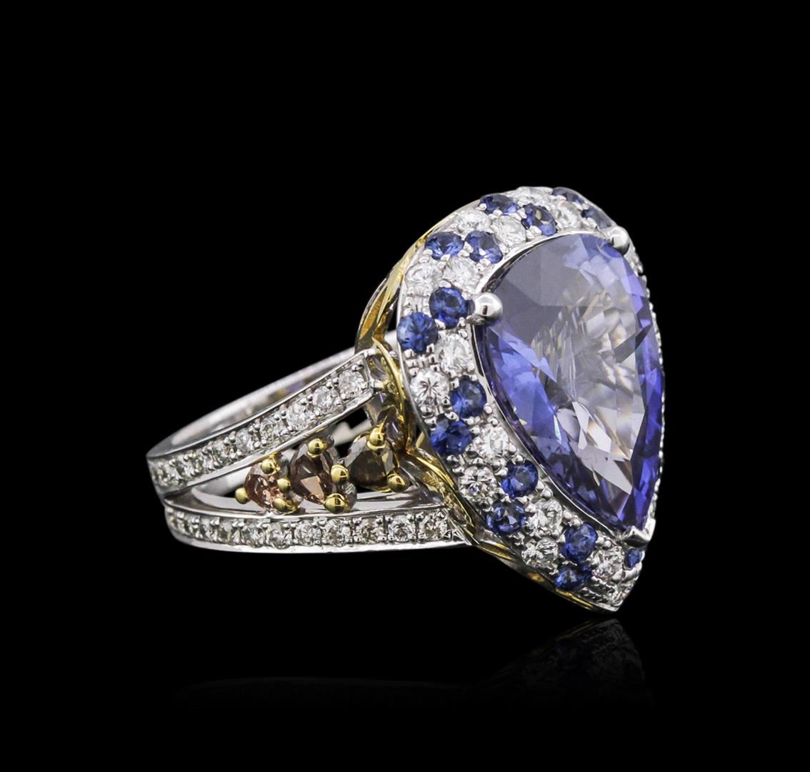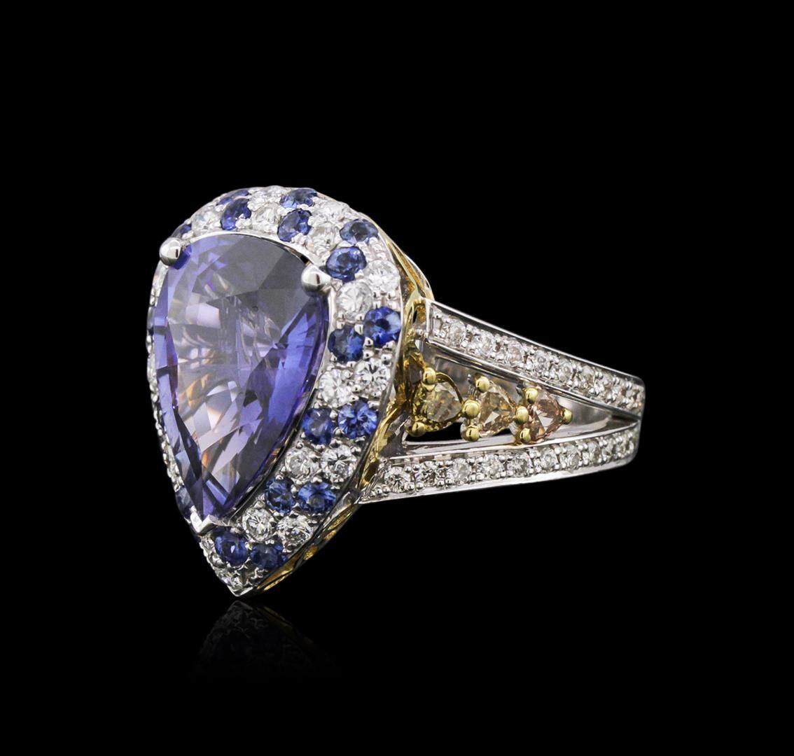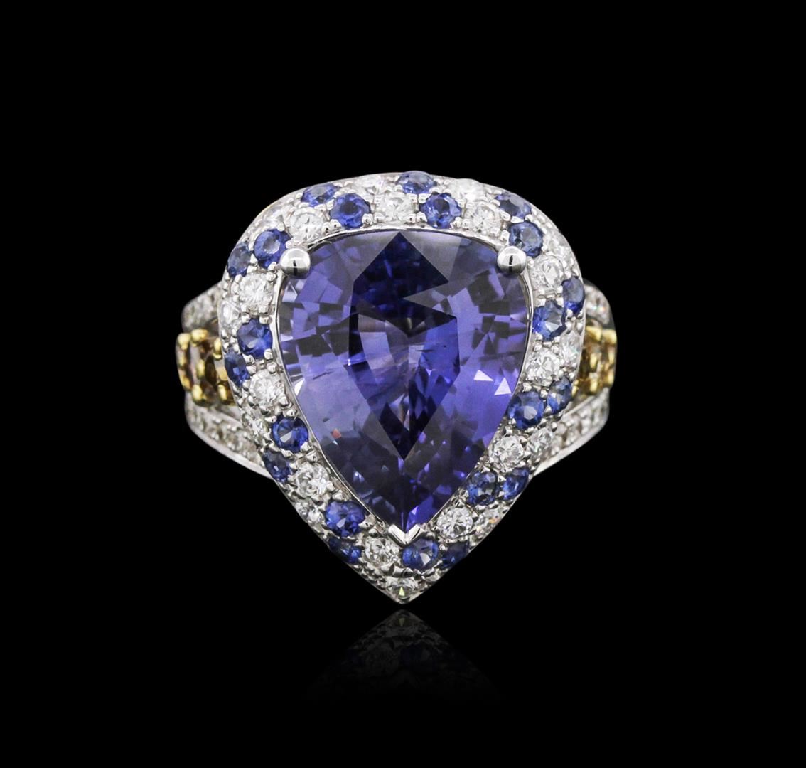 One electronically tested 18KT white gold ladies cast & assembled color change sapphire and diamond ring. The featured color change sapphire is set within a stylized tiered sapphire and diamond bezel supported by elaborate diamond set three-way split shoulders, completed by a four millimeter wide band. Bright polish finish with yellow gold accents. Condition is new, good workmanship. Containing: One prong set pear mixed cut natural color change sapphire, measuring 14.80 x 11.90 x 6.64mm, approximate weight of 9.92ct., clarity is moderately included, type II, medium dark, moderately strong, bluish violet color, (GIA bV 6/4) to medium dark, moderately strong, purple, (GIA P 6/4), cut is good. Transmitting light somewhat diffusely, transparent. Naturally occurring internal & external characteristics are present. No indications of heating. Graded in the setting at the GIA Laboratory, Report # 2161042349. The report is attached. Twenty-two prong set round brilliant cut natural blue sapphires, measuring 1.90 - 1.80 x 1.20 mm, approximate total weight of 0.76ct., clarity is eye clean, type II, medium dark, moderately strong, violetish blue color, (GIA vB 6/4), cut is good. Transmitting light with no distortion, transparent. Color grade is an average for the group. Graded in the setting. Six prong set pear shaped cut diamonds, measuring 2.80 x 2.70 x 1.70mm (depth est.) approximate total weight of 6 Stones = 0.57ct. The group contains a mix of natural fancy light yellow, fancy yellowish brown, fancy brown and fancy pinkish brown color diamonds. Graded in the setting. Clarity: SI-1 to SI-2 Twenty-Two prong set round brilliant cut diamonds, measuring 1.90 - 1.80 x 1.11mm (depth est.) approximate total weight of 22 Stones = 0.60ct. Graded in the setting. Clarity: VS-2 to SI-1. Color: F - H Forty-Six prong set round brilliant cut diamonds, measuring 1.40 - 1.30 x 0.81mm (depth est.) approximate total weight of 46 Stones = 0.51ct. Graded in the setting. Clarity: VS-1 to SI-1. Color: G - I. Total Weight of Colored Stones 10.68ct. Total Weight of Diamonds 1.68ct. Total Weight of Ring 9.91 grams. AIG Appraised at $152,000.00.