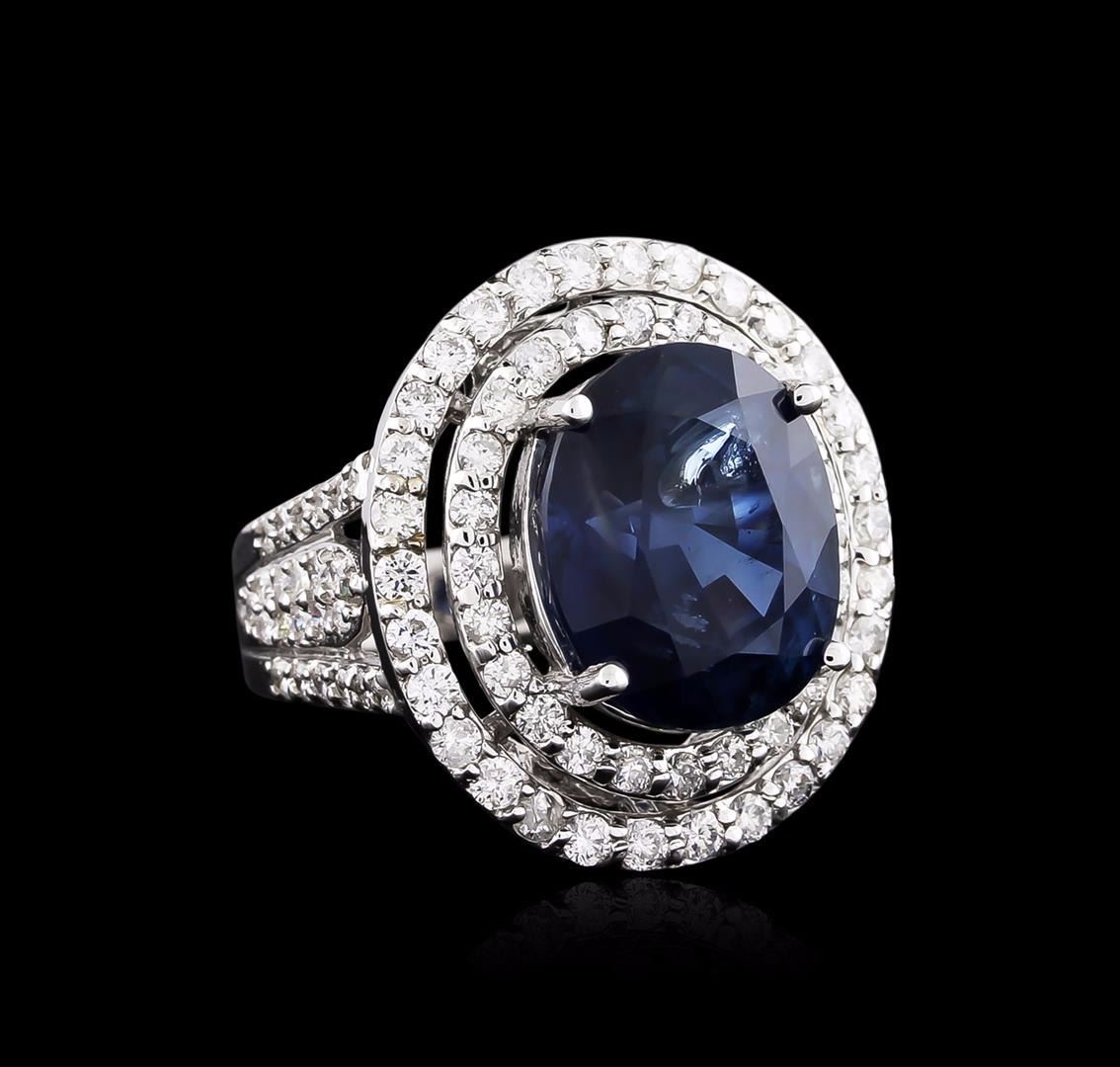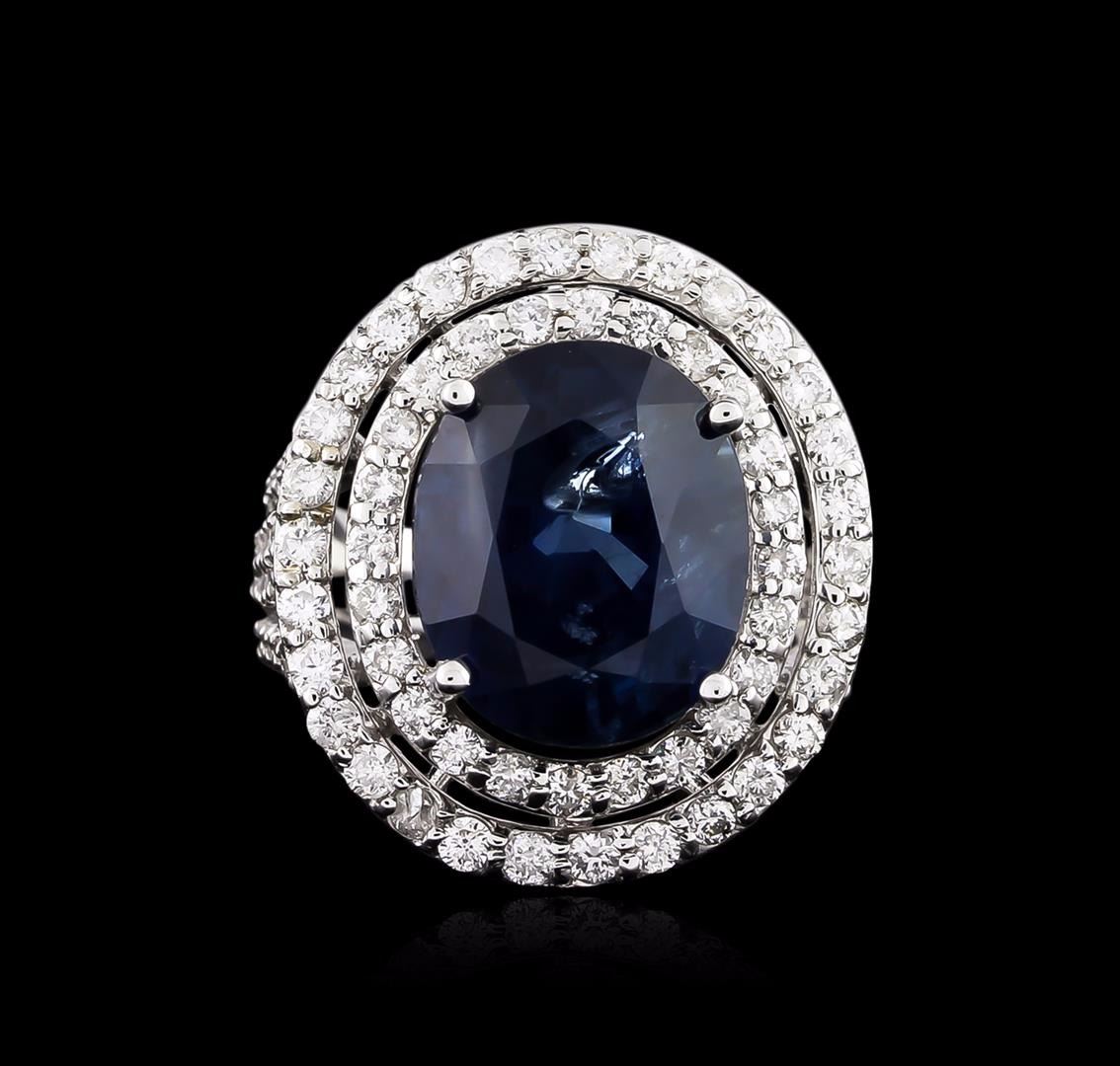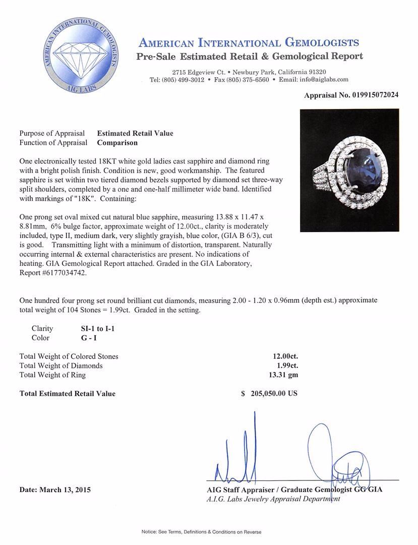 One electronically tested 18KT white gold ladies cast sapphire and diamond ring with a bright polish finish. The featured sapphire is set within two tiered diamond bezels supported by diamond set three-way split shoulders, completed by a one and one-half millimeter wide band. Identified with markings of "18K". Condition is new, good workmanship. Containing: One prong set oval mixed cut natural blue sapphire, measuring 13.88 x 11.47 x 8.81mm, 6% bulge factor, approximate weight of 12.00ct., clarity is moderately included, type II, medium dark, very slightly grayish, blue color, (GIA B 6/3), cut is good. Transmitting light with a minimum of distortion, transparent. Naturally occurring internal & external characteristics are present. No indications of heating. GIA Gemological Report attached. Graded in the GIA Laboratory, Report #6177034742.One Hundred Four prong set round brilliant cut diamonds, measuring 2.00 - 1.20 x 0.96mm (depth est.) approximate total weight of 104 Stones = 1.99ct. Graded in the setting. Clarity: SI-1 to I-1. Color: G - I. Total Weight of Colored Stones 12.00ct. Total Weight of Diamonds 1.99ct. Total Weight of Ring 13.31 grams. AIG Appraised at $205,050.00.