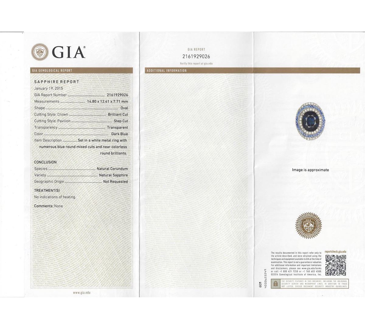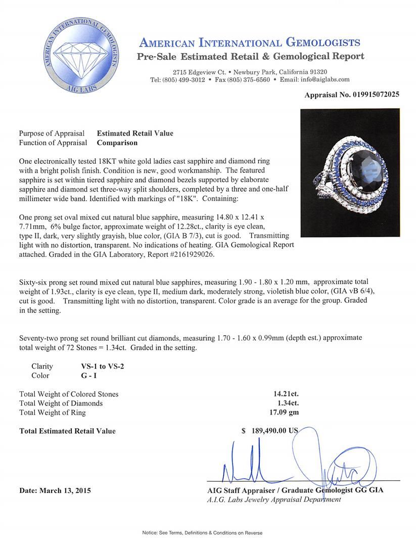One electronically tested 18KT white gold ladies cast sapphire and diamond ring with a bright polish finish. The featured sapphire is set within tiered sapphire and diamond bezels supported by elaborate sapphire and diamond set three-way split shoulders, completed by a three and one-half millimeter wide band. Identified with markings of "18K". Condition is new, good workmanship. Containing: One prong set oval mixed cut natural blue sapphire, measuring 14.80 x 12.41 x 7.71mm, 6% bulge factor, approximate weight of 12.28ct., clarity is eye clean, type II, dark, very slightly grayish, blue color, (GIA B 7/3), cut is good. Transmitting light with no distortion, transparent. No indications of heating. GIA Gemological Report attached. Graded in the GIA Laboratory, Report #2161929026.Sixty-six prong set round mixed cut natural blue sapphires, measuring 1.90 - 1.80 x 1.20 mm, approximate total weight of 1.93ct., clarity is eye clean, type II, medium dark, moderately strong, violetish blue color, (GIA vB 6/4), cut is good. Transmitting light with no distortion, transparent. Color grade is an average for the group. Graded in the setting. Seventy-Two prong set round brilliant cut diamonds, measuring 1.70 - 1.60 x 0.99mm (depth est.) approximate total weight of 72 Stones = 1.34ct. Graded in the setting. Clarity: VS-1 to VS-2. Color: G - I. Total Weight of Colored Stones 14.21ct. Total Weight of Diamonds 1.34ct. Total Weight of Ring 17.09 grams. AIG Appraised at $189,490.00.