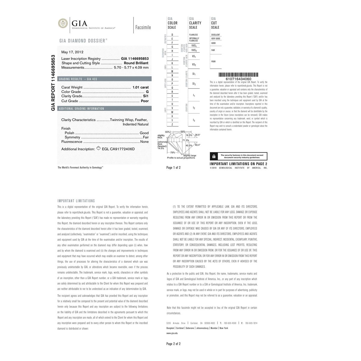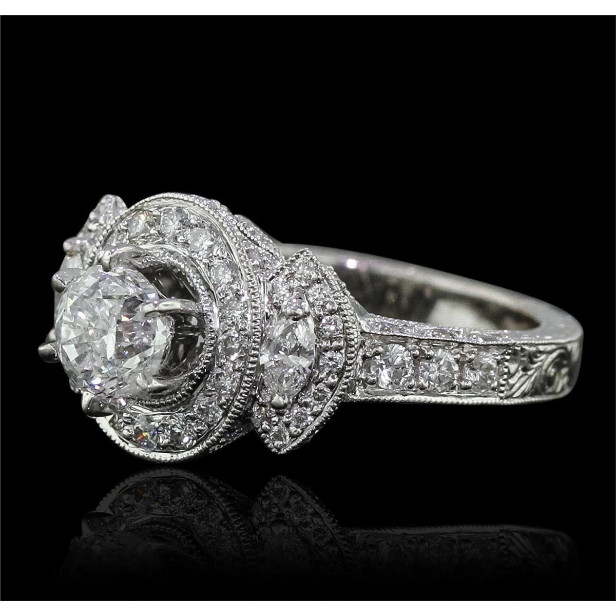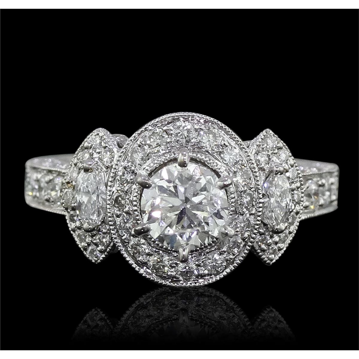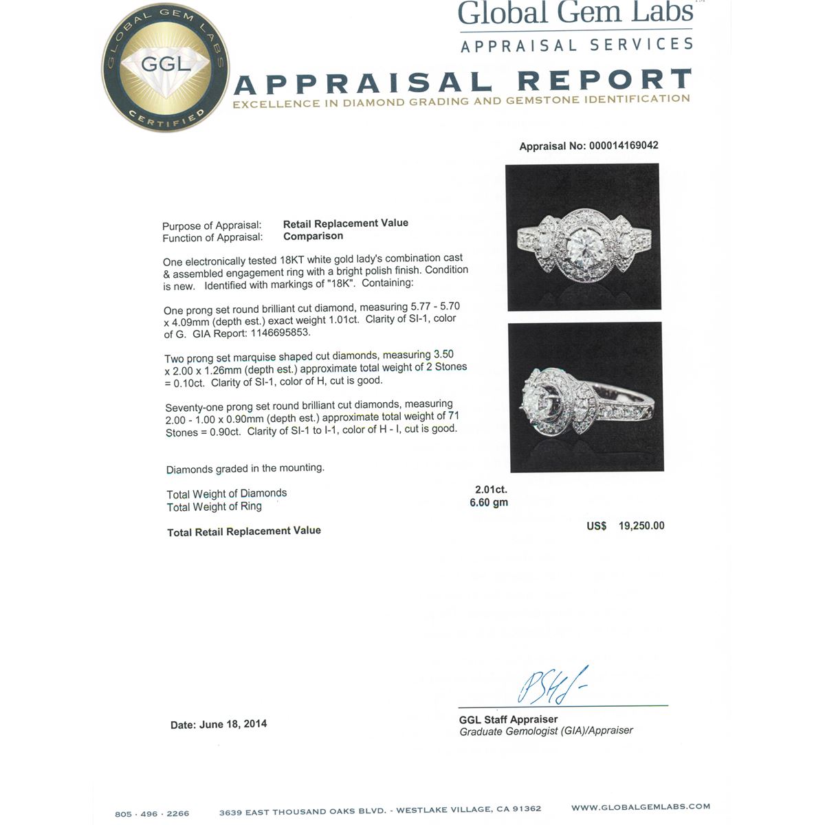 One electronically tested 18KT white gold Ladies combination cast & assembled engagement ring with a bright polish finish. Condition is new. Identified with markings of "18K". Containing: One prong set round brilliant cut diamond, measuring 5.77 - 5.70 x 4.09mm (depth est.) exact weight 1.01ct. Clarity: SI-1. Color: G. GIA Report: 1146695853. Two prong set marquise shaped cut diamonds, measuring 3.50 x 2.00 x 1.26mm (depth est.) approximate. Total Weight of 2 Stones = 0.10ct. Clarity: SI-1. Color: H, Cut is Good. Seventy-One prong set round brilliant cut diamonds, measuring 2.00 - 1.00 x 0.90mm (depth est.) approximate. Total Weight of 71 Stones = 0.90ct. Clarity: SI-1 to I-1. Color: H - I, Cut is Good. Diamonds graded in the mounting. Total Weight of Diamonds 2.01ct. Total Weight of Ring 6.60 grams. GGL Appraised at $19,250.00.