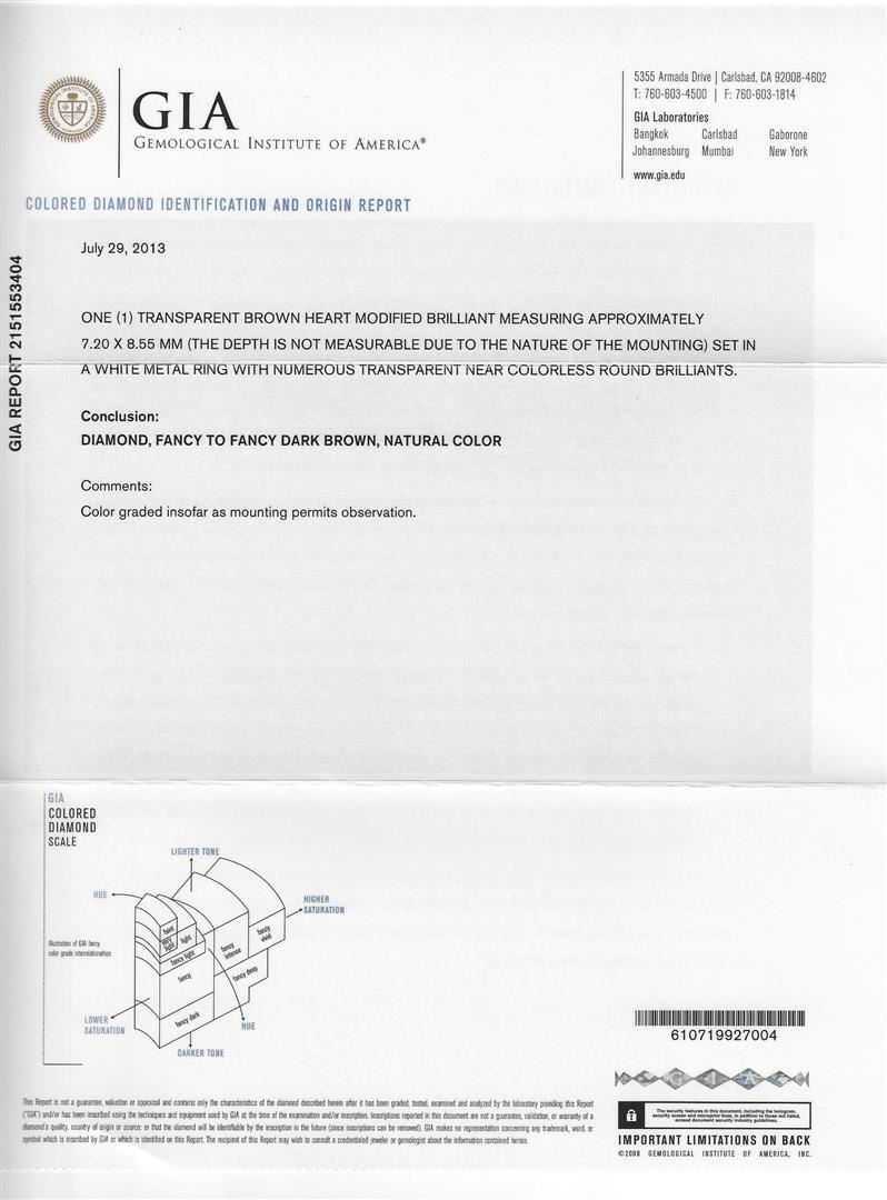 One ring featuring: 18KT white gold weighing 5.78 grams containing one fancy brown diamond center with a total weight of 1.92ct and round diamonds with a total weight of 0.77ct. GIA Appraised.
