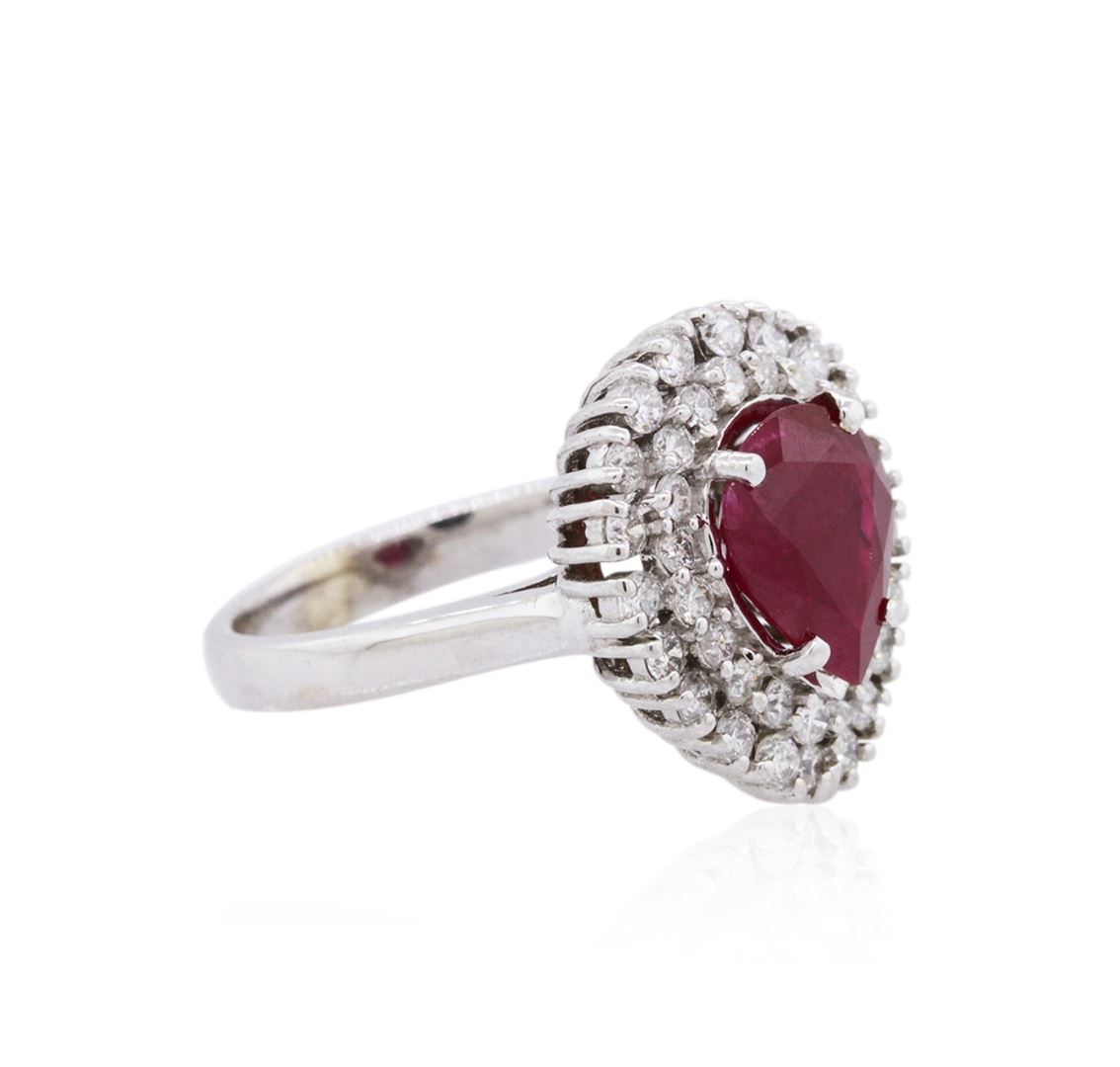 One electronically tested 18KT white gold ladies cast ruby and diamond ring with a bright polish finish. The featured ruby is set within two tiered diamond bezels, completed by a two and one-half millimeter wide band. Identified with markings of "18K". Condition is new, good workmanship. Containing: One prong set pear mixed cut natural ruby, measuring 9.76 x 8.03 x 4.25mm, 6% bulge factor, approximate weight of 2.82ct., clarity is heavily included, type II, dark, very slightly brownish, slightly purplish red color, (GIA slpR 7/3), cut is good. Transmitting light somewhat diffusely, translucent. Naturally occurring internal & external characteristics are present. Indications of heating with significant residues in fissures. GIA Ruby Report attached. Graded in the GIA Laboratory, Report #2161650608.Thirty-Nine prong set round brilliant cut diamonds, measuring 1.90 - 1.80 x 1.11mm (depth est.) approximate total weight of 39 Stones = 1.00ct. Graded in the setting. Clarity: SI-2 to I-2. Color: G - I. Total Weight of Colored Stones 2.82ct. Total Weight of Diamonds 1.00ct. Total Weight of Ring 6.86 grams. AIG Appraised at $4,715.00.