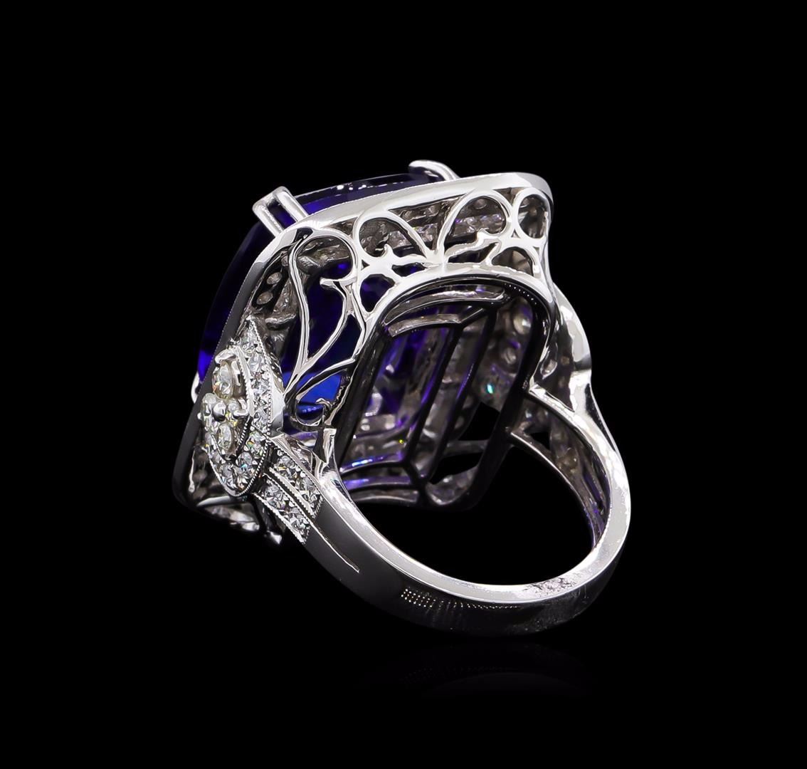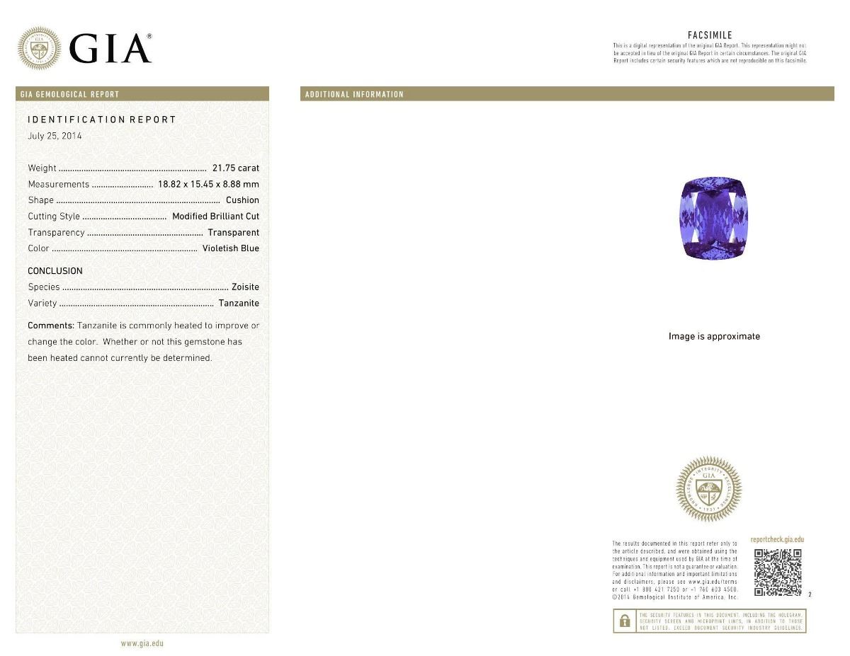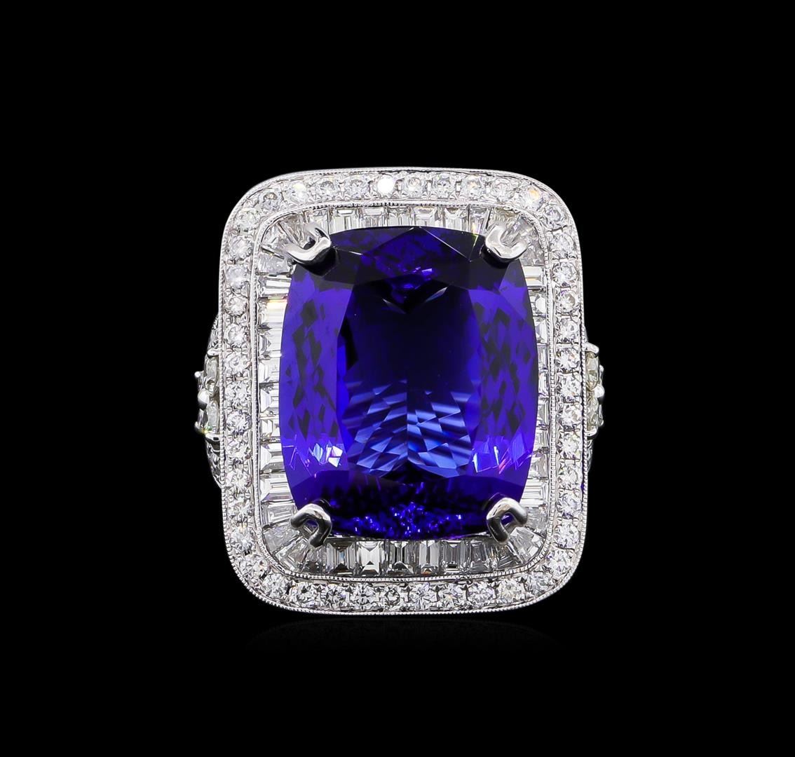 One electronically tested 18KT white gold ladies combination cast & assembled prong set ring with a flat shank with a bright polish finish. Identified with markings of "18K". Condition is new. Containing: One prong set rectangular cushion modified brilliant cut natural tanzanite, measuring 18.82 x 15.45 x 8.88mm, exact weight 21.75ct., clarity is eye clean, type I, medium dark, moderately strong, violetish blue color, (GIA vB 6/4), cut is very good. Graded loose prior to setting by GIA Gemological Laboratory, GIA Laboratory Report # 6167080562.Seventy-Eight prong set round brilliant cut diamonds, measuring 1.80 - 1.70 x 1.05mm (depth est.) approximate total weight of 78 Stones = 1.53ct. Clarity: SI-1 to I-1. Color: H - I, Cut is Good. Four prong set round brilliant cut diamonds, measuring 2.40 - 2.40 x 1.44mm (depth est.) approximate total weight of 4 Stones = 0.20ct. Clarity: SI-2. Color: J, Cut is Good. Twenty-Seven channel set baguette cut diamonds, measuring 2.50 x 1.80 x 1.53mm (depth est.) approximate total weight of 27 Stones = 1.70ct. Clarity: VS-1 to VS-2. Color: I, Cut is Good. Fifteen channel set baguette cut (tapered) diamonds, measuring from 1.80 x 1.10 x 0.94mm (depth est.) to 2.00 x 1.50 x 1.28mm (depth est.) approximate total weight of 15 Stones = 0.38ct. Clarity: VS-1 to VS-2. Color: I, Cut is Good. Colored gemstones are presumed to have been subjected to commonly used enhancement processes. All diamonds and colored gemstones are graded in the mounting, unless otherwise stated. Total Weight of Colored Stones 21.75ct. Total Weight of Diamonds 3.81ct. Total Weight of Ring 17.40 grams. GGL Appraised at $62,175.00.