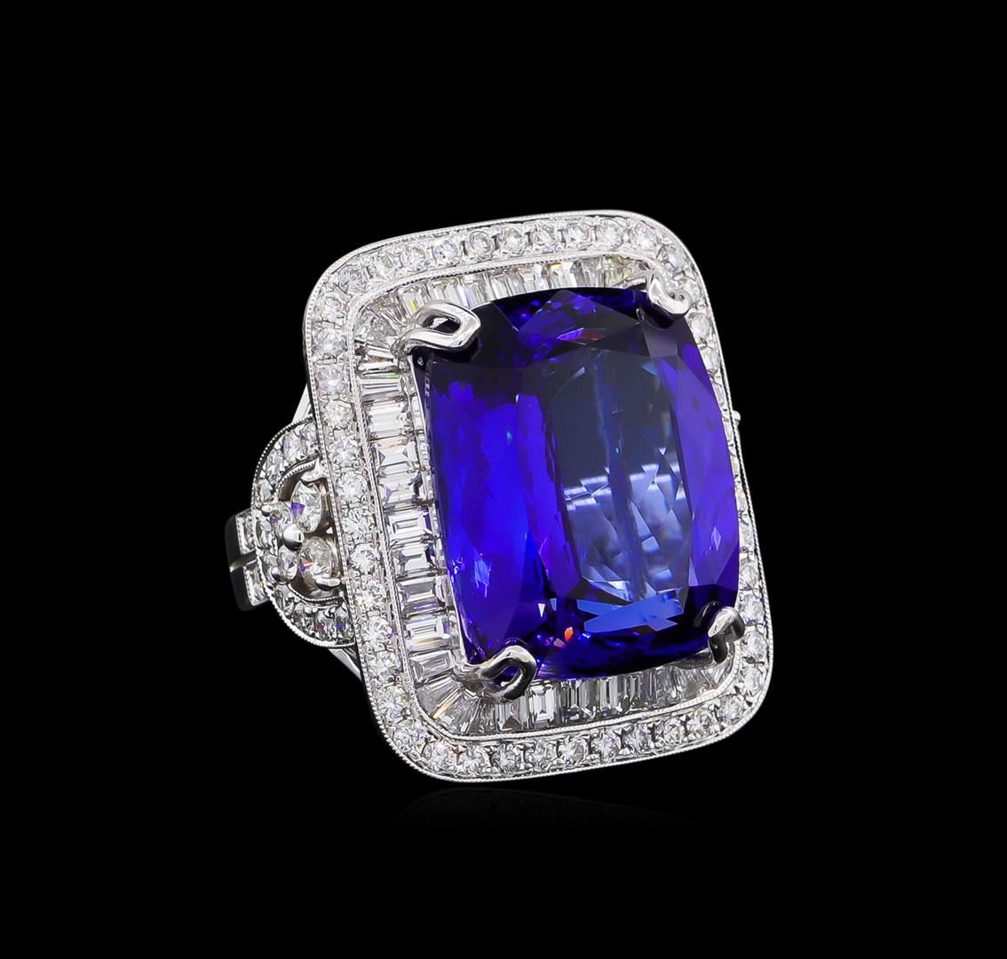 One electronically tested 18KT white gold ladies combination cast & assembled prong set ring with a flat shank with a bright polish finish. Identified with markings of "18K". Condition is new. Containing: One prong set rectangular cushion modified brilliant cut natural tanzanite, measuring 18.82 x 15.45 x 8.88mm, exact weight 21.75ct., clarity is eye clean, type I, medium dark, moderately strong, violetish blue color, (GIA vB 6/4), cut is very good. Graded loose prior to setting by GIA Gemological Laboratory, GIA Laboratory Report # 6167080562.Seventy-Eight prong set round brilliant cut diamonds, measuring 1.80 - 1.70 x 1.05mm (depth est.) approximate total weight of 78 Stones = 1.53ct. Clarity: SI-1 to I-1. Color: H - I, Cut is Good. Four prong set round brilliant cut diamonds, measuring 2.40 - 2.40 x 1.44mm (depth est.) approximate total weight of 4 Stones = 0.20ct. Clarity: SI-2. Color: J, Cut is Good. Twenty-Seven channel set baguette cut diamonds, measuring 2.50 x 1.80 x 1.53mm (depth est.) approximate total weight of 27 Stones = 1.70ct. Clarity: VS-1 to VS-2. Color: I, Cut is Good. Fifteen channel set baguette cut (tapered) diamonds, measuring from 1.80 x 1.10 x 0.94mm (depth est.) to 2.00 x 1.50 x 1.28mm (depth est.) approximate total weight of 15 Stones = 0.38ct. Clarity: VS-1 to VS-2. Color: I, Cut is Good. Colored gemstones are presumed to have been subjected to commonly used enhancement processes. All diamonds and colored gemstones are graded in the mounting, unless otherwise stated. Total Weight of Colored Stones 21.75ct. Total Weight of Diamonds 3.81ct. Total Weight of Ring 17.40 grams. GGL Appraised at $62,175.00.