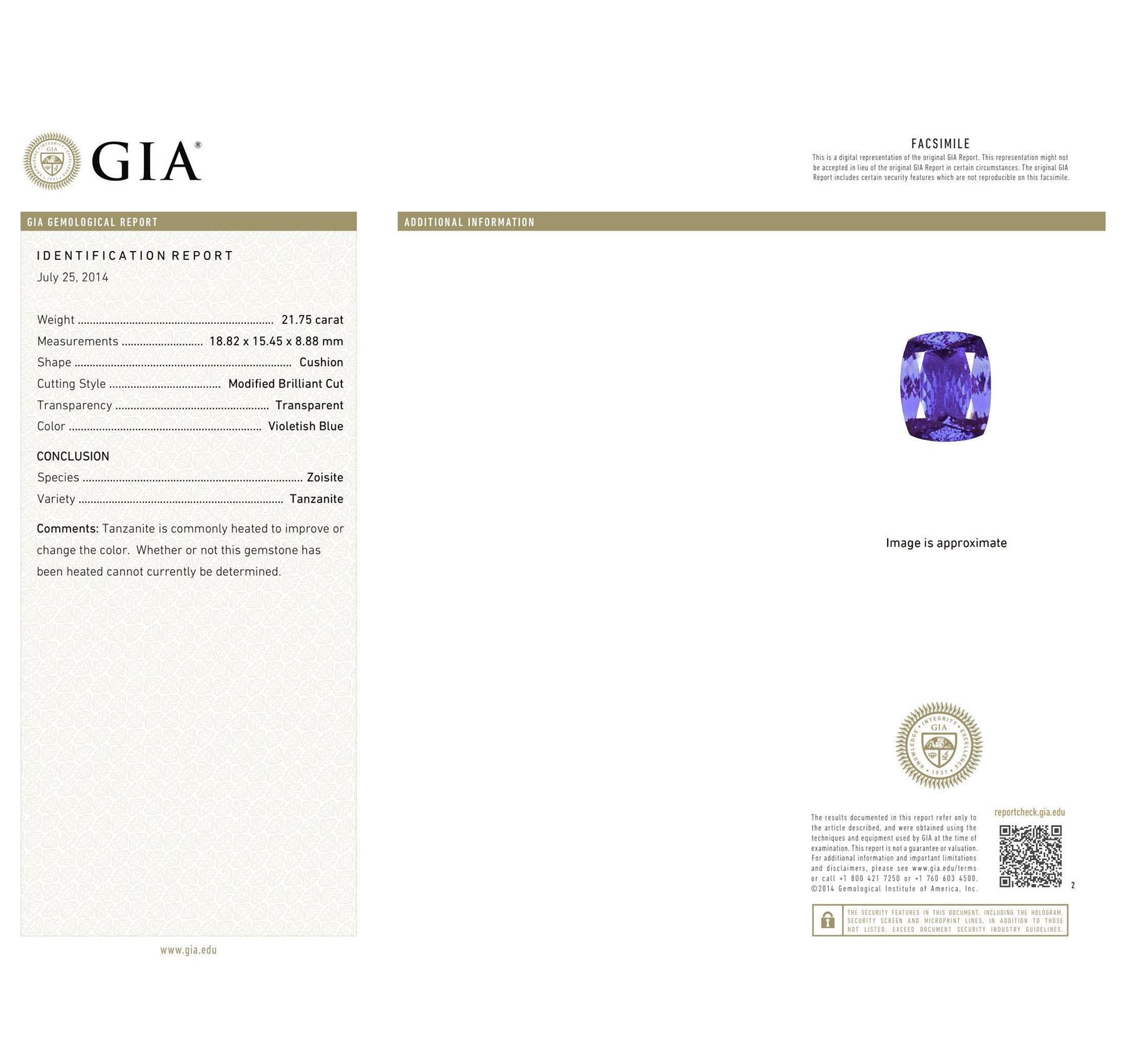 One electronically tested 18KT white gold ladies combination cast & assembled prong set ring with a flat shank with a bright polish finish. Identified with markings of "18K". Condition is new. Containing: One prong set rectangular cushion modified brilliant cut natural tanzanite, measuring 18.82 x 15.45 x 8.88mm, exact weight 21.75ct., clarity is eye clean, type I, medium dark, moderately strong, violetish blue color, (GIA vB 6/4), cut is very good. Graded loose prior to setting by GIA Gemological Laboratory, GIA Laboratory Report # 6167080562.Seventy-Eight prong set round brilliant cut diamonds, measuring 1.80 - 1.70 x 1.05mm (depth est.) approximate total weight of 78 Stones = 1.53ct. Clarity: SI-1 to I-1. Color: H - I, Cut is Good. Four prong set round brilliant cut diamonds, measuring 2.40 - 2.40 x 1.44mm (depth est.) approximate total weight of 4 Stones = 0.20ct. Clarity: SI-2. Color: J, Cut is Good. Twenty-Seven channel set baguette cut diamonds, measuring 2.50 x 1.80 x 1.53mm (depth est.) approximate total weight of 27 Stones = 1.70ct. Clarity: VS-1 to VS-2. Color: I, Cut is Good. Fifteen channel set baguette cut (tapered) diamonds, measuring from 1.80 x 1.10 x 0.94mm (depth est.) to 2.00 x 1.50 x 1.28mm (depth est.) approximate total weight of 15 Stones = 0.38ct. Clarity: VS-1 to VS-2. Color: I, Cut is Good. Colored gemstones are presumed to have been subjected to commonly used enhancement processes. All diamonds and colored gemstones are graded in the mounting, unless otherwise stated. Total Weight of Colored Stones 21.75ct. Total Weight of Diamonds 3.81ct. Total Weight of Ring 17.40 grams. GGL Appraised at $62,175.00.