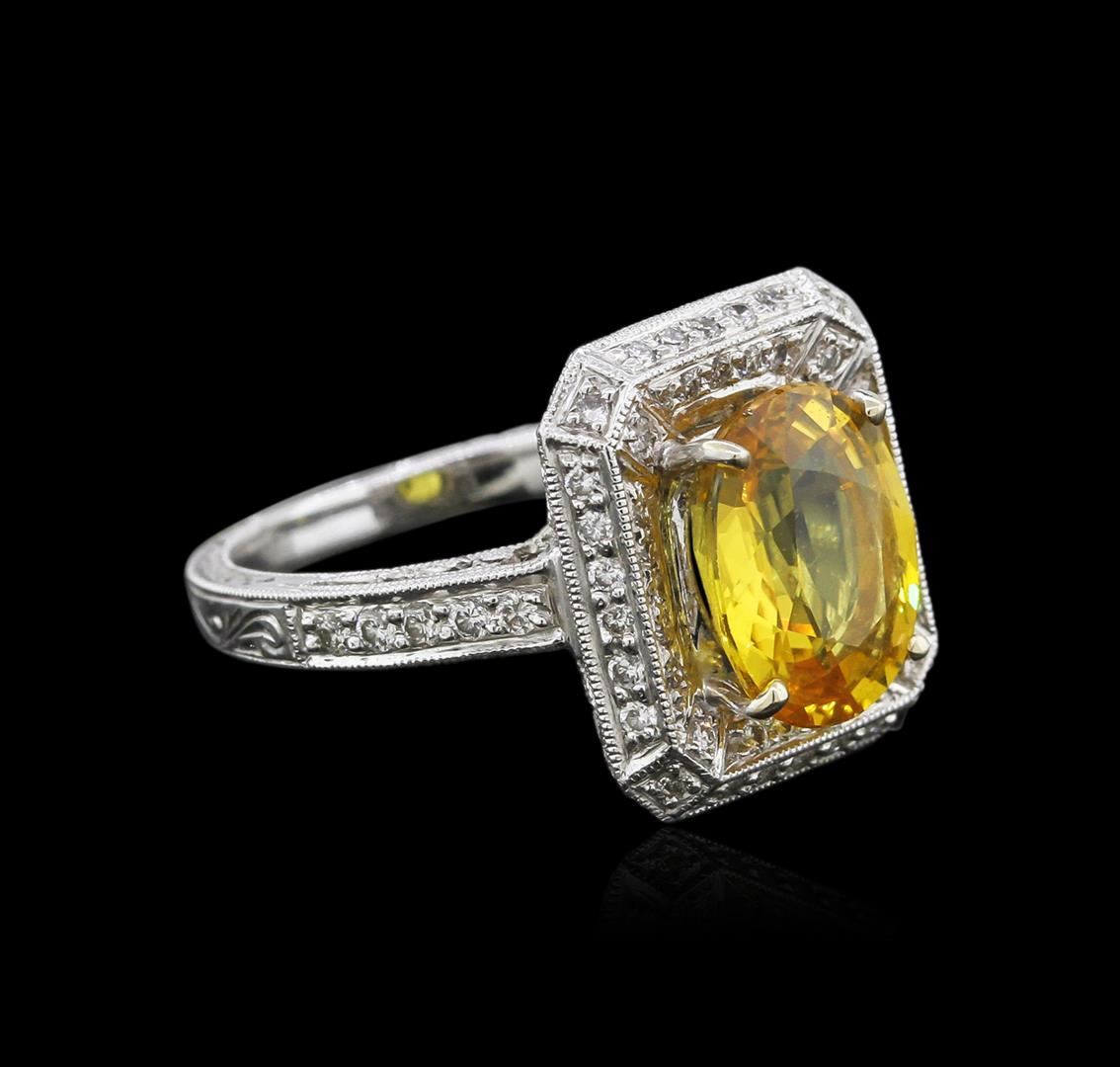 One electronically tested 18KT white gold ladies cast sapphire and diamond ring with a engraved finish. Identified with markings of "18K". Condition is new. Containing: One prong set oval modified brilliant cut natural yellow sapphire, measuring 10.79 x 8.46 x 4.88mm, approximate weight of 3.74ct., clarity is eye clean, type II, medium light, brownish, yellow color, (GIA Y 4/3), cut is good. GIA report: 2161764598.Sixty-Four prong set round brilliant cut diamonds, measuring 1.30 - 1.30 x 0.78mm (depth est.) approximate total weight of 64 Stones = 0.51ct. Clarity: SI-1 to SI-2. Color: I - J, Cut is Good. Colored gemstones are presumed to have been subjected to commonly used enhancement processes. All diamonds and colored gemstones are graded in the mounting, unless otherwise stated. Total Weight of Colored Stones 3.74ct. Total Weight of Diamonds 0.51ct. Total Weight of Ring 6.90 grams. GGL Appraised at $5,570.00.