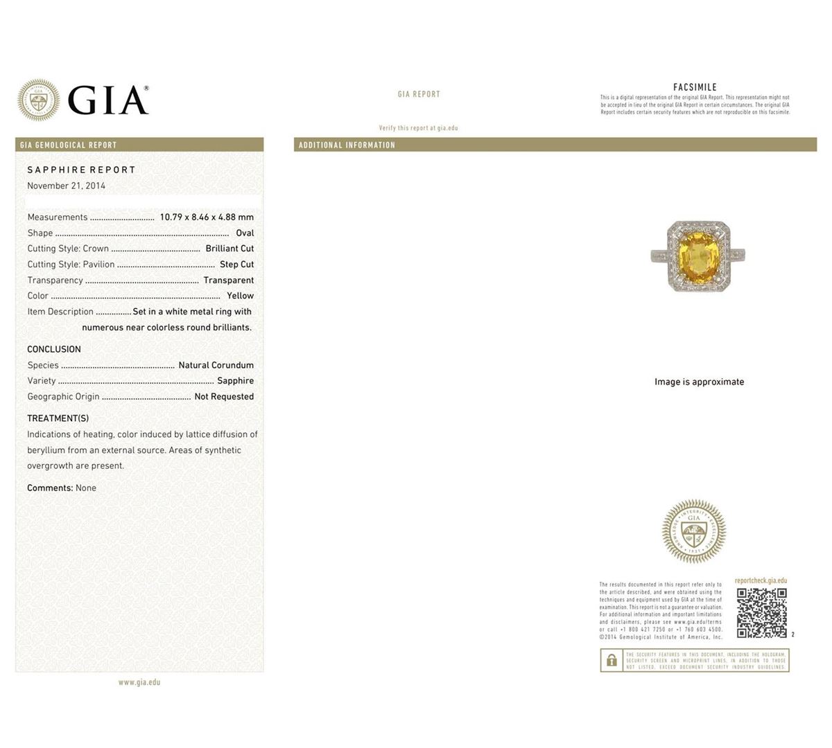 One electronically tested 18KT white gold ladies cast sapphire and diamond ring with a engraved finish. Identified with markings of "18K". Condition is new. Containing: One prong set oval modified brilliant cut natural yellow sapphire, measuring 10.79 x 8.46 x 4.88mm, approximate weight of 3.74ct., clarity is eye clean, type II, medium light, brownish, yellow color, (GIA Y 4/3), cut is good. GIA report: 2161764598.Sixty-Four prong set round brilliant cut diamonds, measuring 1.30 - 1.30 x 0.78mm (depth est.) approximate total weight of 64 Stones = 0.51ct. Clarity: SI-1 to SI-2. Color: I - J, Cut is Good. Colored gemstones are presumed to have been subjected to commonly used enhancement processes. All diamonds and colored gemstones are graded in the mounting, unless otherwise stated. Total Weight of Colored Stones 3.74ct. Total Weight of Diamonds 0.51ct. Total Weight of Ring 6.90 grams. GGL Appraised at $5,570.00.
