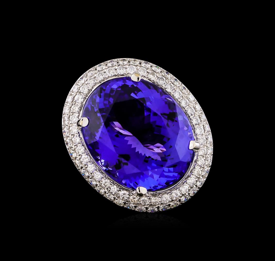 One electronically tested 18KT white gold ladies cast tanzanite and diamond ring. The featured tanzanite is set within a tiered diamond bezel supported by intertwining shoulders, completed by a two and one-half millimeter wide band. Bright polish finish with milgrain detailing. Trademark is UCG. Identified with markings of "18K 750". Containing: One prong set oval modified brilliant cut natural tanzanite, measuring 21.30 x 17.40 x 11.32mm, exact weight 30.19ct., clarity is eye clean, type I, medium dark, moderately strong, bluish violet color, (GIA bV 6/4), cut is good. Transmitting light with no distortion, transparent. GIA Gemological Report attached. Graded loose prior to setting in the GIA Laboratory, Report #2161211925.Tanzanite is a very rare gemstone that is only found in the country of Tanzania. Originally discovered in 1967. Tiffany & Company, named the stone Tanzanite. It is found in the Usumburu Mountains that border the Umba Valley of northern Tanzania. Tanzanite occurs in gray, brown, violet, blue, reddish-purple, & green. The gem is interesting because of its exceptional pleochroism. Rotated in different directions a tanzanite will exhibit multiple changes of color. Tanzanite has a low tolerance to ultrasonic cleaning, and should not be cleaned using this method. Seventy-Eight prong set round brilliant cut diamonds, measuring 1.60 - 1.60 x 0.96mm (depth est.) approximate total weight of 78 Stones = 1.26ct. Graded in the setting. Clarity: SI-1 to I-1 . Color: G - I. Total Weight of Colored Stones 30.19ct. Total Weight of Diamonds 1.26ct. Total Weight of Ring 16.30 grams. AIG Appraised.