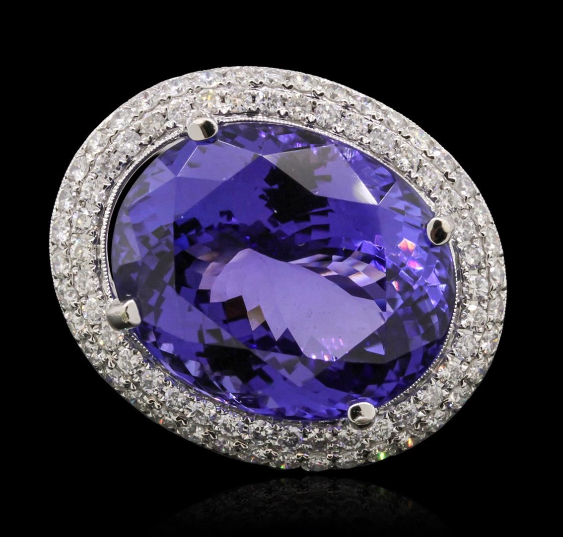One electronically tested 18KT white gold ladies cast tanzanite and diamond ring. The featured tanzanite is set within a tiered diamond bezel supported by intertwining shoulders, completed by a two and one-half millimeter wide band. Bright polish finish with milgrain detailing. Trademark is UCG. Identified with markings of "18K 750". Containing: One prong set oval modified brilliant cut natural tanzanite, measuring 21.30 x 17.40 x 11.32mm, exact weight 30.19ct., clarity is eye clean, type I, medium dark, moderately strong, bluish violet color, (GIA bV 6/4), cut is good. Transmitting light with no distortion, transparent. GIA Gemological Report attached. Graded loose prior to setting in the GIA Laboratory, Report #2161211925.Tanzanite is a very rare gemstone that is only found in the country of Tanzania. Originally discovered in 1967. Tiffany & Company, named the stone Tanzanite. It is found in the Usumburu Mountains that border the Umba Valley of northern Tanzania. Tanzanite occurs in gray, brown, violet, blue, reddish-purple, & green. The gem is interesting because of its exceptional pleochroism. Rotated in different directions a tanzanite will exhibit multiple changes of color. Tanzanite has a low tolerance to ultrasonic cleaning, and should not be cleaned using this method. Seventy-Eight prong set round brilliant cut diamonds, measuring 1.60 - 1.60 x 0.96mm (depth est.) approximate total weight of 78 Stones = 1.26ct. Graded in the setting. Clarity: SI-1 to I-1 . Color: G - I. Total Weight of Colored Stones 30.19ct. Total Weight of Diamonds 1.26ct. Total Weight of Ring 16.30 grams. AIG Appraised at $82,275.00.