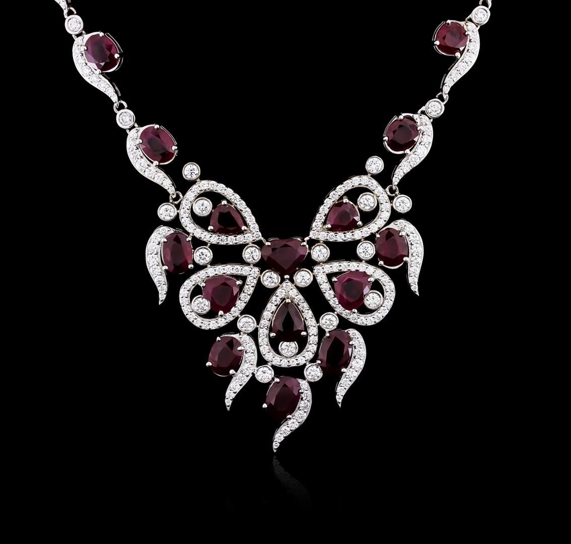 One 18KT white gold hand made necklace with a total weight of 55.19 grams containing: 25 natural rubies with a total weight of 31.20ct. Shape & measurement: Oval and pear shape. Quality: Fine natural burma ruby. GIA Certified # 6167920537. The necklace also features natural round cut diamonds with a total weight of 9.30ct. Quality: VS-SI clarity, G-H color.