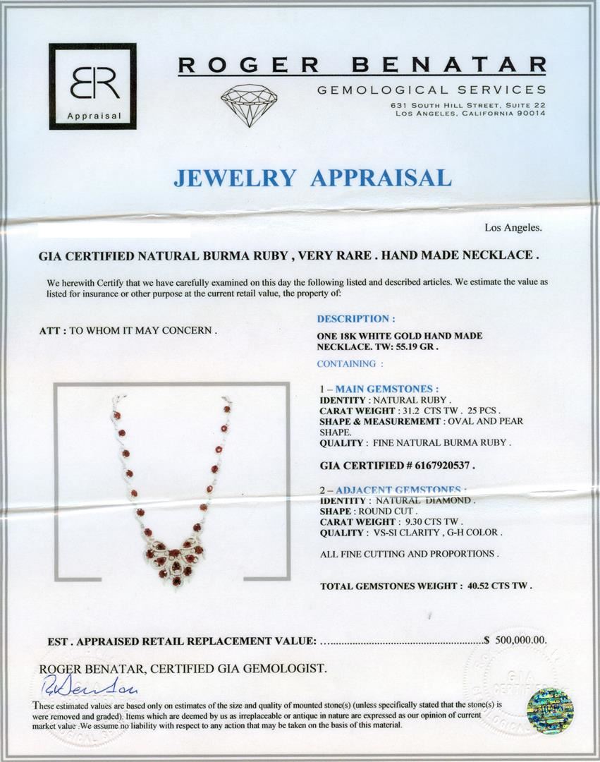One 18KT white gold hand made necklace with a total weight of 55.19 grams containing: 25 natural rubies with a total weight of 31.20ct. Shape & measurement: Oval and pear shape. Quality: Fine natural burma ruby. GIA Certified # 6167920537. The necklace also features natural round cut diamonds with a total weight of 9.30ct. Quality: VS-SI clarity, G-H color.