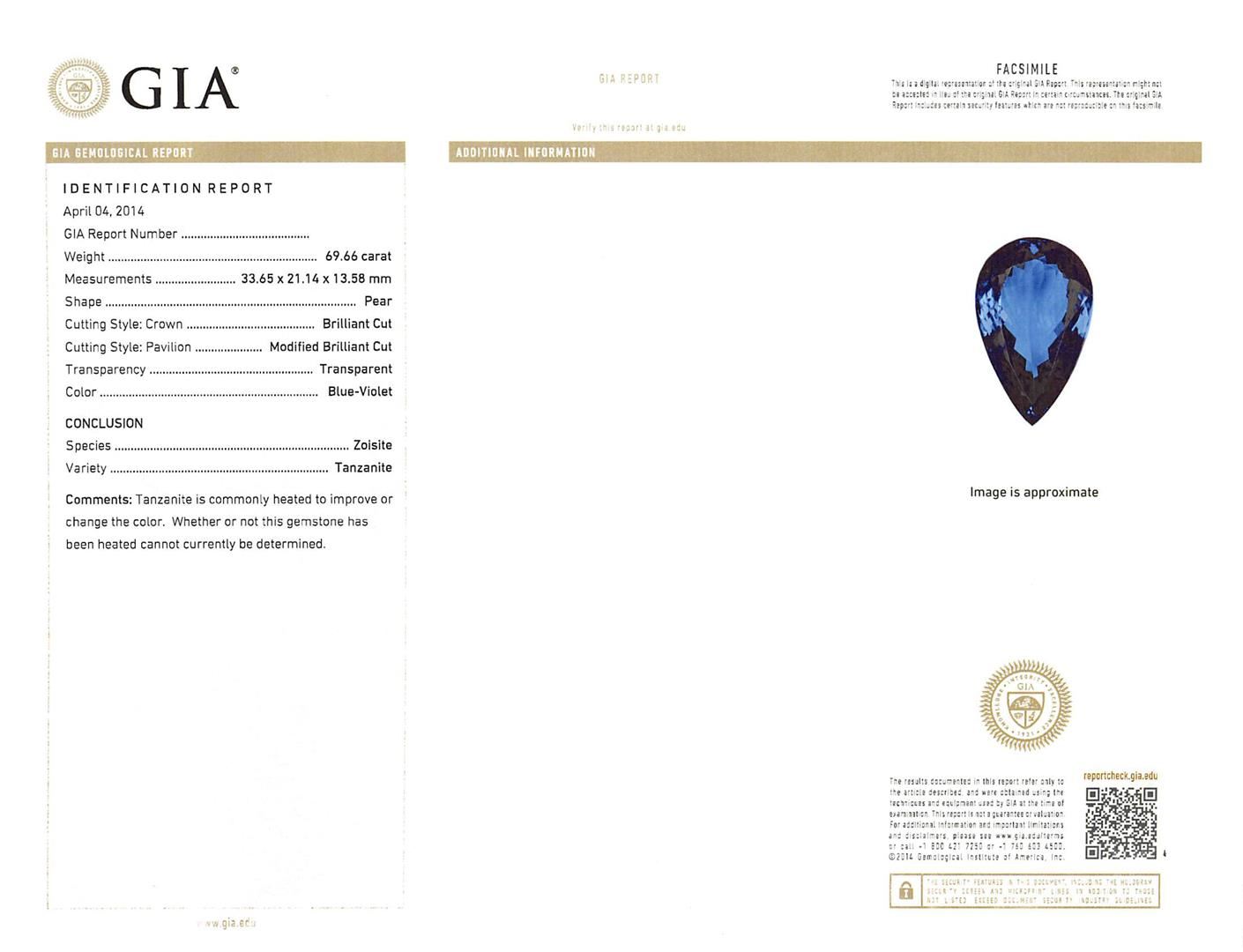 One electronically tested 18KT white gold ladies cast & assembled tanzanite and diamond pendant with chain. The pendant features a tanzanite set within an elaborate diamond lattice gallery, completed by a diamond set bail. The pendant is supported by an eighteen inch length 18KT white gold designer style chain, terminating in a lobster claw clasp. Bright polish finish with yellow gold accents and milgrain detailing. Trademark is UGG. Identified with markings of "18K 750". Condition is new, good workmanship. Containing: One prong set pear modified brilliant cut natural tanzanite, measuring 33.65 x 21.14 x 13.58mm, exact weight 69.66ct., type I Clarity is eye clean, dark, moderately strong, blue-violet color, (GIA BV), cut is good. Transmitting light with no distortion, transparent. GIA Gemological Report attached. Graded loose prior to setting in the GIA Laboratory, Report #6167000255.Tanzanite is a very rare gemstone that is only found in the country of Tanzania. Originally discovered in 1967. Tiffany & Company, named the stone Tanzanite. It is found in the Usumburu Mountains that border the Umba Valley of northern Tanzania. Tanzanite occurs in gray, brown, violet, blue, reddish-purple, & green. The gem is interesting because of its exceptional pleochroism. Rotated in different directions a tanzanite will exhibit multiple changes of color. Tanzanite has a low tolerance to ultrasonic cleaning, and should not be cleaned using this method. Thirty-Four bezel and prong set round brilliant cut diamonds, measuring 3.00 - 2.20 x 1.56mm (depth est.) approximate total weight of 34 Stones = 2.20ct. Graded in the setting. Clarity: VS-1 to SI-1. Color: G - I One Hundred Ninety-Three bezel and prong set round brilliant cut diamonds, measuring 1.80 - 1.40 x 0.96mm (depth est.) approximate total weight of 193 Stones = 2.97ct. Graded in the setting. Clarity: VS-1 to SI-1. Color: G - I One prong set baguette cut (tapered) diamond, measuring 4.70 x 2.10 x 1.47mm (depth est.) approximate weight of 0.13ct. Graded in the setting. Clarity: VS-1. Color: G. Total Weight of Colored Stones 69.66ct. Total Weight of Diamonds 5.30ct. Total Weight of Pendant With Chain 49.12 grams. AIG Appraised at $208,675.00.