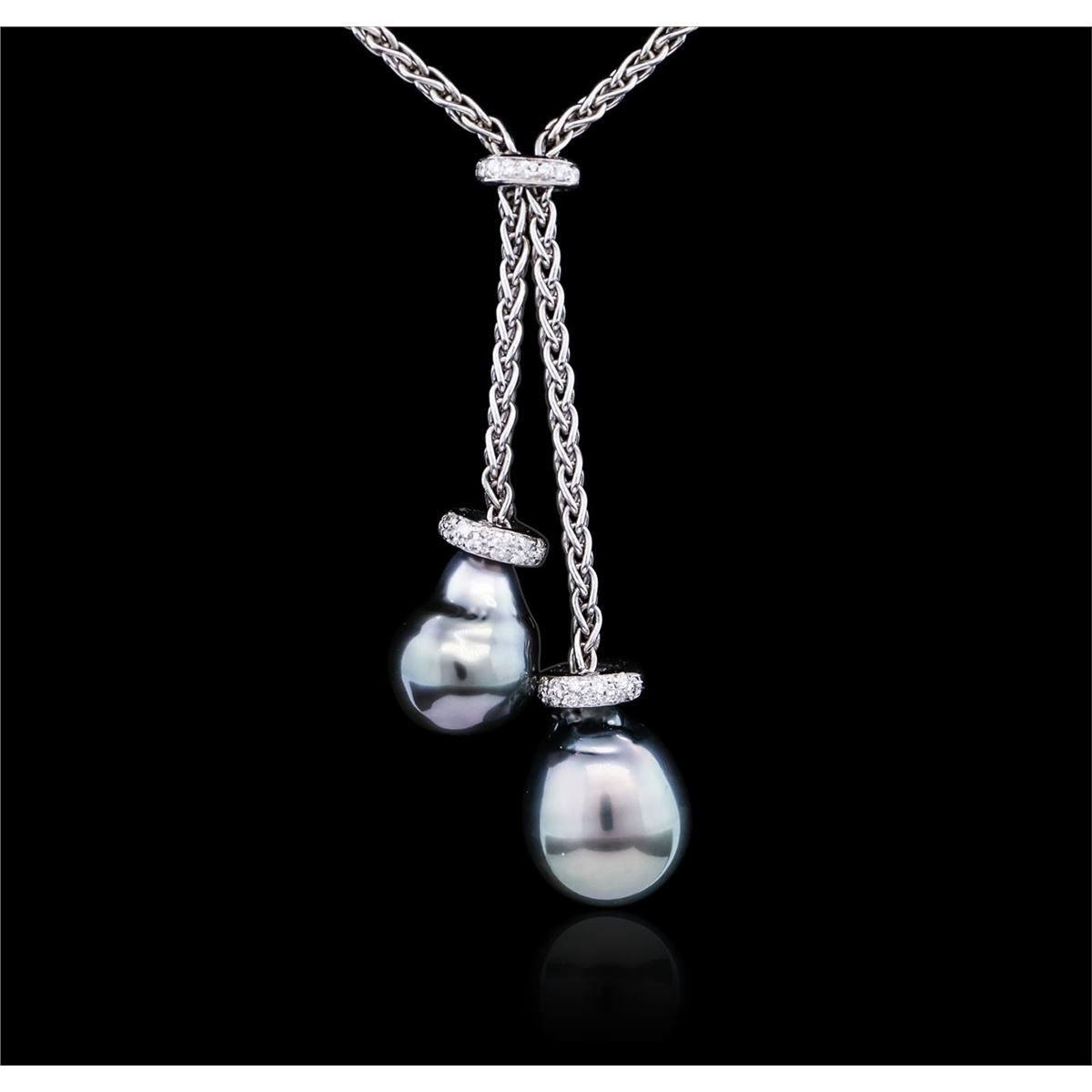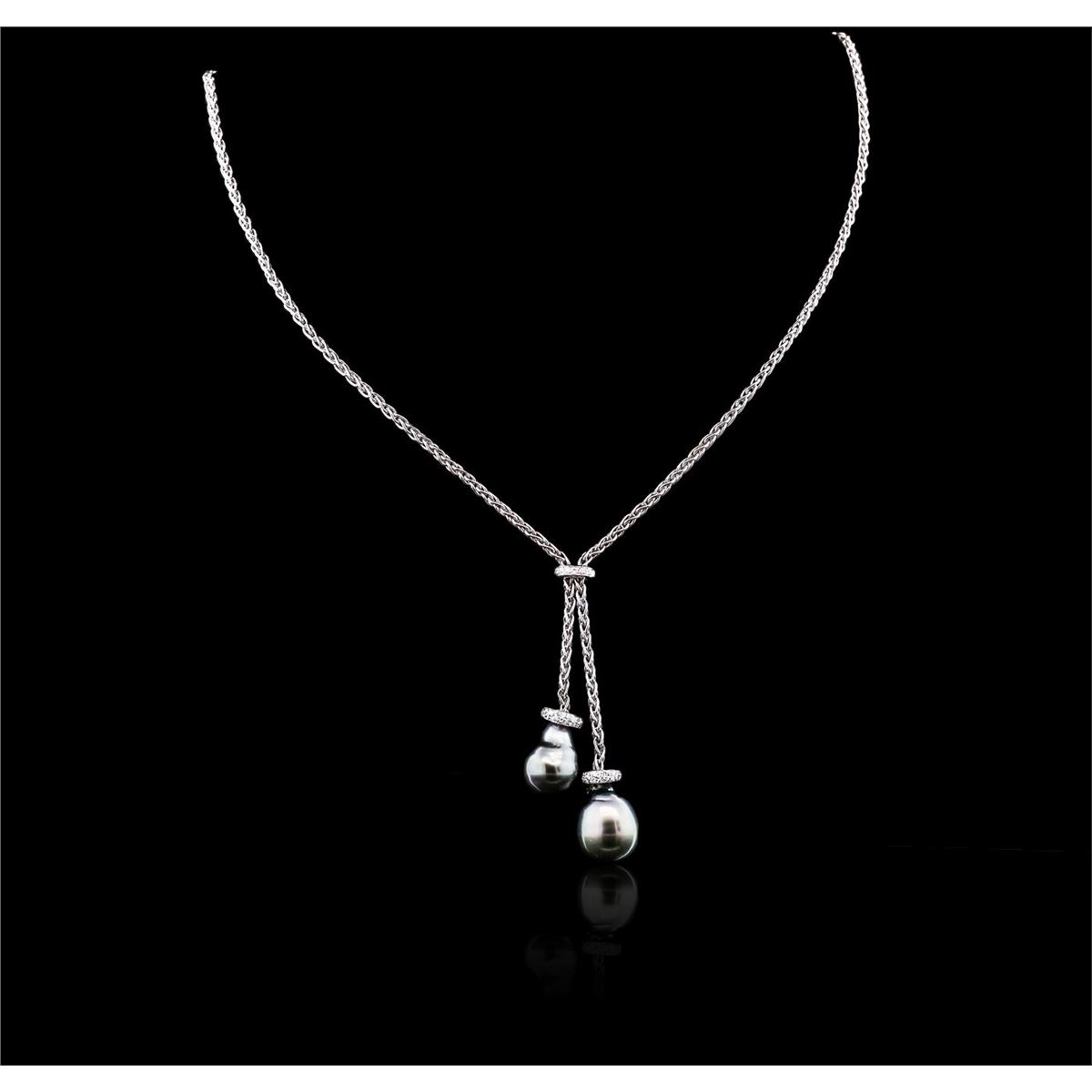 One electronically tested 18KT white gold ladies combination cast & assembled pearl and diamond necklace with a lobster claw clasp with a bright polish finish. Measurements: 16" in length Identified with markings of "750". Condition is new. Containing: Two Tahitian pearls, 10.8mm in size to 12.8mm in size. The pearls are silver in color with a good luster, off round, moderately blemished. Thirty-Three prong set round brilliant cut diamonds, measuring 1.20 - 1.20 x 0.72mm (depth est.) approximate total weight of 33 Stones = 0.21ct. Clarity: SI-2 to I-1. Color: H - I, Cut is Good. Colored gemstones are presumed to have been subjected to commonly used enhancement processes. All diamonds and colored gemstones are graded in the mounting, unless otherwise stated. Total Weight of Diamonds 0.21ct. Total Weight of Necklace 21.00 grams. GGL Appraised at $4,915.00.