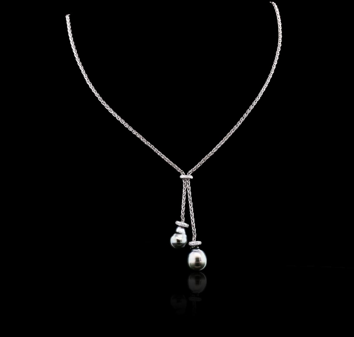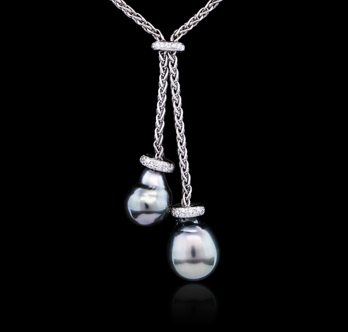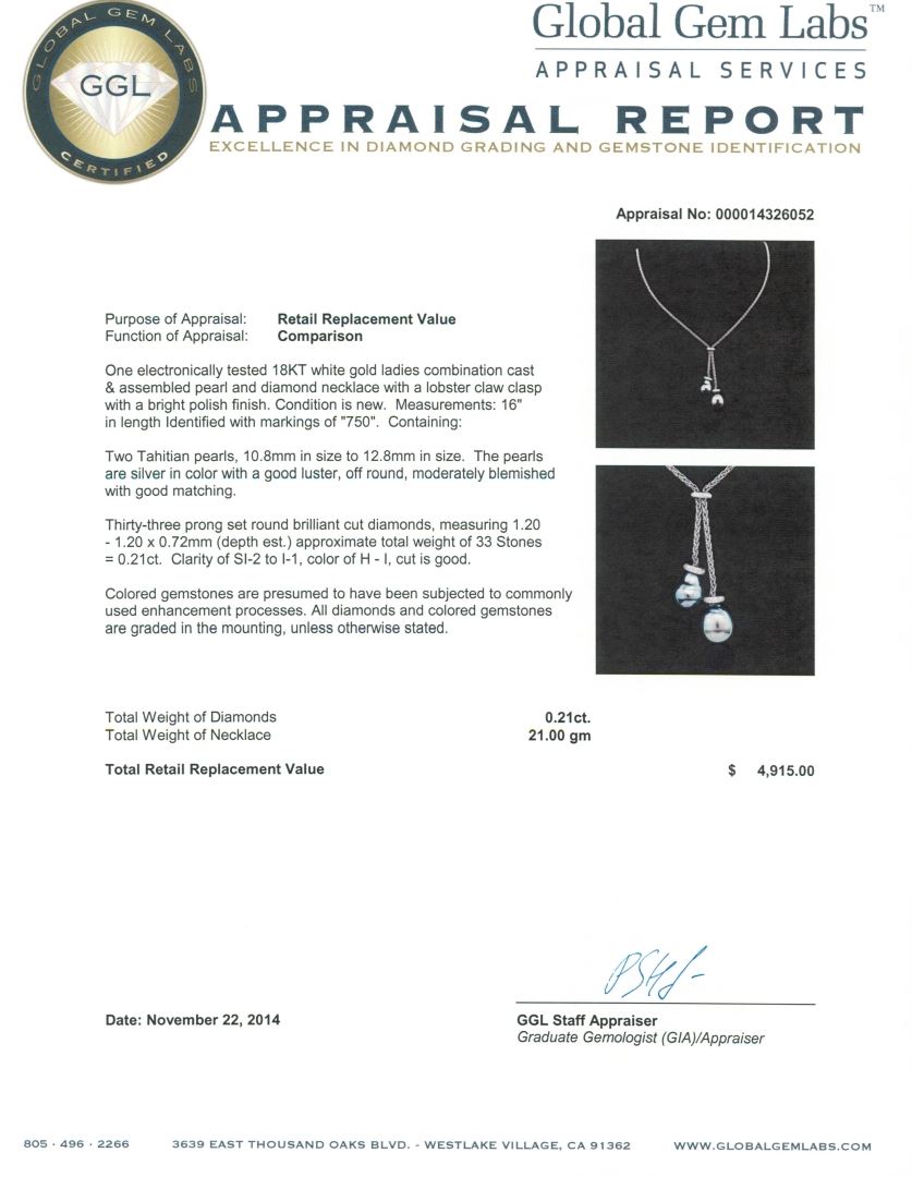 One electronically tested 18KT white gold ladies combination cast & assembled pearl and diamond necklace with a lobster claw clasp with a bright polish finish. Measurements: 16" in length Identified with markings of "750". Condition is new. Containing: Two Tahitian pearls, 10.8mm in size to 12.8mm in size. The pearls are silver in color with a good luster, off round, moderately blemished. Thirty-Three prong set round brilliant cut diamonds, measuring 1.20 - 1.20 x 0.72mm (depth est.) approximate total weight of 33 Stones = 0.21ct. Clarity: SI-2 to I-1. Color: H - I, Cut is Good. Colored gemstones are presumed to have been subjected to commonly used enhancement processes. All diamonds and colored gemstones are graded in the mounting, unless otherwise stated. Total Weight of Diamonds 0.21ct. Total Weight of Necklace 21.00 grams. GGL Appraised at $4,915.00.