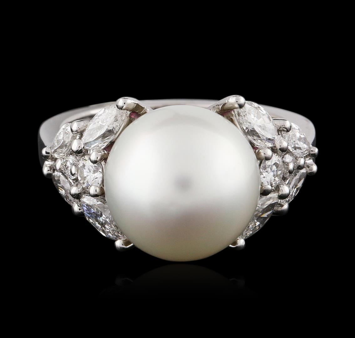 One electronically tested 18KT white gold ladies cast pearl and diamond ring with a bright polish finish. Identified with markings of "18K". Condition is new. Containing: One Chinese freshwater pearl, 10.9mm in size to 10.9mm in size. The pearl is white in color with a good luster, round, moderately blemished. Eight prong set marquise shaped cut diamonds, measuring 4.00. x 2.00. x 1.26mm (depth est.) approximate total weight of 8 Stones = 0.47ct. Clarity: SI-1. Color: I - J, Cut is Good. Four prong set round brilliant cut diamonds, measuring 2.20 - 1.50 x 1.11mm (depth est.) approximate total weight of 4 Stones = 0.09ct. Clarity: SI-1. Color: I - J, Cut is Good. Colored gemstones are presumed to have been subjected to commonly used enhancement processes. All diamonds and colored gemstones are graded in the mounting, unless otherwise stated. Total Weight of Diamonds 0.56ct. Total Weight of Ring 5.00. grams. GGL Appraised at $3,640.00.