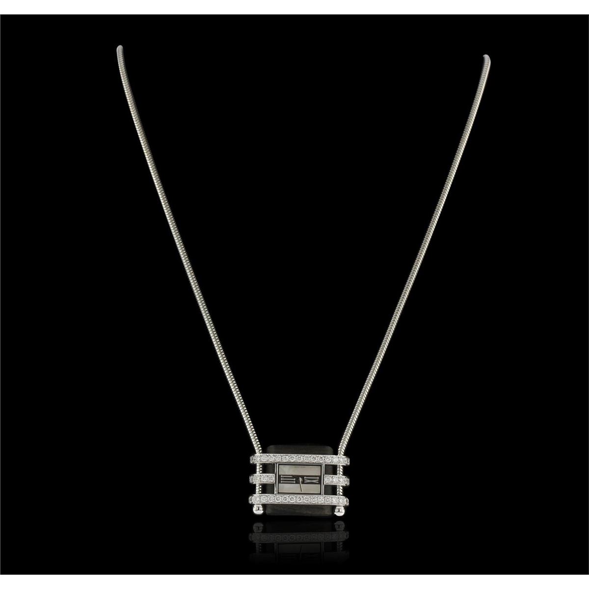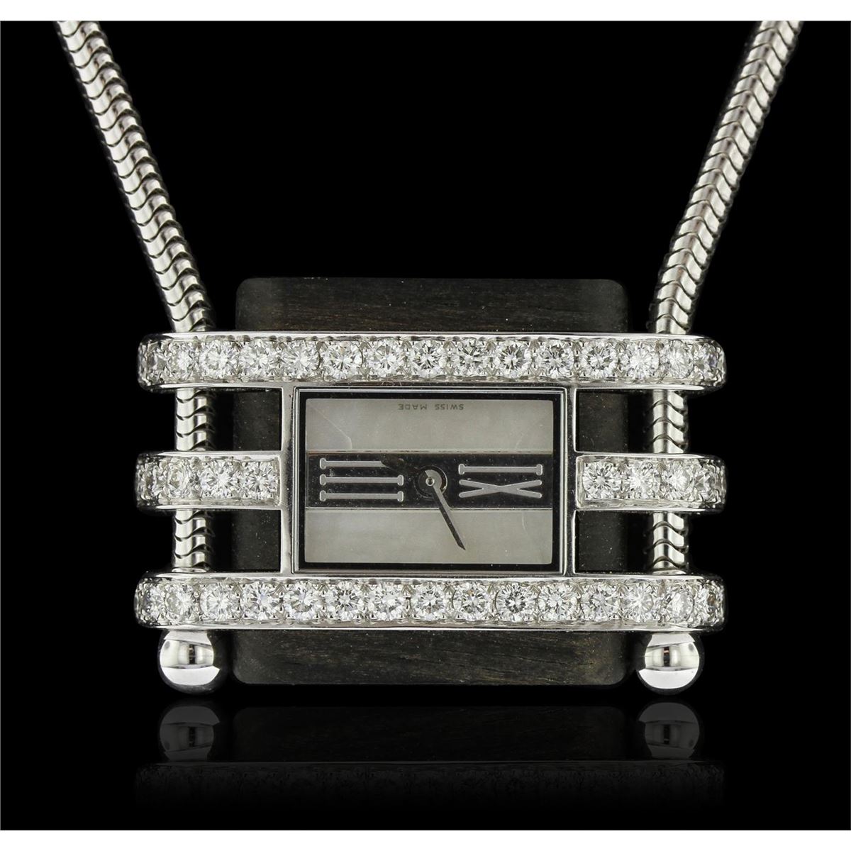 A unique style, this pendant is formed of a dark wood with white gold set diamond line designs framing a clock with a mother of pearl face. The unusual face has only a pair of numerals at 3 and 9 o' clock and is meant to be read upside down. This estate signed designer Van Cleef & Arpels diamond watch pendant is hung chatelaine style from a white gold snake chain. Hallmark: Van Cleef and Arpels France, 141826, Metal: 18K White gold, Gemstone: Diamond 1.50 carats, Design era: Contemporary, Circa: 2000, Measurements" Pendant: Approx. 7/8 Inch x 1 1/4 Inches, Weight: 50.9 grams