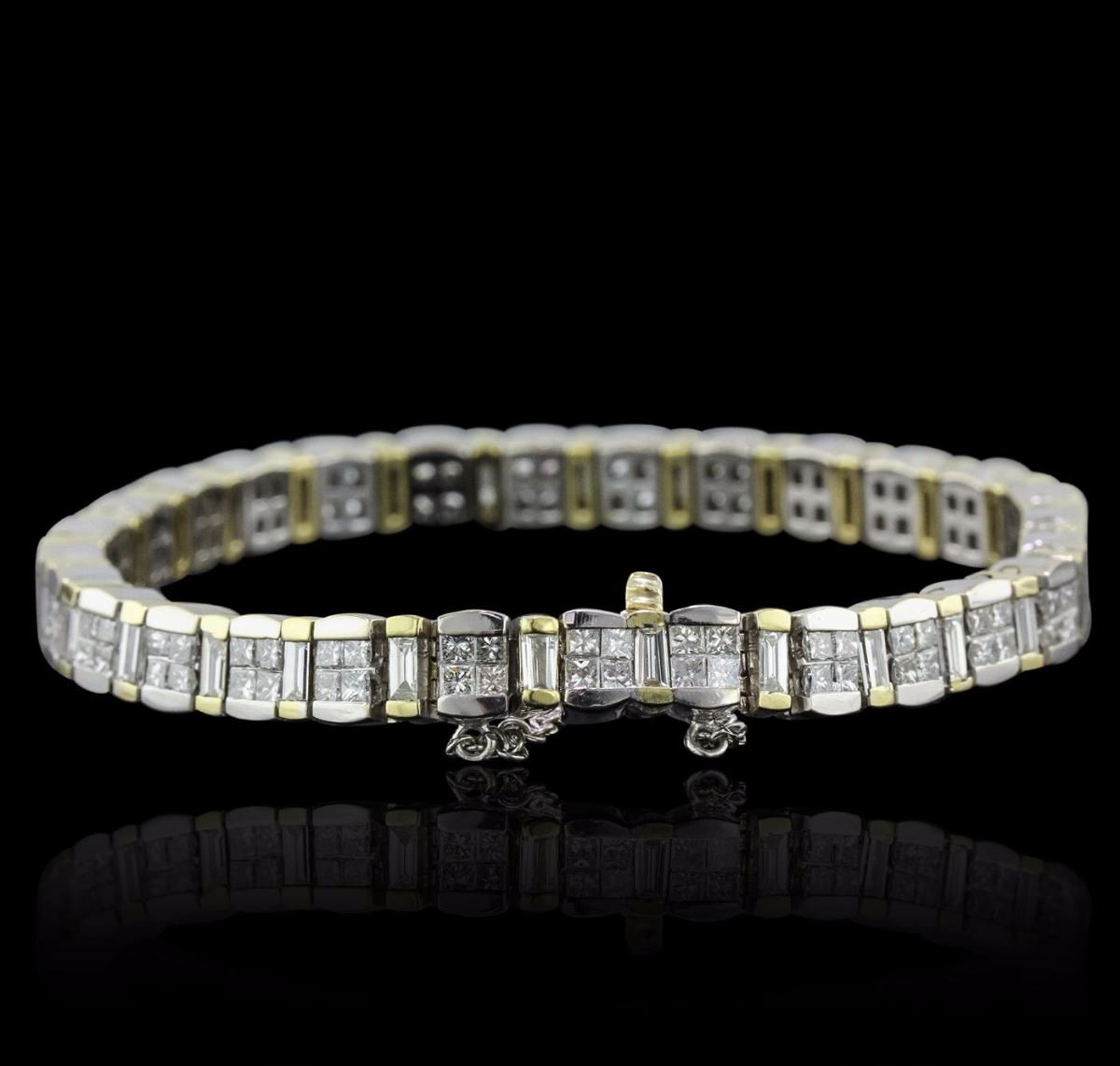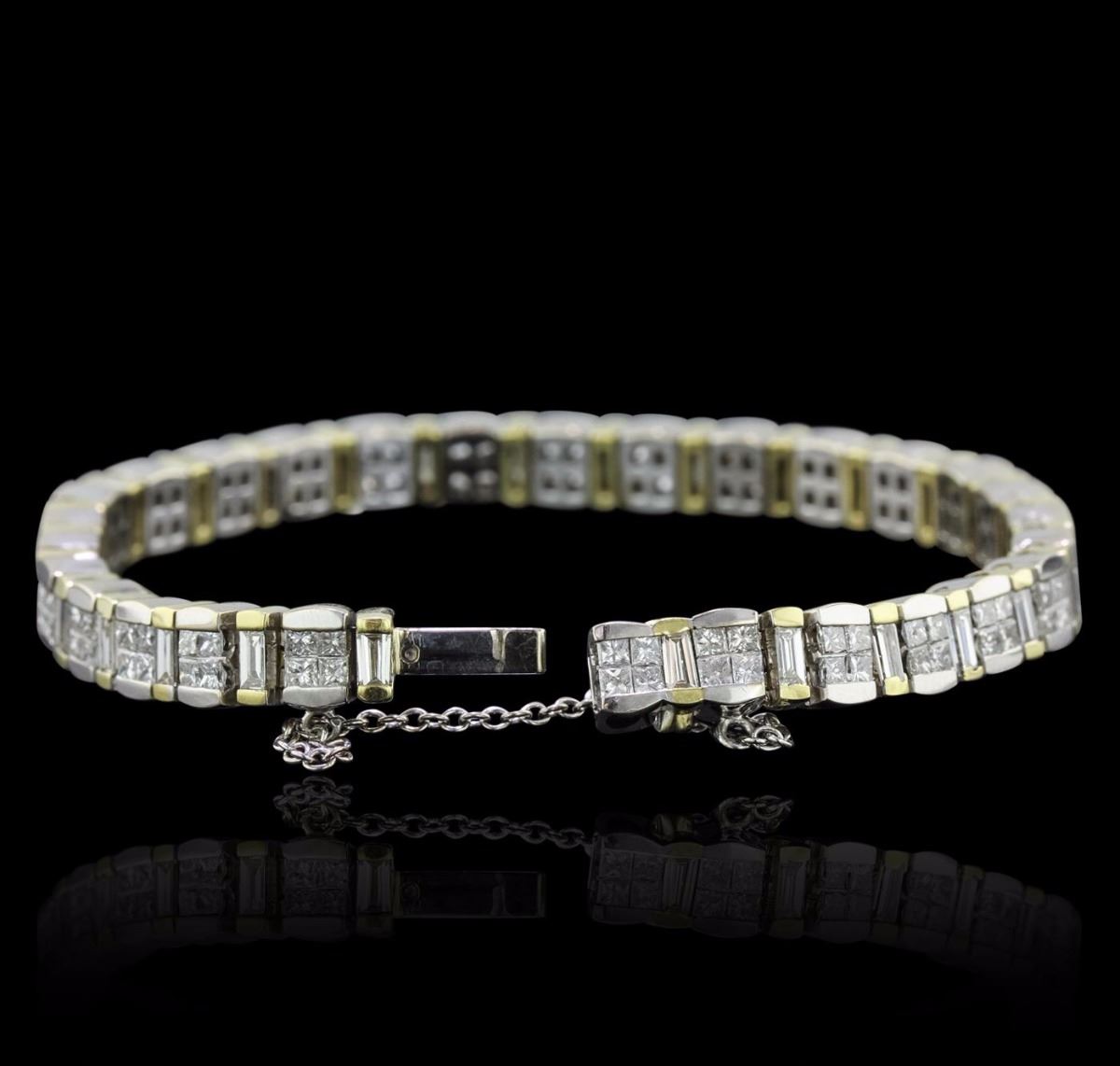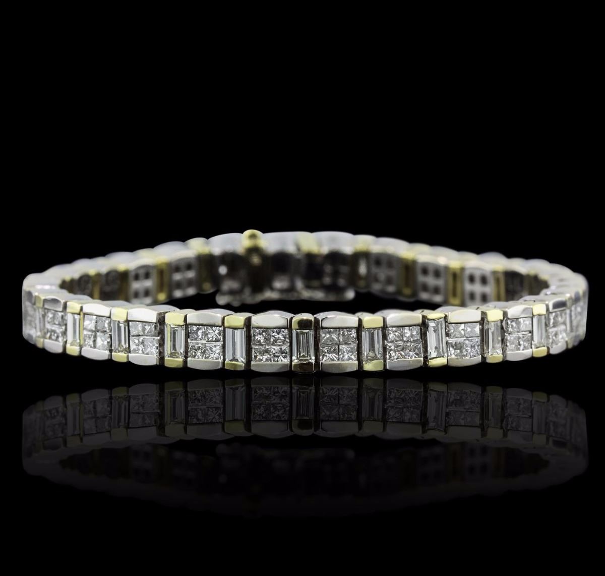 One electronically tested 18KT white and yellow gold ladies cast & assembled diamond bracelet. Condition is new, good workmanship. Seven and one-half inch length bracelet features a flexible diamond ribbon, terminating in a concealed clasp with safety bar and safety chain. Bright polish finish. Identified with markings of "18K". Containing: One Hundred Twelve channel and invisible set princess cut diamonds, measuring 2.00 x 1.90 x 1.43mm (depth est.) approximate. Total Weight of 112 Stones = 5.10ct. Graded in the setting. Clarity: SI-1 to I-1. Color: G - I Twenty-Eight channel set baguette cut diamonds, measuring from 4.10 x 1.80 x 1.26mm (depth est.) to 4.40 x 2.20 x 1.54mm (depth est.) approximate. Total Weight of 28 Stones = 3.05ct. Graded in the setting. Clarity: VVS-2 to VS-2. Color: G - I. Total Weight of Diamonds 8.15ct. Total Weight of Bracelet 35.75 grams. AIG Appraised at $31,145.00.