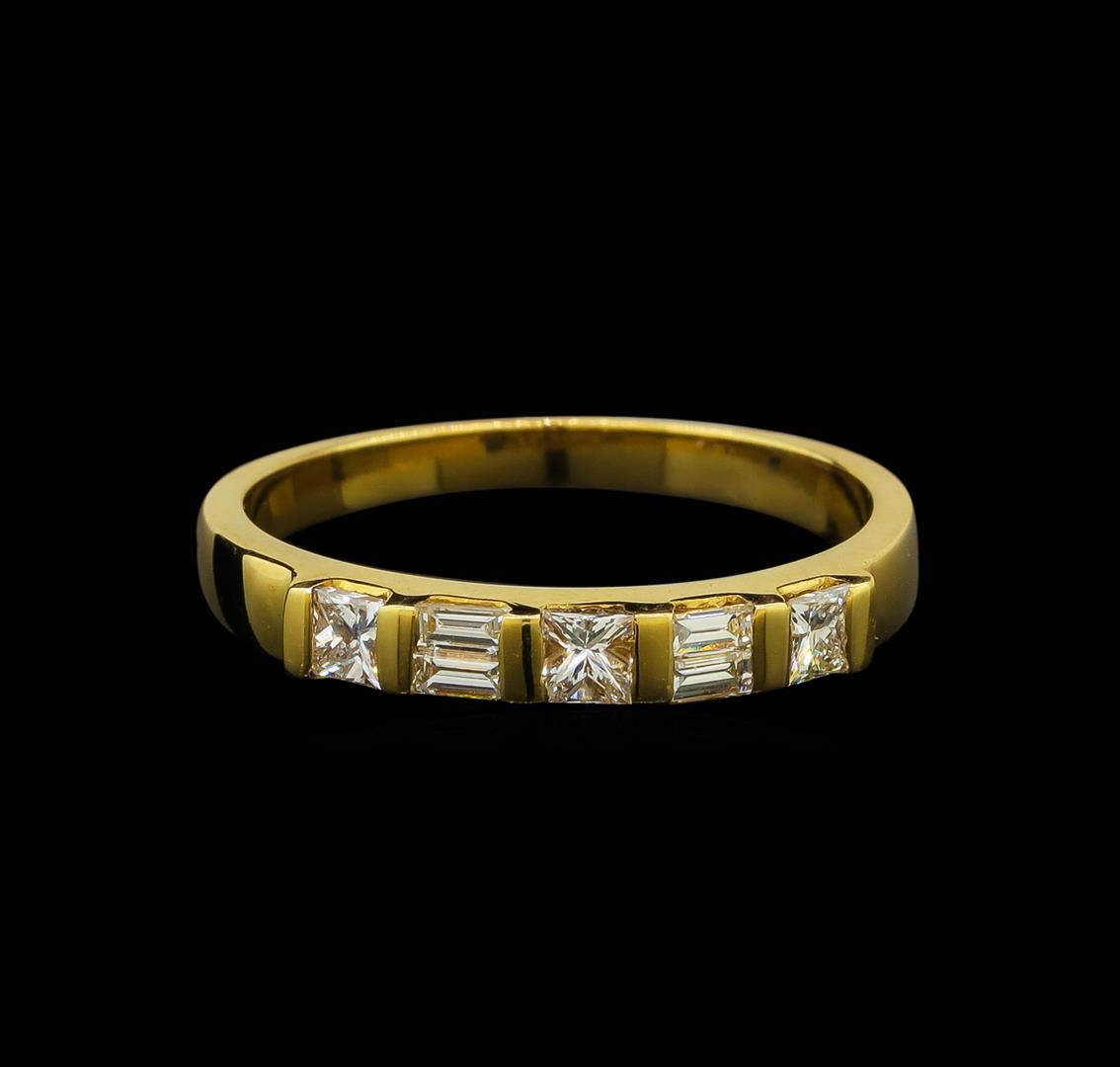One electronically tested 18KT yellow gold ladies cast diamond ring with a flat shank with rounded edges with a bright polish finish. Identified with markings of "18K". Condition is new. Containing: Three channel set princess cut diamonds, measuring 2.50 x 2.50 x 1.88mm (depth est.) approximate total weight of 3 Stones = 0.29ct. Clarity: VS-2. Color: I - J, Cut is Good. Four baguette cut diamonds, measuring 2.00 x 1.30 x 1.11mm (depth est.) approximate total weight of 4 Stones = 0.11ct. Diamonds are graded in the mounting, unless otherwise stated. Total Weight of Diamonds 0.40ct. Total Weight of Ring 3.10 grams. GGL Appraised at $1,620.00.