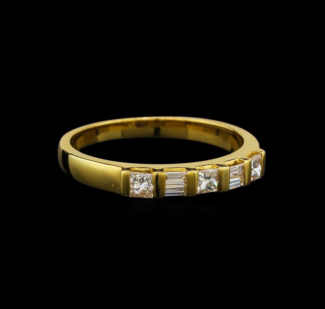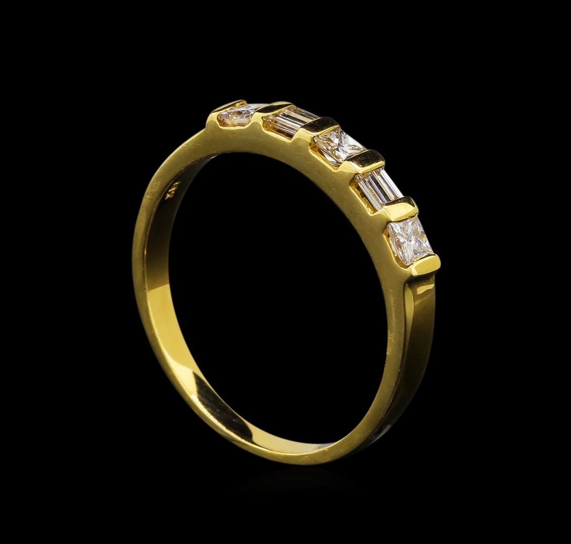 One electronically tested 18KT yellow gold ladies cast diamond ring with a flat shank with rounded edges with a bright polish finish. Identified with markings of "18K". Condition is new. Containing: Three channel set princess cut diamonds, measuring 2.50 x 2.50 x 1.88mm (depth est.) approximate total weight of 3 Stones = 0.29ct. Clarity: VS-2. Color: I - J, Cut is Good. Four baguette cut diamonds, measuring 2.00 x 1.30 x 1.11mm (depth est.) approximate total weight of 4 Stones = 0.11ct. Diamonds are graded in the mounting, unless otherwise stated. Total Weight of Diamonds 0.40ct. Total Weight of Ring 3.10 grams. GGL Appraised at $1,620.00.